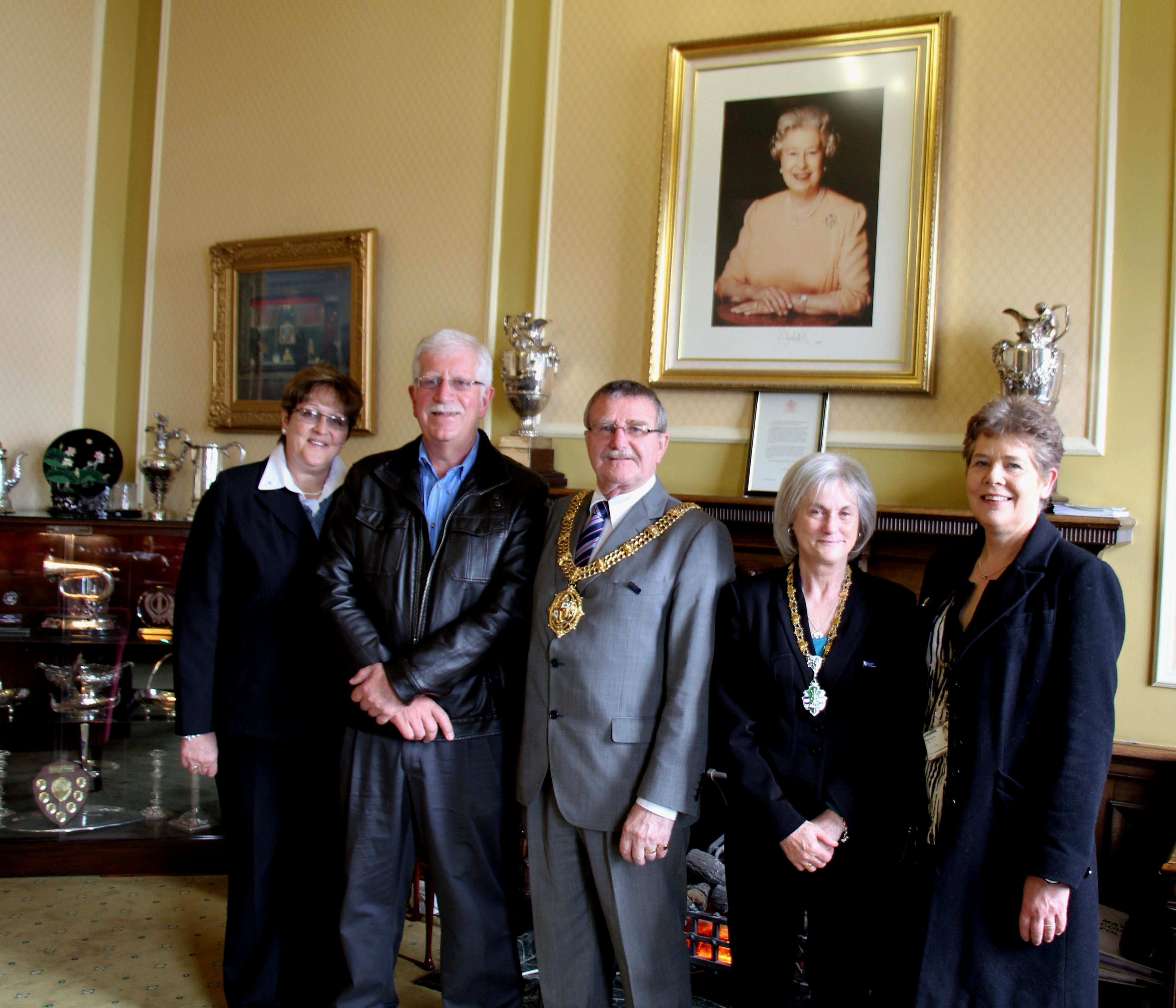 Foto 1: In die Burgemeesterskantoor, met vlnr Cormaré en Johan Pieterse, rdl Dave Mitchell (Burgemeester: Wirral) en sy eggenote en Chris Higgens (Toerisme: Wirral)