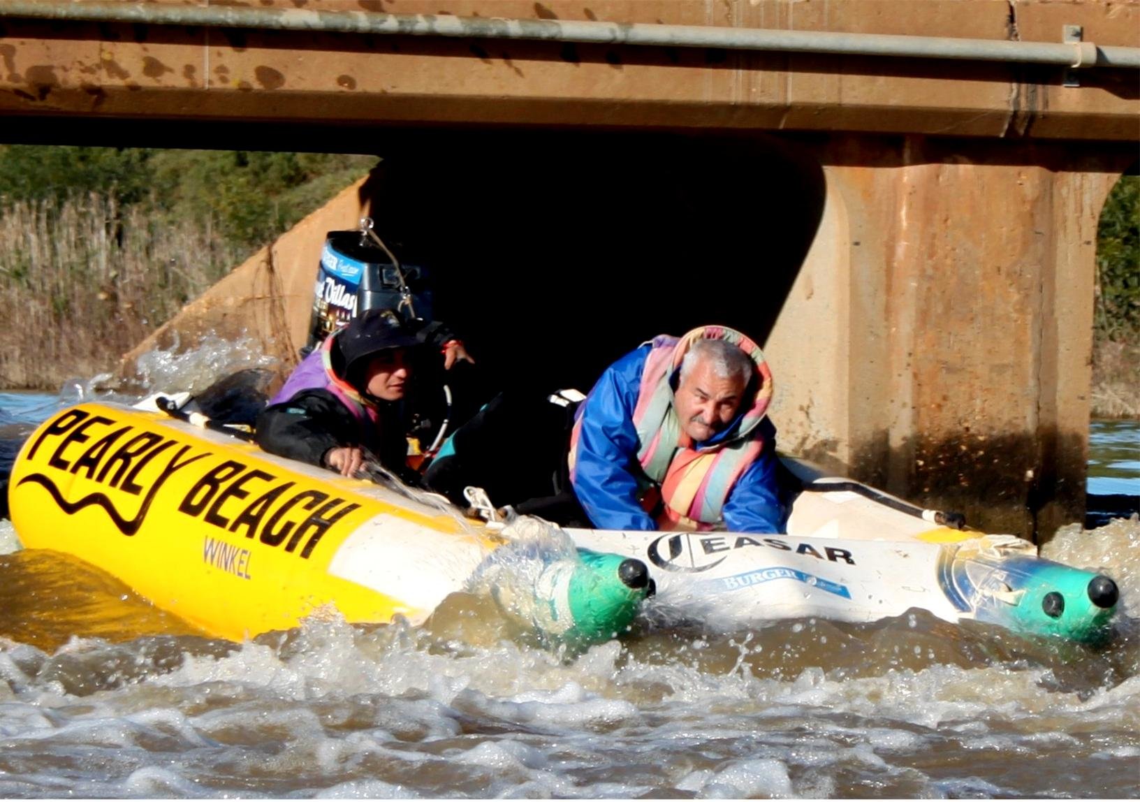 Foto: Rynardt Koekemoer stuur die Pearly Beach rubberboot verlede jaar onder deur die Moraviabrug buite Piketberg met sy pa, Jan, wat klou om nie uit te val nie. Jan en Rynardt is een van twee pa en seun kombinasies wat vanjaar aan die 24ste CHOC Bergrivierprojek deelneem.