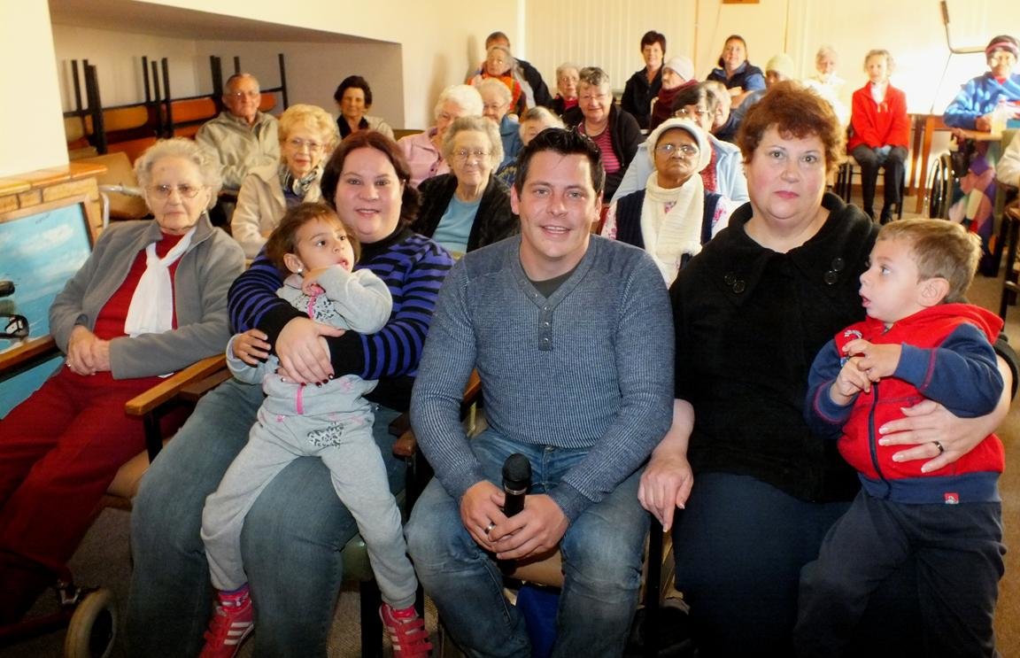 Foto 1: Dillon Lerm (middel) by ‘n deel van HaS se opgewonde inwoners tydens sy optrede daar, met regs van hom Hester Venter en haar dogter, Louise Geldenhuys links van hom.