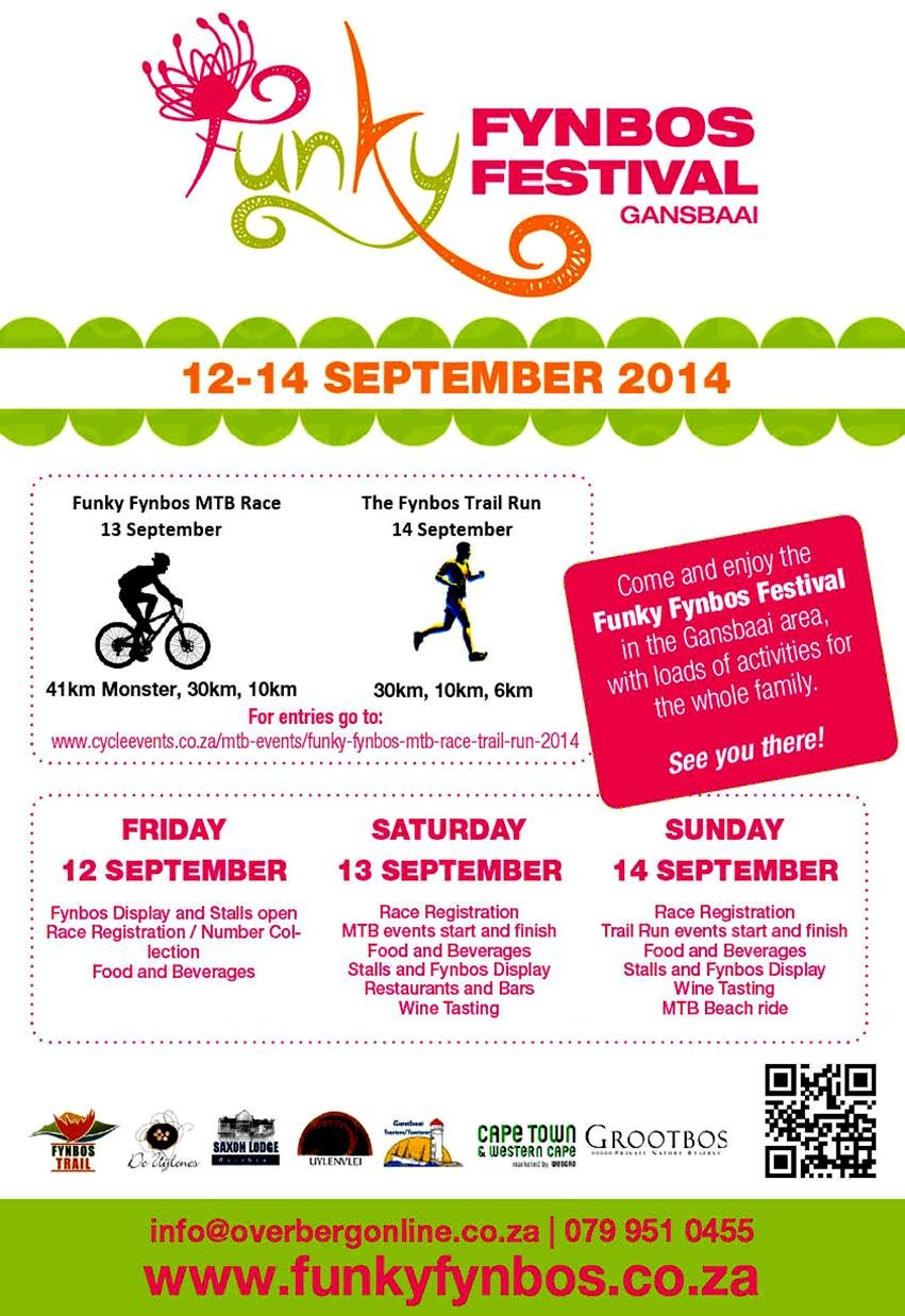 ‘n Splinternuwe fees gaan Gansbaaiers en toeriste vermaak in September – met aktiwiteite om die area se pragtige natuurskoon ten toon te stel. Die Funky Fynbos Fees vind plaas vanaf die 12de tot die 14de September 2014 in die Gansbaai omgewing. Dit sluit in opwindende aktiwiteite, van 4x4 roetes en bergfietsreisies, tot die meer ontspanne aktiwiteite soos wynproe, restaurante en musiek.