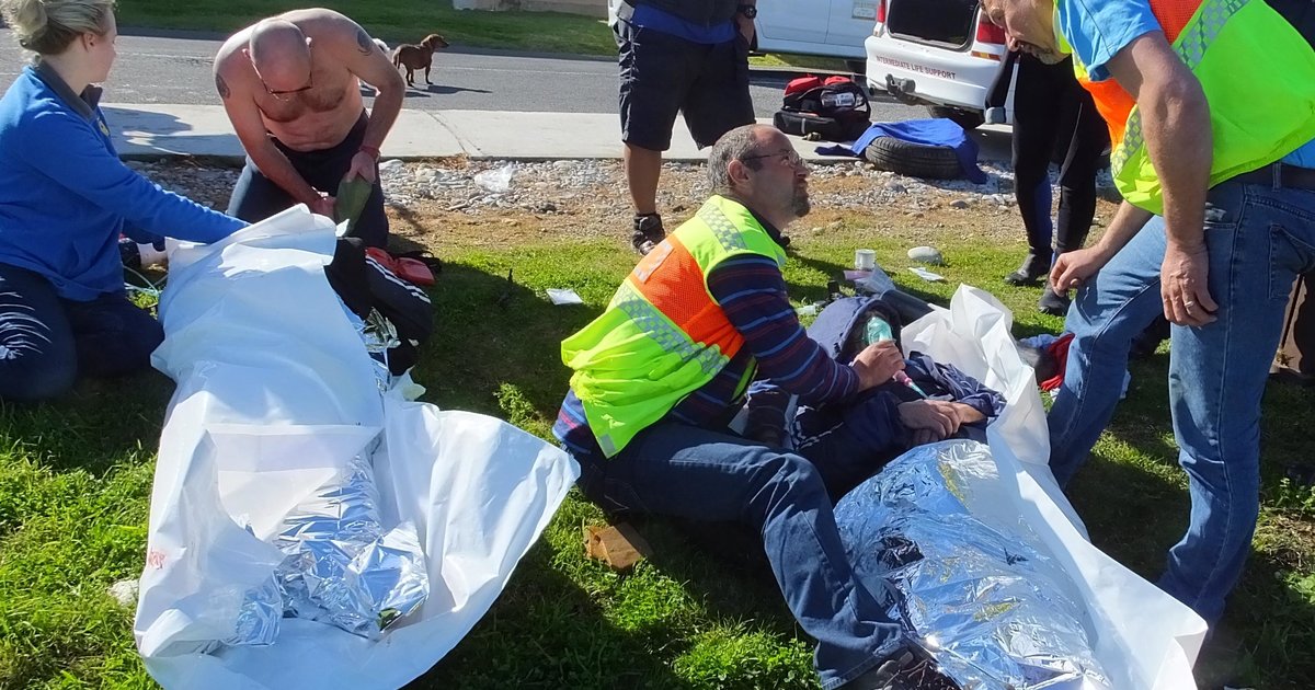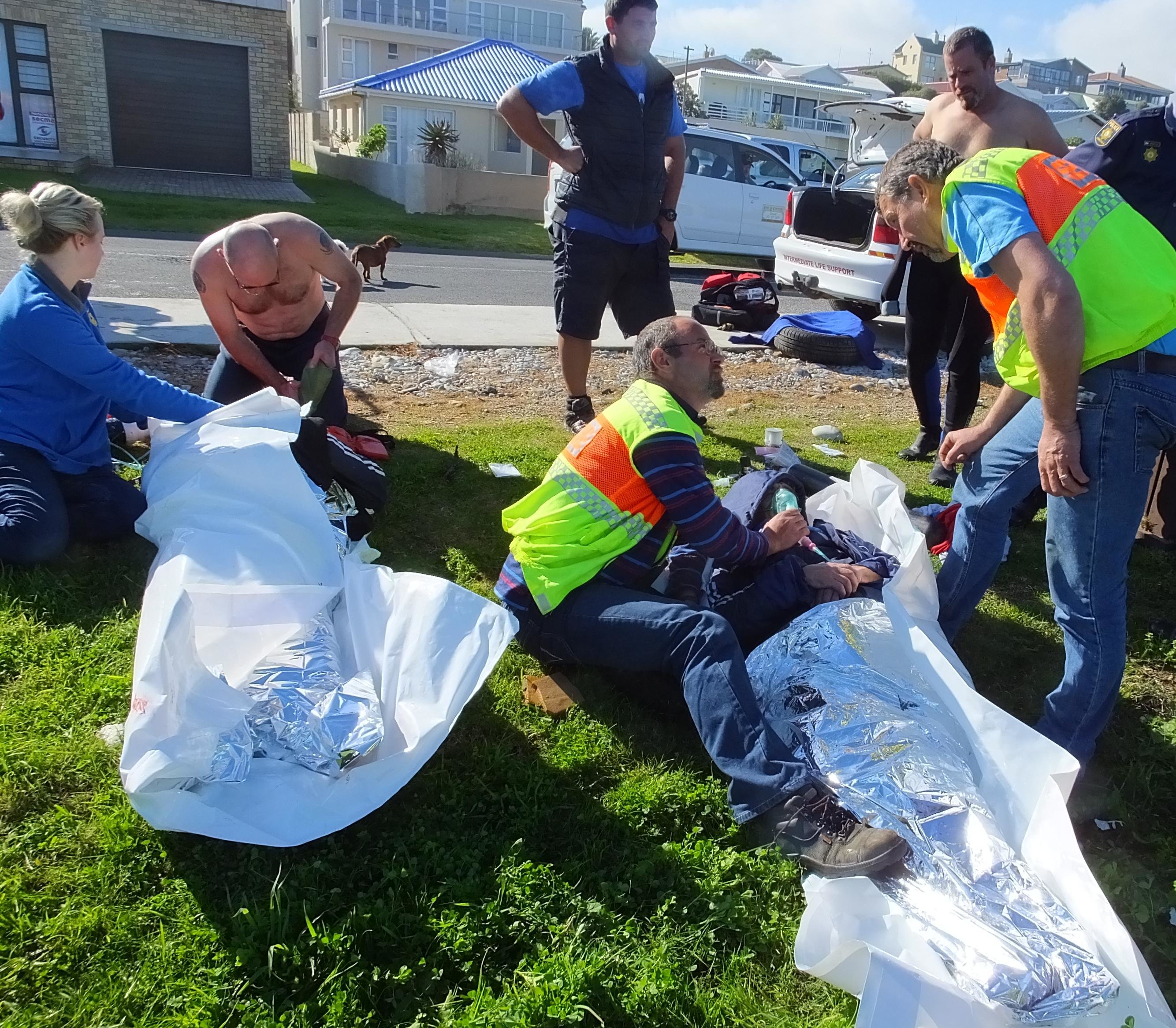 Die held van die dag was Rory Richards van Pinelands wat op 'n olieboorplatform werk en tans hier vakansie hou. "Ek het by Blousloep vanaf die rotse gehengel toe ek 'n klein 3m en 9 pkg buiteboortbootjie met twee mans aan boord sowat 300 meter vanaf die kant, opgemerk het. Die bootjie het skielik in 'n brander omgeslaan, onderstebo gedryf en die mans het daaraan vasgeklou." Deon Niemand, wat daar verbygery en ook gesien wat gebeur het, het dadelik die munisipale nooddienste gebel. Richards het ook 'n noodnommer wat by die Blousloep se bootlanseerpunt vertoon word, gebel. 'n Haaibesigtigingsboot het probeer hulp verleen maar kon nie deur die plaat digte bamboes kom nie. "Ek kon ook nie gaan help nie. Dit was sleg om dit als te sien terwyl ek niks kon doen nie.