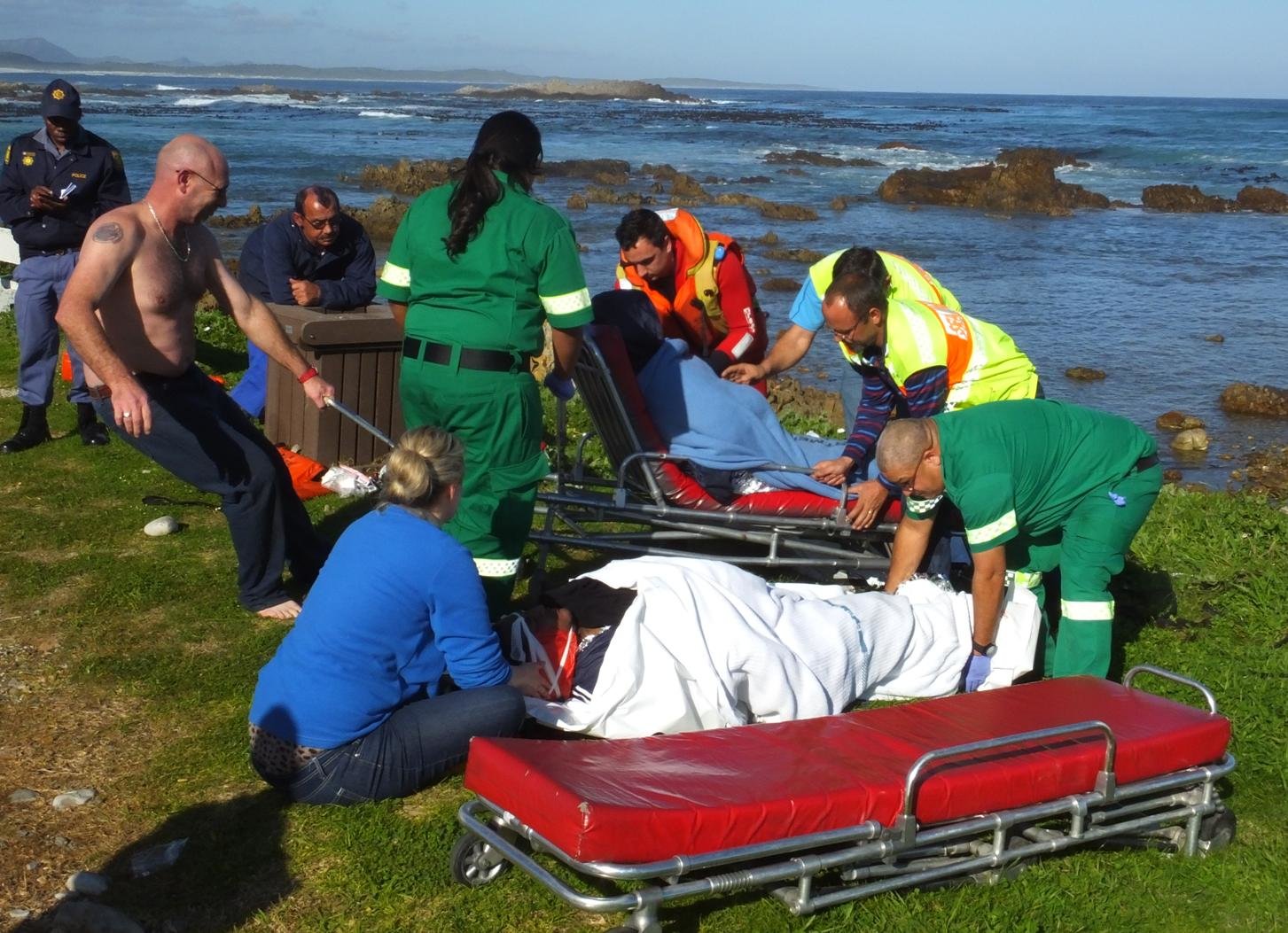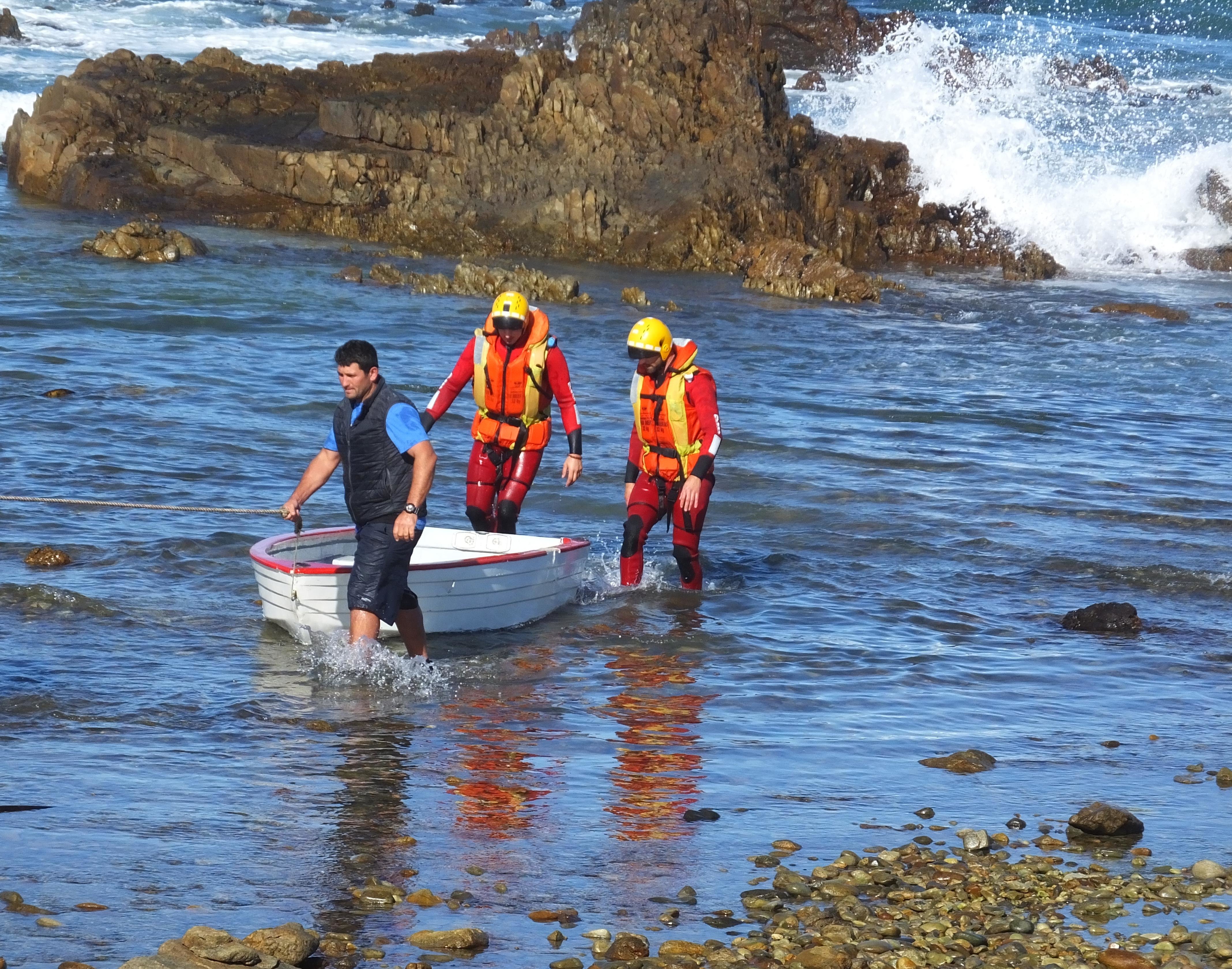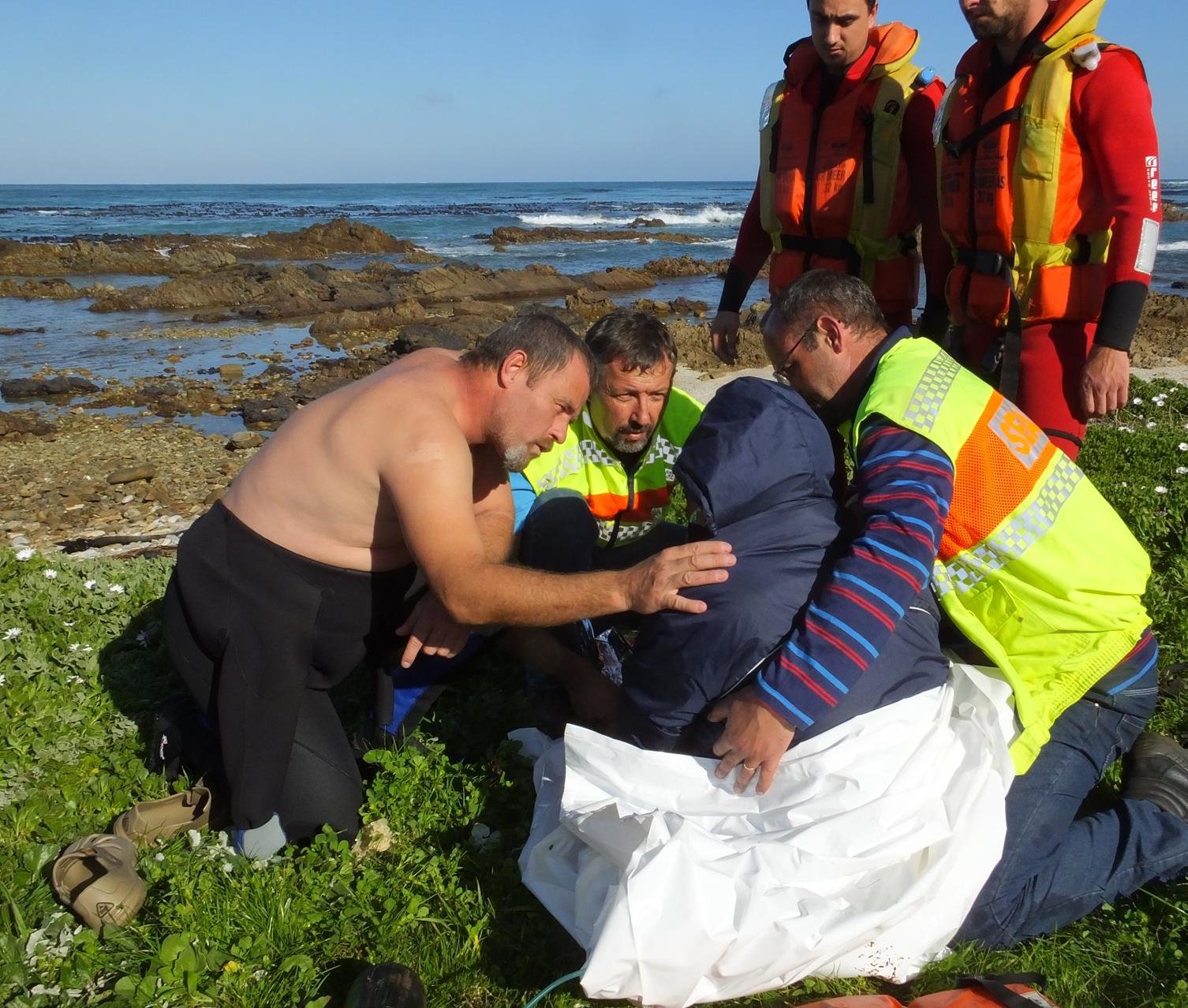 Die drenkelinge was eers net nat maar nog veilig maar die tyd het later, nadat hulle sowat 1½ uur in die water was, vir hulle begin uitloop." Die boot het intussen tot gevaarlik naby aan rotsstaande rotse gedryf en Richards het besluit om na die naaste punt te ry. Daar het hy sy duikpak aangetrek en na die boot geswem. "Ek het vir hulle gesê om nie aan die land se kant van die boot vas te hou nie, want die rotse gaan hulle baie seermaak." Volgens hom was die ouer man reeds baie gedaan. "Ek het die brandstoftenk losgemaak en vir Plaatjies gegee om mee uit te dryf terwyl ek met Van den Berg begin uitswem het. Hy het net aanhoudend gesê: 'Ek kan nie meer nie', waarop ek gesê het, hy het geen keuse nie," het Richards vertel. Toe hulle naby die kant kom, het omstanders 'n tou na hulle gegooi en gehelp om die drenkelinge veilig op die rotse te kry. Cassie Carstens van Overstrand Medical Response was op die toneel en het die twee mans vir hipotermie, skok en skrape behandel. Deon Langenhoven, Onderbevelvoerder van NSRI Hermanus en Jean le Roux het ook gehelp met die stabilisering van die twee mans. Hulle is later per ambulans na Hermanus geneem.
