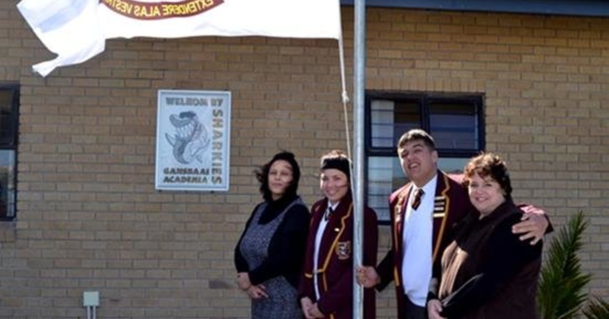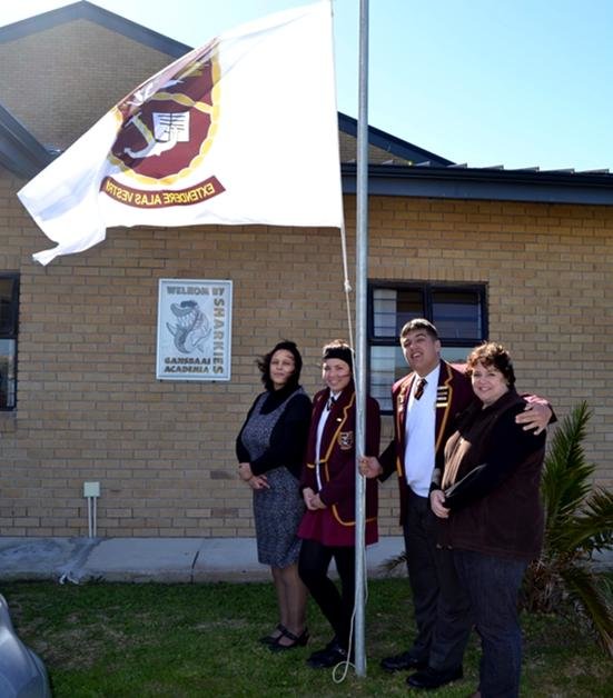 Gansbaai Academia het twee stelle vlae ontvang van me Adel Geldenhuys, bestuurder van Taurus Cape Kelp. Hier word die vlae gehys deur die hoofseun, Jack Swart, hoofmeisie, Monica de Gouveia, saam met die Adjunkhoof, me Carien Fortuin en me Adel Geldenhuys.