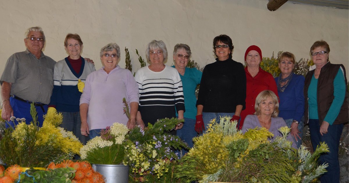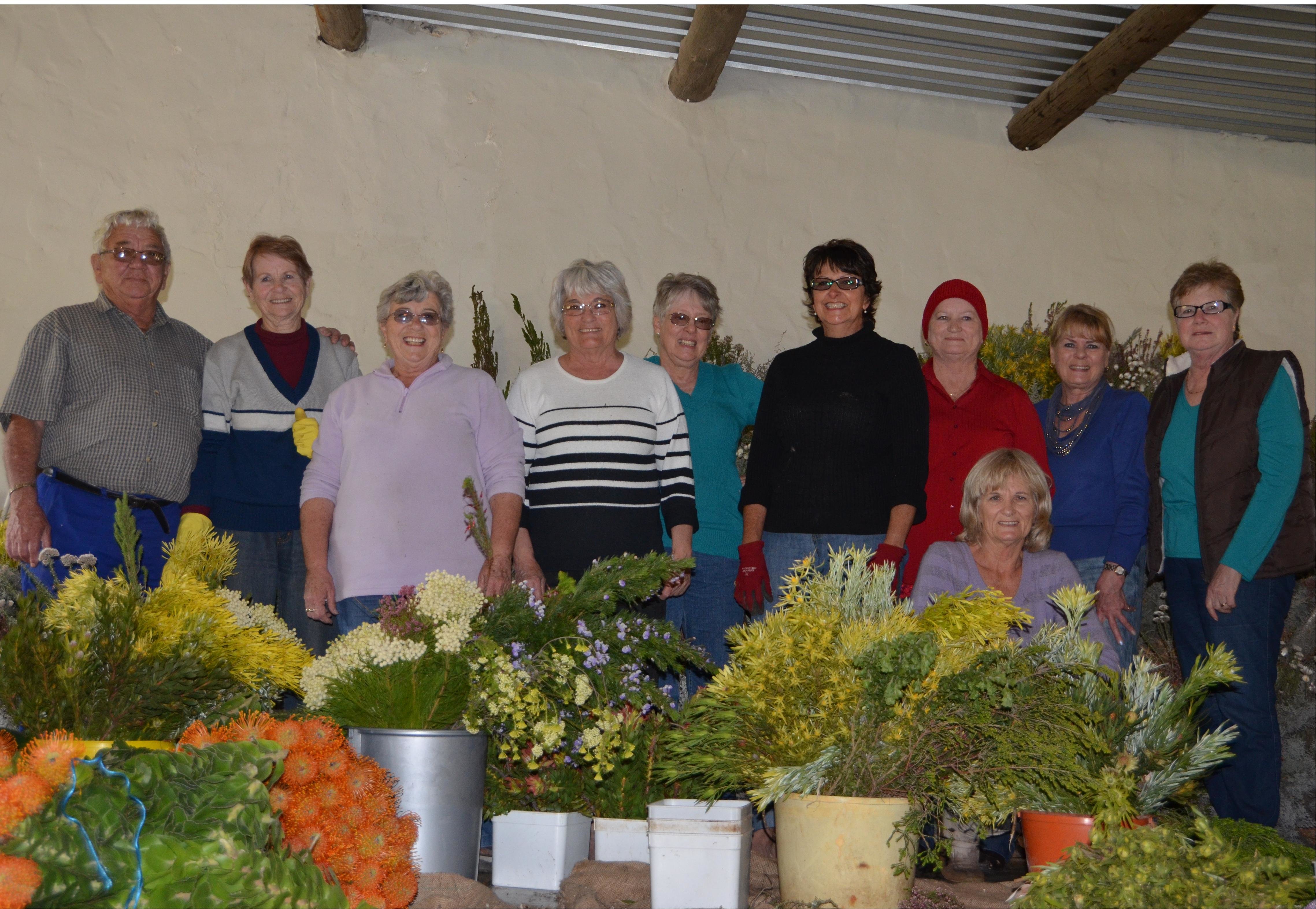 ‘n Deel van die Fynbosspan vir die naweek se Rockets Fynbosfees te De Uiljenes, met vlnr Dawie le Roux, Alice Bredenkamp, Suzie Rademan, Sylvie Agenbach, Jeannette Crafford, Judy Bothma, Gina Louw, Maryna Whitney en Annatjie Pretorius, met Stella Swart voor. Foto: Dave Sawtelle