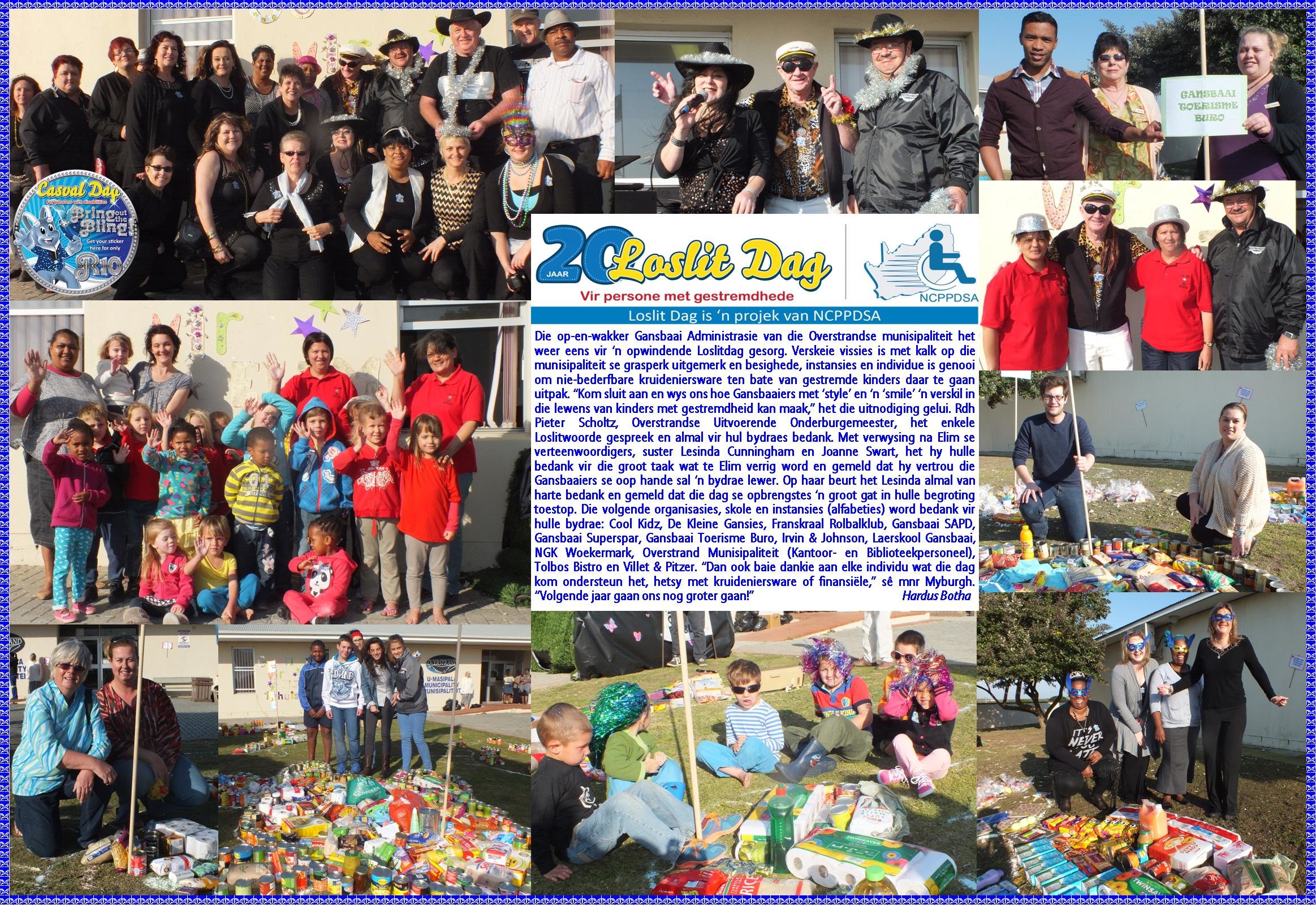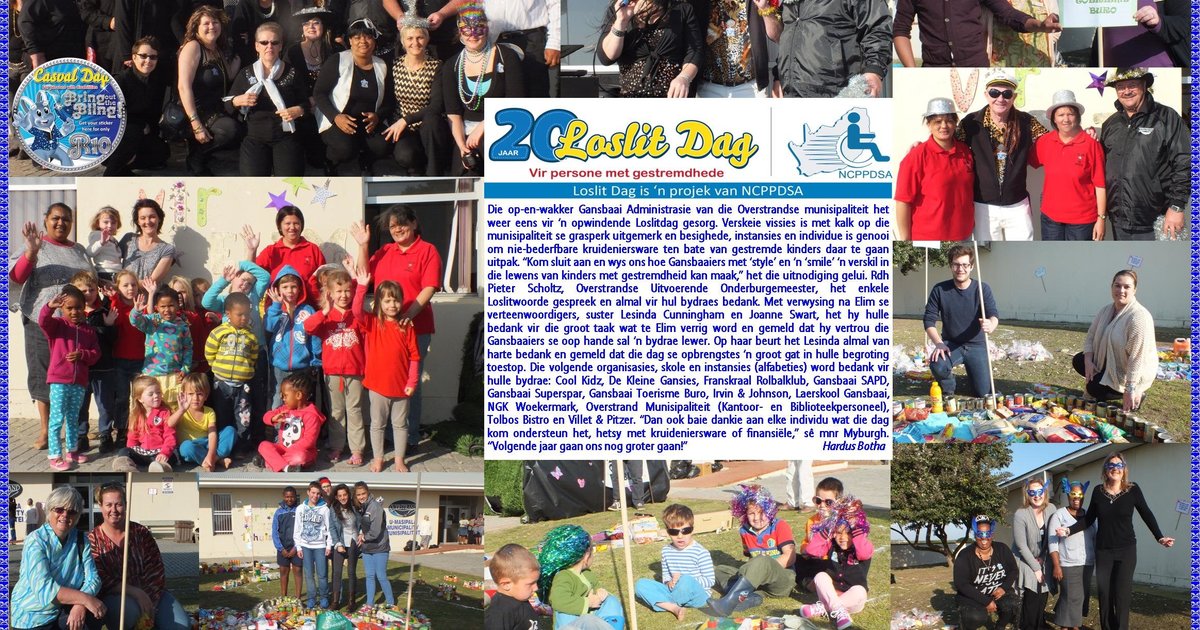Die op-en-wakker Gansbaai Administrasie van die Overstrandse munisipaliteit het weer eens vir ‘n opwindende Loslitdag gesorg. Verskeie vissies is met kalk op die munisipaliteit se grasperk uitgemerk en besighede, instansies en individue is genooi om nie-bederfbare kruideniersware ten bate van gestremde kinders daar te gaan uitpak. “Kom sluit aan en wys ons hoe Gansbaaiers met ‘style’ en ‘n ‘smile’ ‘n verskil in die lewens van kinders met gestremdheid kan maak,” het die uitnodiging gelui.