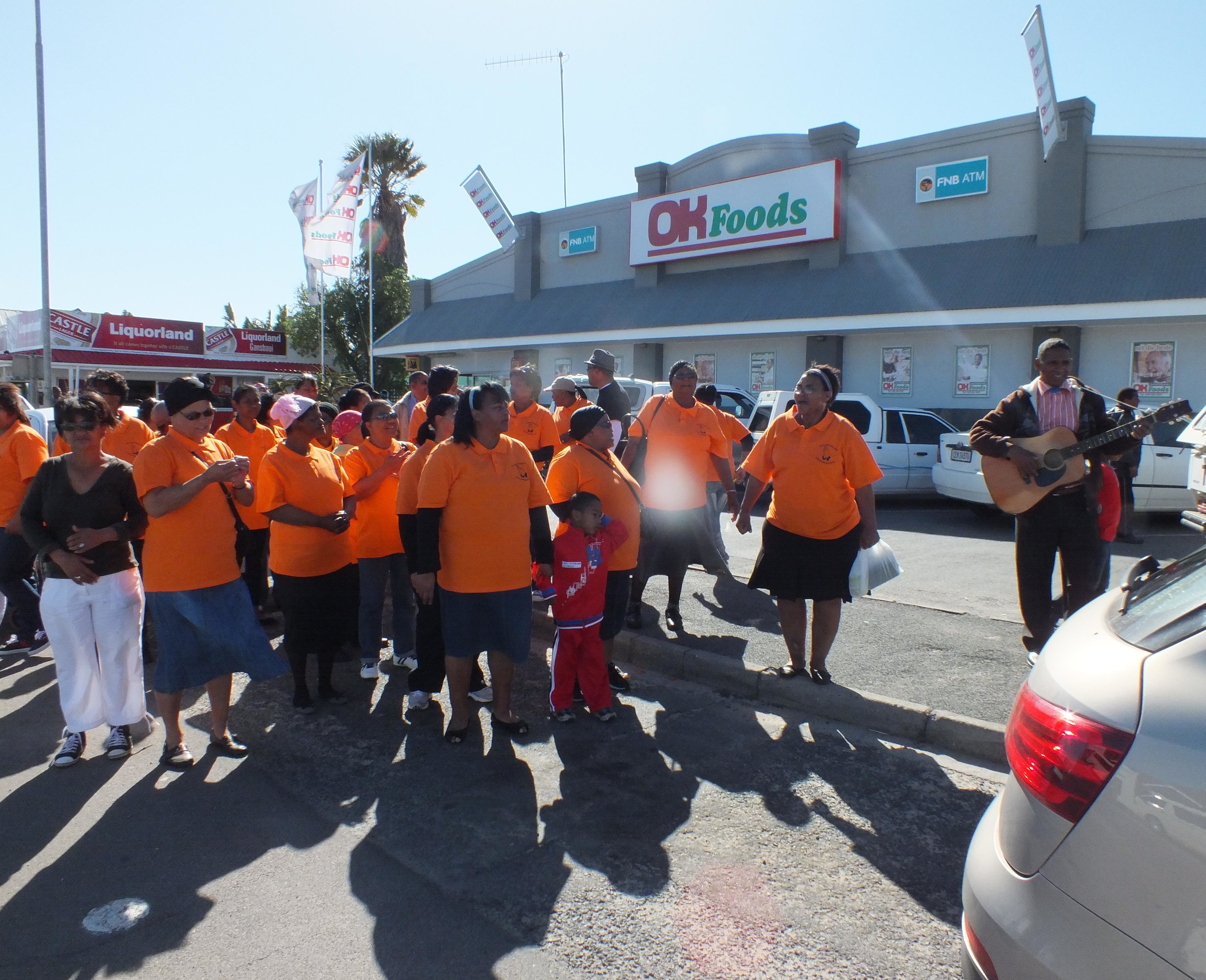 “Die reëlings vir die dag is onder die bekwame leiding van suster Alida Sauls, voorsitter van die susters, getref,” vertel Marlene Slinger wat self ook deel van die reëlingskomitee was. “Ons noem dit die Vroue as Pilare staptog.” Van die Pretoriussaal af is hulle onder verkeersbegeleiding in Hoofstraat af, waar hulle by Gansbaai OK Foods en Gansbaai Superspar gestop het om Vrouemaand-boodskappe aan omstanders oor te dra en saam te sing. Johannes Tobias het vir kitaarbegeleiding gesorg.
