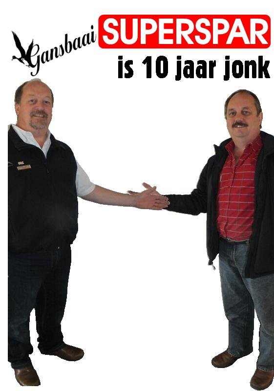 Gansbaai Superspar is in Oktober 2014 10 jaar gelede geopen in sy huidige perseel. Die Spar is egter al vir meer as 30 jaar op Gansbaai. Die Spar is in 1983 deur mnr Brummer geopen op die hoek van Voortrekker-en Kerkstraat. Vandag is Watertech Loodgieters se kantore in die perseel. In 1988 koop mnr Basie Wessels die Spar en skuif die Spar in 1992 na die Hoofstraat waar OK vandag is. In 1998 koop mnr Ettienne Bruwer die Spar by mnr Basie Wessels. Mnr Bruwer het die visie gehad om die winkel te omskep van ‘n Spar na ‘n Superspar. Om die winkel ‘n Superspar te maak benodig hy egter ruimte en skuif die winkel na sy huidige perseel en open in Oktober 2004. In April 2005 oorhandig die Bruwers die leisels aan die huidige eienaars, De Wet (foto links) en Morkel van Niekerk (foto regs). In 2008 koop die broers van Niekerk Kleinmond Spar en sluit hul broer, Bern, ook aan by die span. Hy bestuur eers Kleinmond Spar en in Januarie 2010 skuif hy na Eastcliff Spar toe die broers die winkel koop. Desember 2010 koop die broers ook Bredasdorp Superspar.