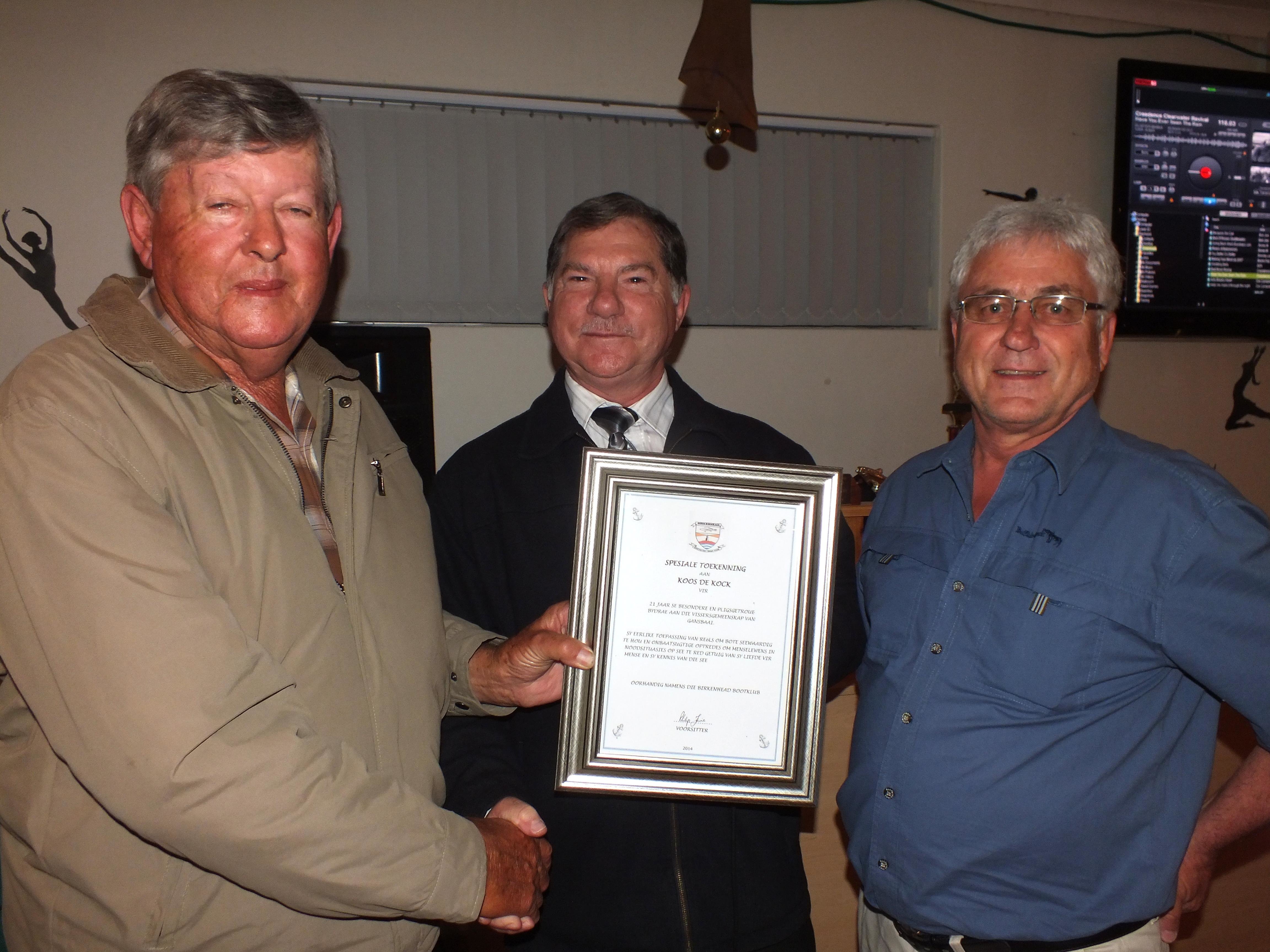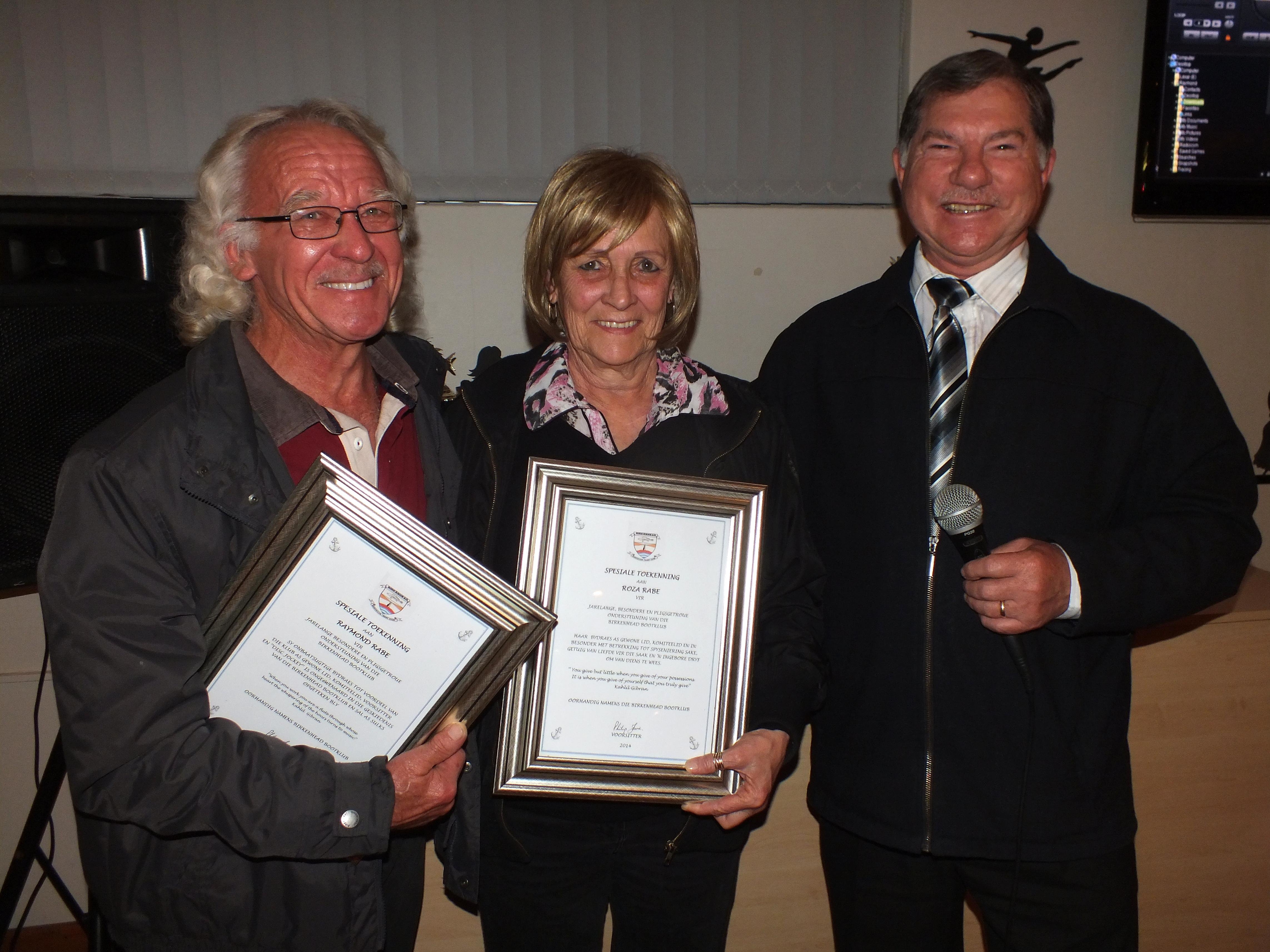 Raymond en Roza Rabe het elk ‘n pragtige geraamde sertifikaat ontvang vir hulle besonderse werk in die klub oor etlike jare heen, met ‘n geraamde sertifikaat wat ook aan Koos de Kock toegeken vir sy jarelange en getroue werk as SAMSA Ondersoekbeampte en Veiligheidsoffisier.