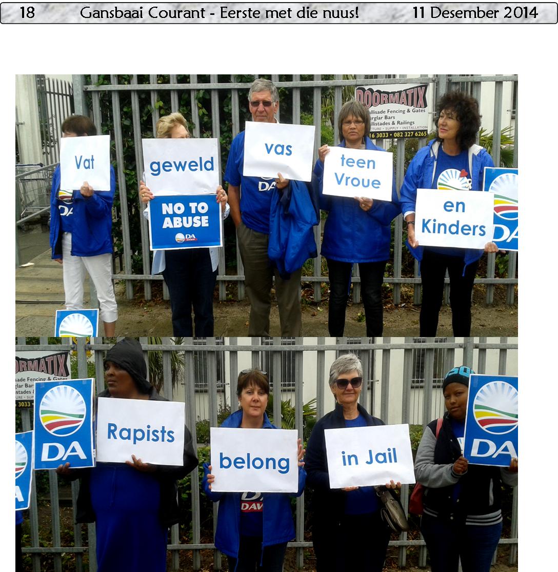 Intussen het Overstrand DA Raadslede aan ‘n protesaksie teen geweld teen vroue en kinders deelgeneem. Die Raadslede, asook DA aktiviste, het op 2 Desember 2014 voor die Hermanus Magistraatskantore hul solidariteit betoon met die aksie: “Stop geweld teen vroue en kinders”. Overstrandse Uitvoerende Burgemeester, Raadsvrou Nicolette Botha-Guthrie, Raadslede en aktiviste, almal in blou, het die koppe laat draai en ook groot entoesiasme deur verbygaande bestuurders en pasassiers uitgelok. Motoriste se luide getoet, die waai van arms en die geesdriftige geskree: “Viva DA”, het die span “protesgangers” die versekering gegee dat hulle boodskap duidelik oorgedra is.