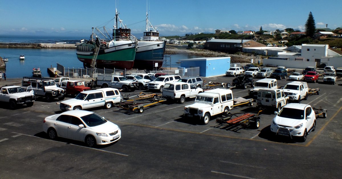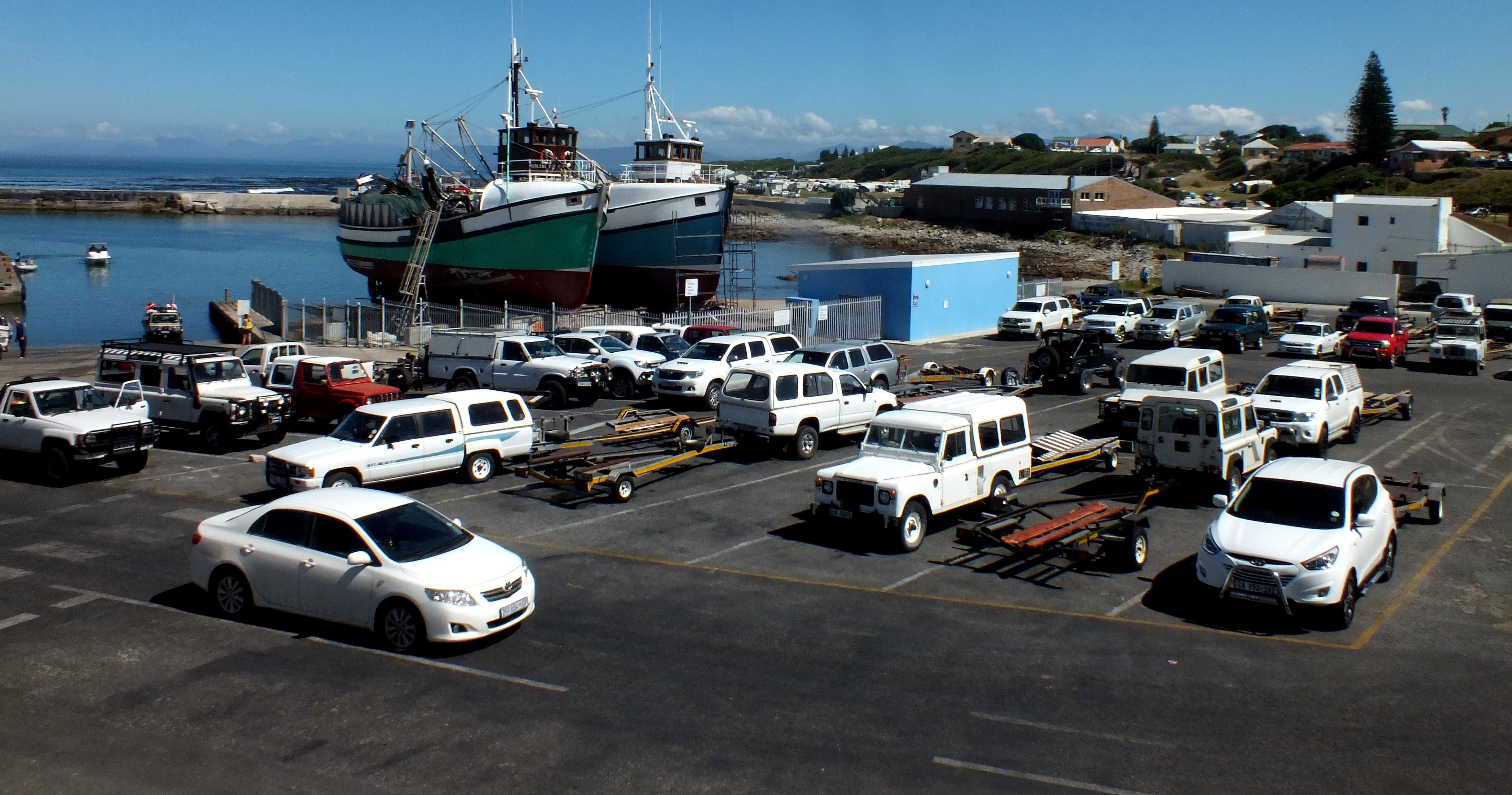 ‘n Volgepakte Gansbaai hawe op Vrydag, 3 Januarie 2014 met bootsleepwaens van bote wat see toe is om te hengel. Op ‘n stadium gedurende die voormiddag was daar sowat 75+ voertuie met bootsleepwaens wat die area vol parkeer het, selfs langs die pad tussen die fabrieksgeboue deur en ook aan die teenoorgestelde kant van die hawe op die groot parkeerarea langs die Birkenhead Boothengelklub.