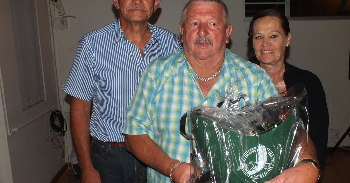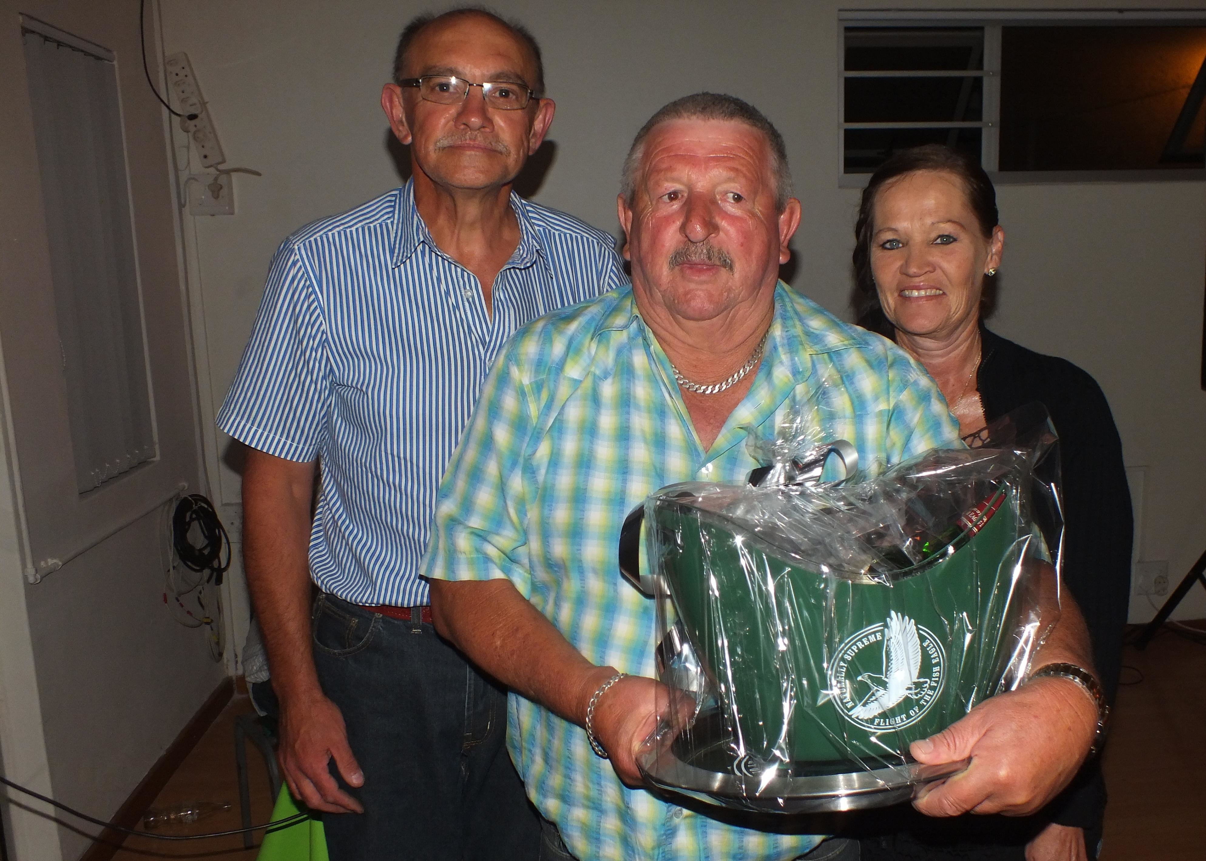 Die uiteindelike wenner was Awie van der Merwe van Kleinbaai. Die trekking van die gelukkige nommers het egter ‘n interessante verloop gehad: Die eerste wenner was Ingrid Wiese….en die tweede wenner was wéér sy. Dit is Johan en Suzette Wiese se skoondogter en sy en haar eggenoot, Johan, was hier met vakansie. Aangesien die geskenkpak nie saamgeneem kan word nie, het Ingrid dit telkens teruggegee en Awie het dit toe gewen. Kan ‘n man dan só gelukkig wees?!