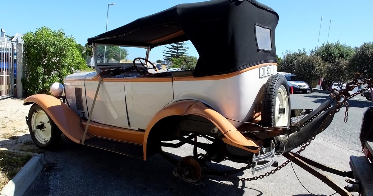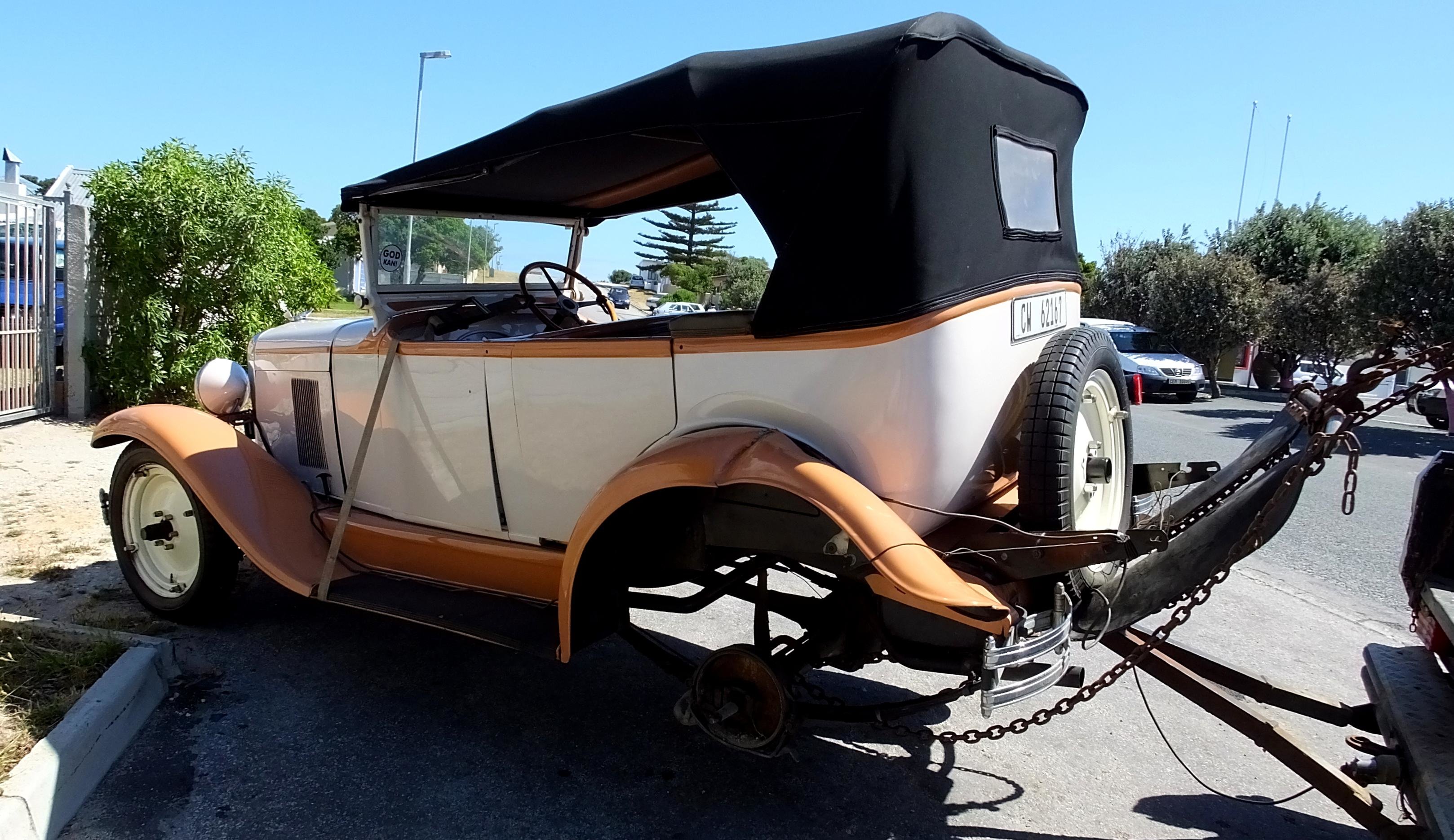 "Dit is die oudste motor wat ek al ingesleep het," het Kenny van Rensburg van L+S Motors in verwondering gesê. Die pragtige 1929 Chevrolet veteraanmotor van Anthony Pasierbek het net buite Gansbaai 'n agterwiel verloor. Anthony, eienaar van Tony's Motor Spares & Radiators in Worcester, besit 'n vakansiehuis in Kleinbaai en het oor die feestyd hier kom uitspan. Die motor is gelukkig net lig beskadig.