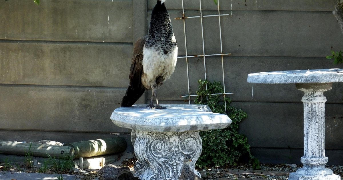 Hierdie pou het doodluiters, saam met ‘n spannetjie fisante, by Francois de Jongh van Gansbaai Courant se woning in De Kelders aangekom en ongestoord saam met sy fisant-metgeselle in die tuin begin skrop. Indien iemand na ‘n verlore pou, wat uiters skaars in hierdie omgewing is, soek, kan navrae by Gansbaai Courant gedoen word. Miskien is sy steeds in die omgewing. Siek soos wat hy is, het Francois enkele foto’s deur sy woning se venster geneem - eenmaal joernalis, altyd joernalis!