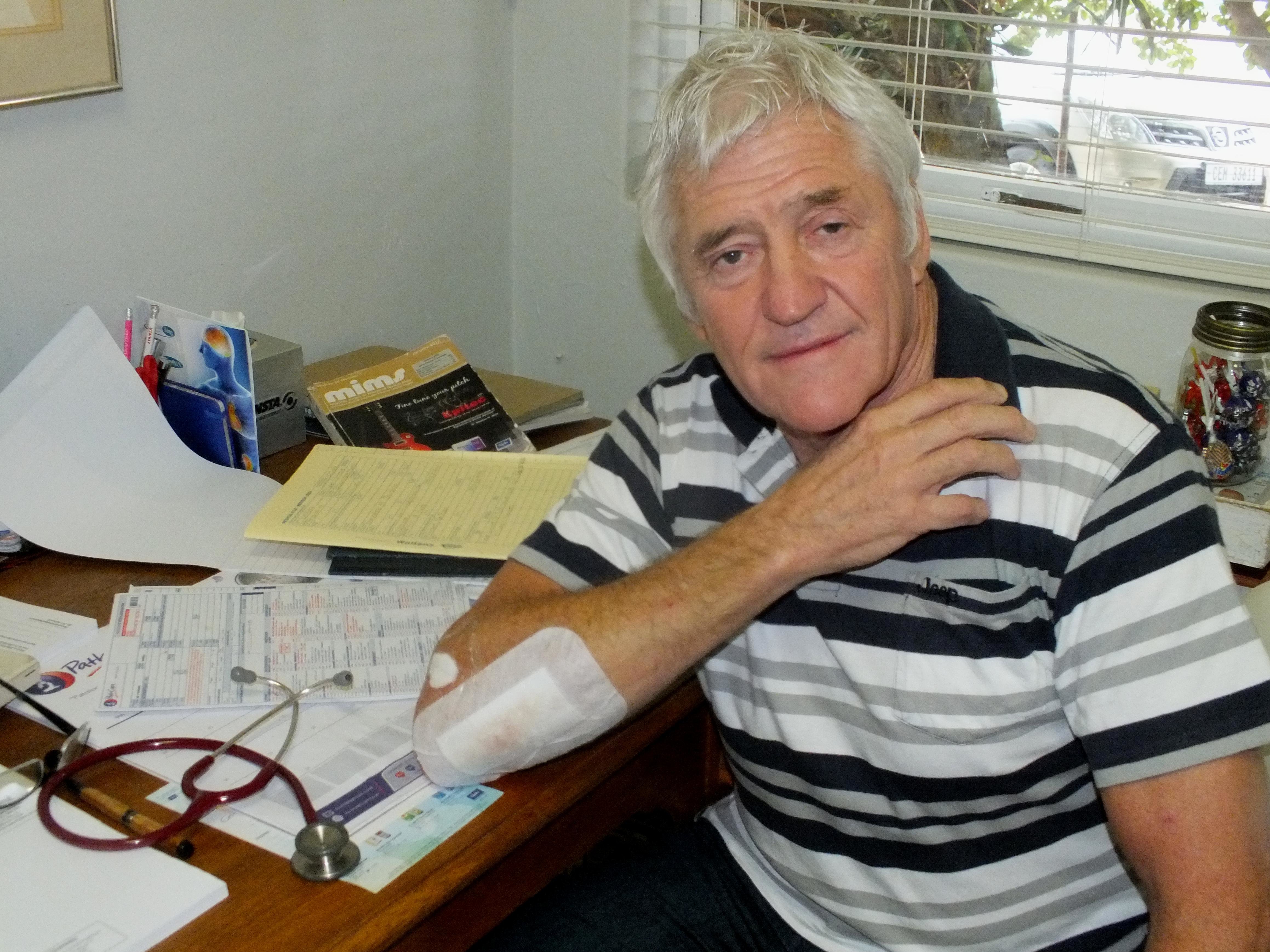 Donderdag, 5 Maart 2015 was nie vir Gansbaai se bekende algemene praktisyn, dr Christo Barnard, ‘n goeie dag nie. Hy het soos gewoonlik vroegoggend gaan fietsry om vir oulaas oefening vir die Argus-Fietswedren in te kry, waaraan hy eerskomende Sondag in die Kaap sou gaan deelneem het. Daarvan kan hy nou vergeet, aangesien hy op die nuwe teerpad tussen Kleinbaai en Franskraal, net verby die eertydse Birkenhead Lodge, deur ‘n motor raakgery is. Hy het met been- en ribfrakture op die grond beland. Christo is daarna in die Hermanus MediClinic met drie gebreekte ribbes, ‘n bobeenfraktuur en ernstige armbeserings opgeneem. Met krukke en al was hy Maandag weer terug in sy spreekkamer, besig om te werk. “Daar is siek mense wat my nodig het - ek kan mos nie dat hulle vir my wag nie,” het hy met sy kenmerkende glimlag gesê. Dit kon baie erger en selfs noodlottig gewees het, maar groot dankbaarheid bestaan dat dit nie die geval was nie. Christo het ook ‘n tyd gelede ‘n heupvervanging ondergaan, maar gelukkig vir hom is daar geen skade aangerig nie. “Ek is gelukkig om ‘n padfiets, ‘n bergfiets en ‘n motorfiets te kan besit, maar ek is nou al op al drie omgery en al drie kere was dit ‘n vrouebestuurder,” vertel Christo, met sy humorsin wat sommer vinnig weer genormaliseer het. Sowat 9 jaar gelede is Christo op sy padfiets raakgery, 7 jaar later was dit op sy motorfiets en nou op sy bergfiets, en soos reeds gesê - elke keer was dit toevallig vrouebestuurders. “Ek voel net dit is nie goed vir my ego nie, aangesien dit vir my wil voorkom asof die vrouens my nie eers raaksien nie!”