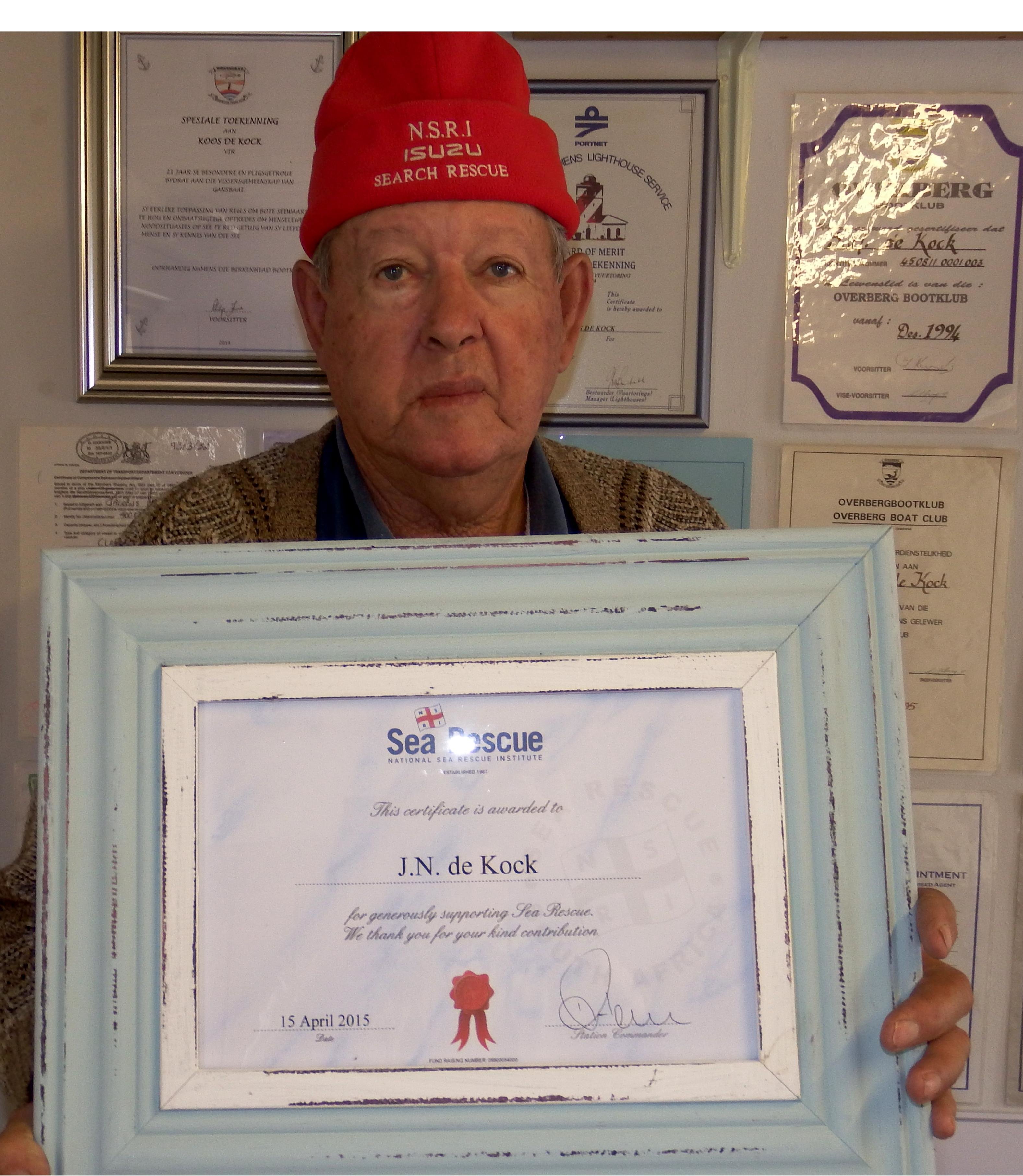 “This certificate is for generously supporting Sea Rescue and we thank you for your kind contribution,” lui die bewoording op die sertifikaat. Koos was vir sowat 11 jaar, sedert 2004 by NSRI betrokke.