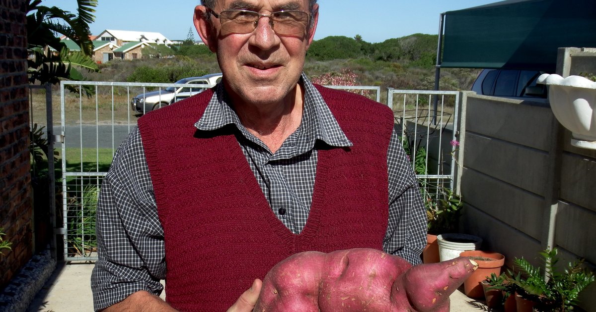 Leonard Batt van Franskraal kan beslis praat van ‘n enorme patat uit sy tuin - 3.6kg - en dan lyk die patat se vorm nog soos ‘n renosterbeeldjie met kop en stertjie en al.