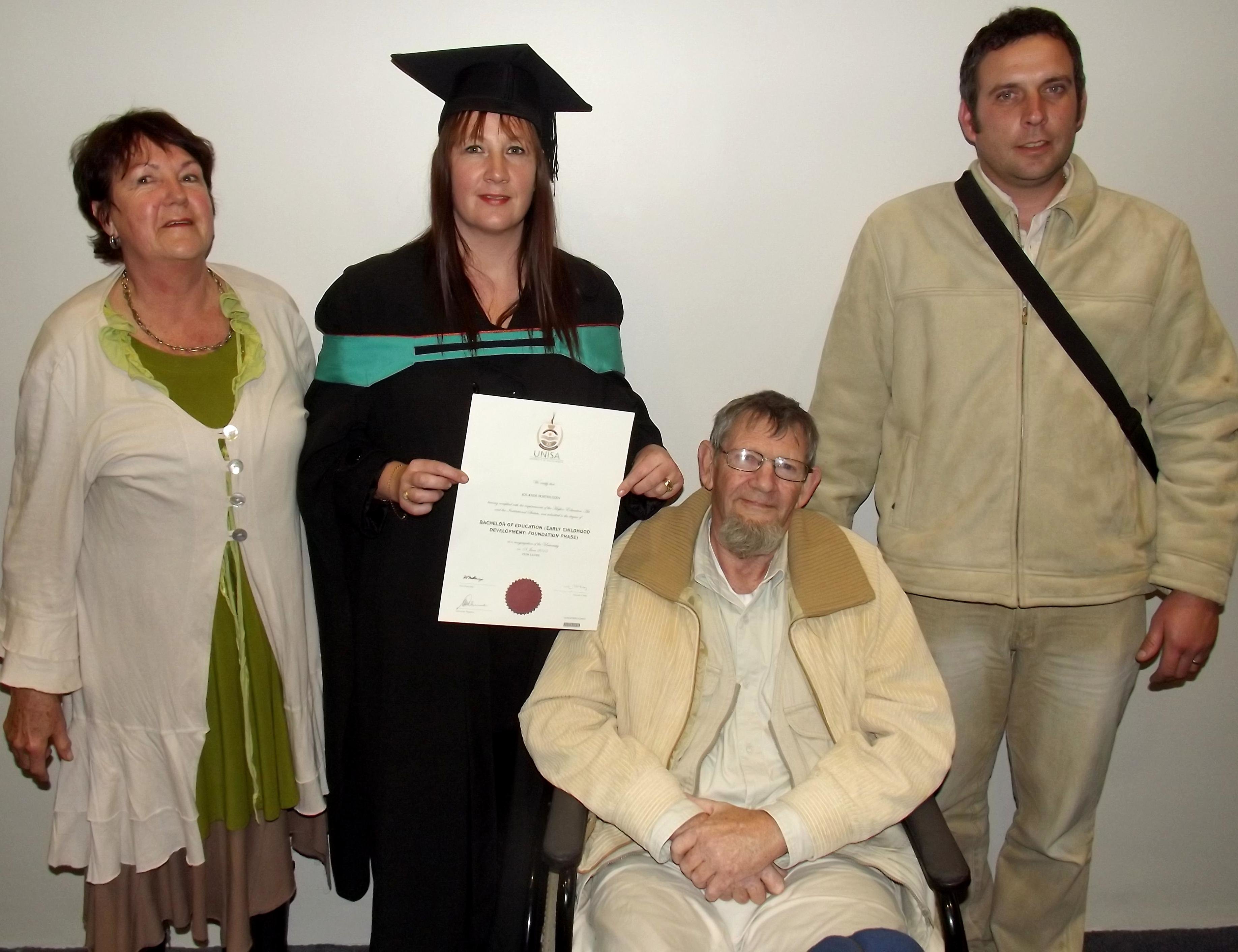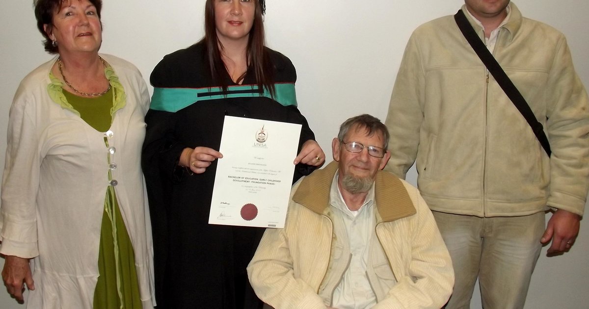 Jolandi Oosthuizen (35) van Gansbaai kan met reg trots wees op haar B-Ed graad wat sy met lof (Cum Laude) aan die Universiteit van Suid-Afrika (UNISA) verwerf het, met ‘n gemiddeld van 87% plus vir al haar vakke - ‘n getroude, werkende moeder van twee dogters en ‘n huishouding en sy behaal hierdie groot prestasie binne die voorgeskrewe tydperk van 4 jaar. Dit wil gedoen wees, met opregte gelukwense aan Jolandi.