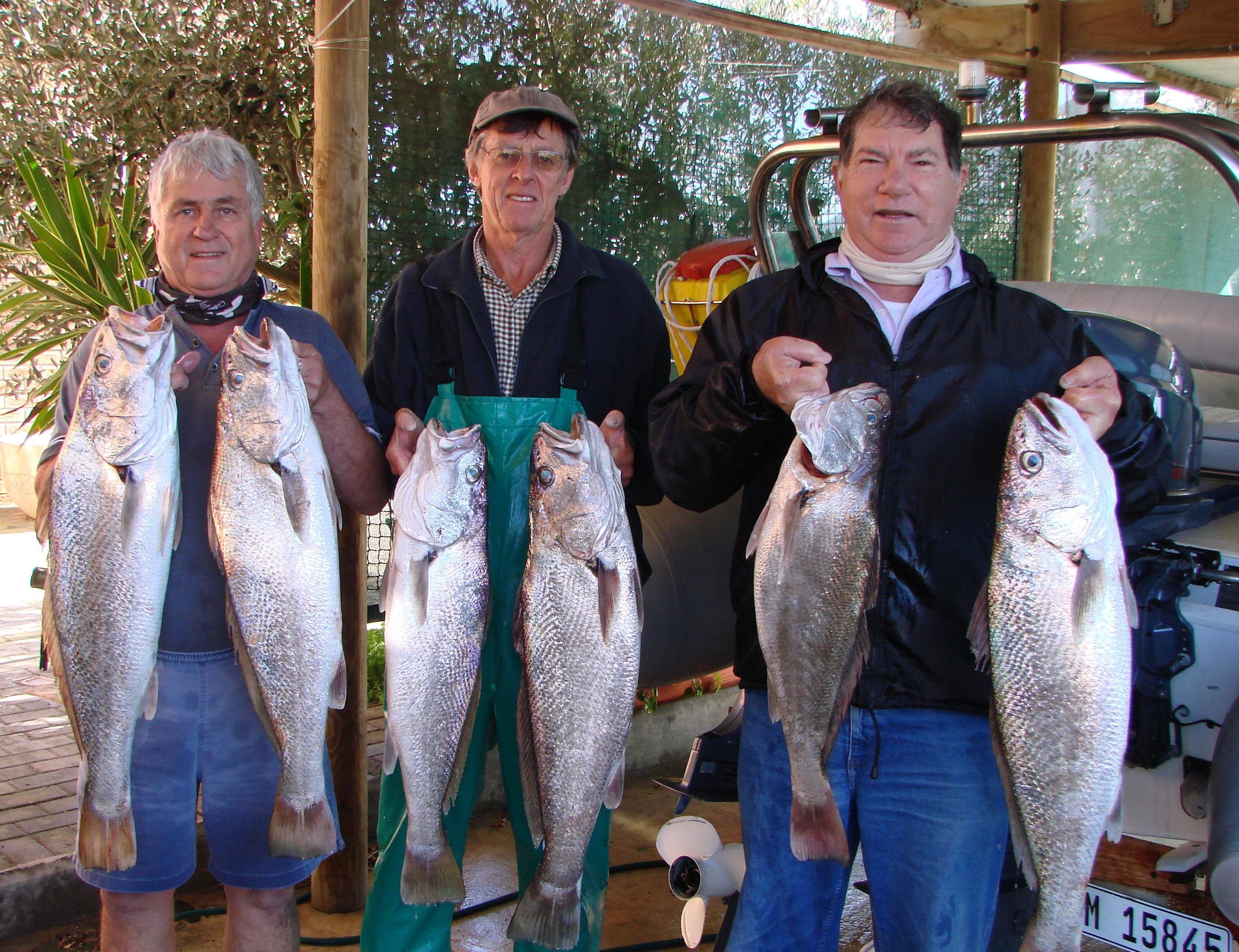 Vlnr is drie Birkenhead Boothengelklublede, Johan Burmeister (wedstrydsekretaris), Lulof Doyer (lid) en Philip Fourie (voorsitter) met 6 van die pragtige kabeljoue wat hulle naby Kleinbaai “in die diep” vanaf Johan se boot, Nu-Nu gevang het.