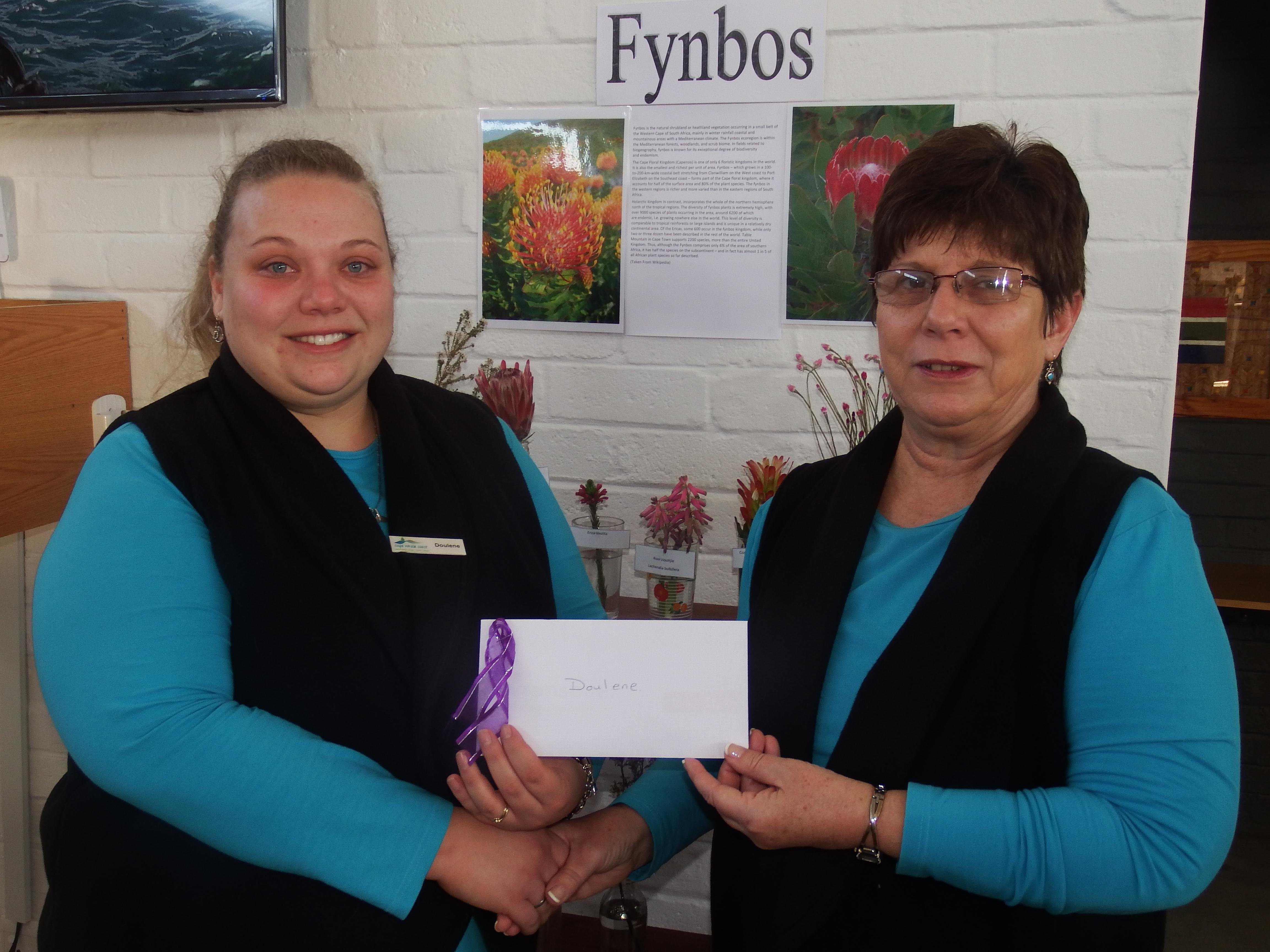 “Die honorarium wat ek ontvang het, het my onverhoeds betrap en ek is nog steeds sprakeloos,” het Doulene Els (25) gesê tydens die oorhandiging van ‘n honorarium aan haar ná 10 jaar se getroue diens in Gansbaai Toerisme.