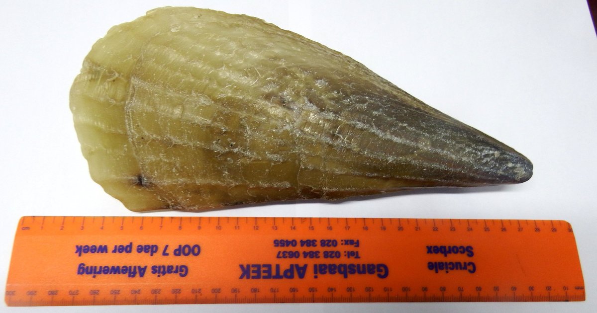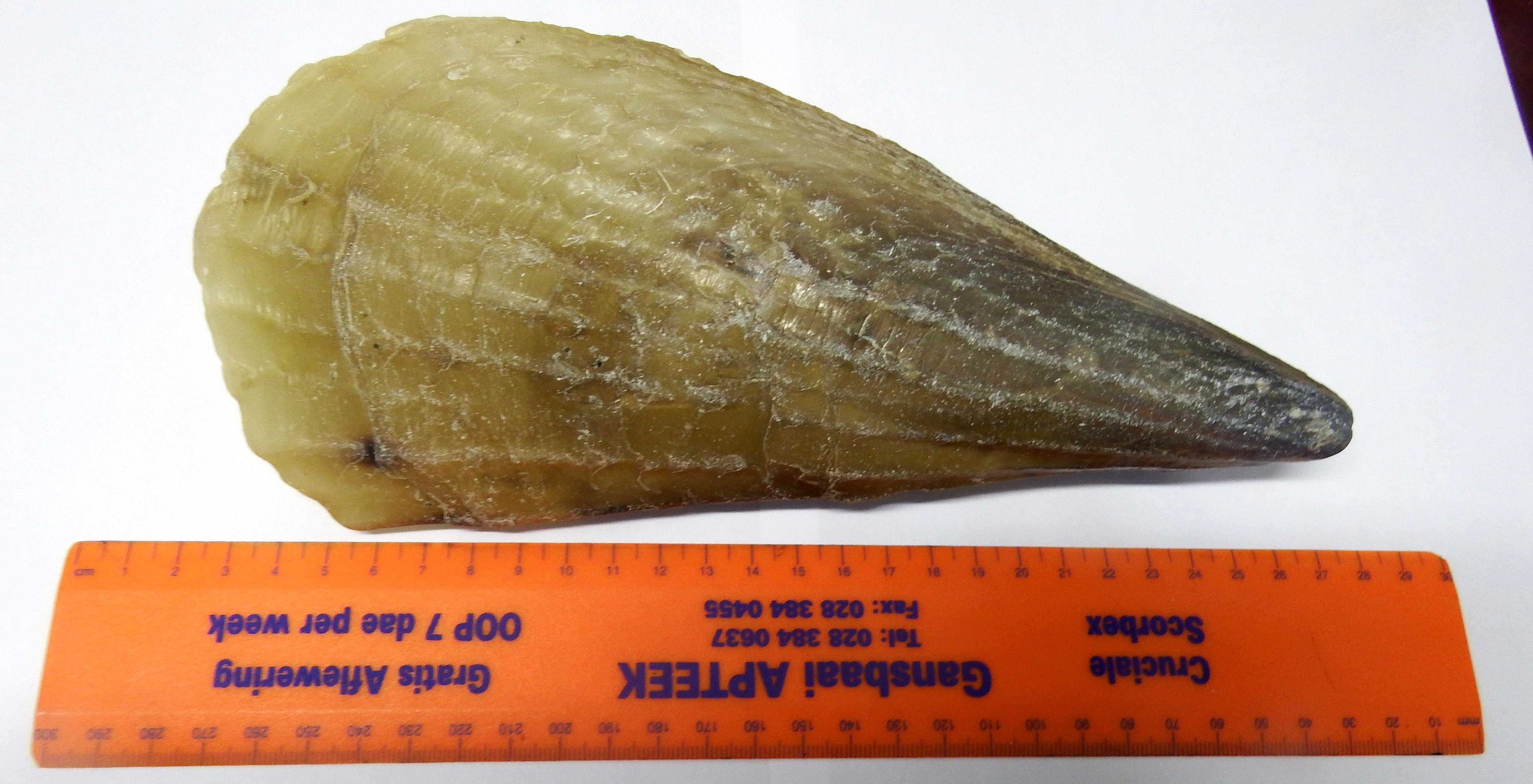 “Ek het hierdie groot ‘skulp’ etlike jare gelede by Stellenbosch uitgegrawe toe ek in diens van Telkom was en Telkomslote daar gegrawe is,” vertel Bennie Walker van De Kelders. Die breedste gedeelte van die skulp is ±19cm en dit weeg 1,5kg.