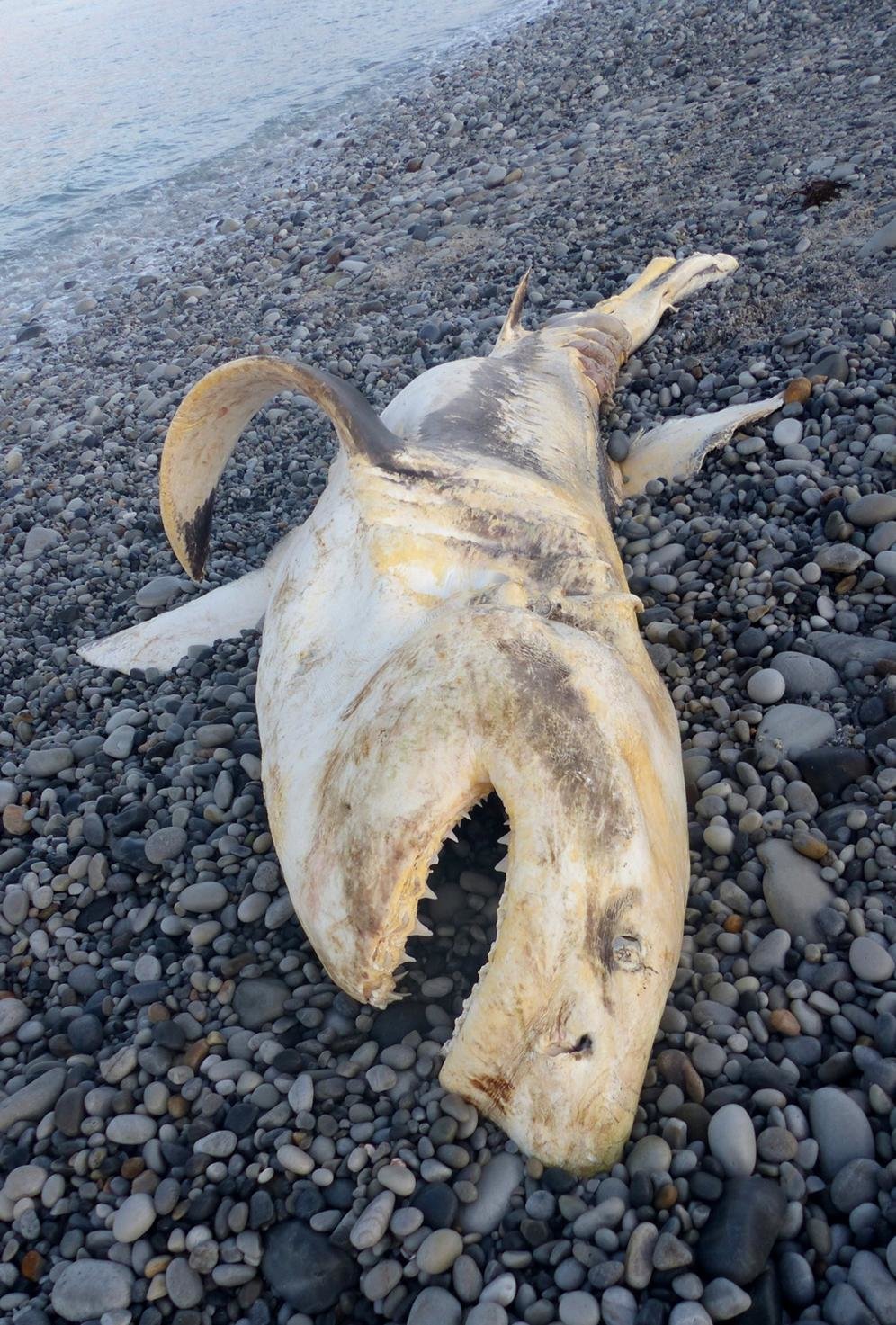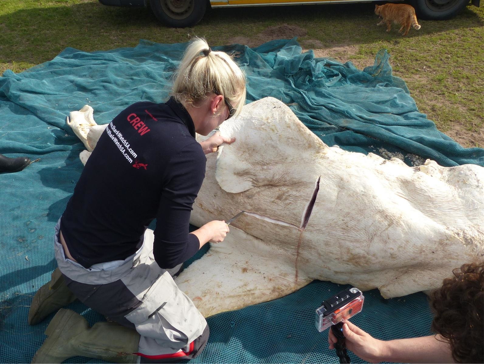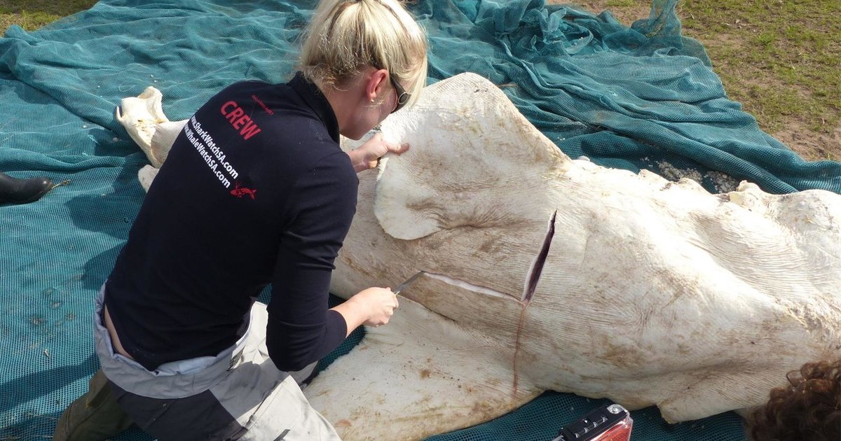 The shark was found washed up at De Gruis, Franskraal. On arriving, Wilfred Chivell and the team managed to confirm that the shark was an adolescent female. The specimen quality was very decomposed and had likely been dead for a number of weeks given that her skin pigmentation was badly bleached. She measured at 3.2meters, pre caudal length. Interestingly the tail was missing, with it she would have measured closer to 3.5m (TL).