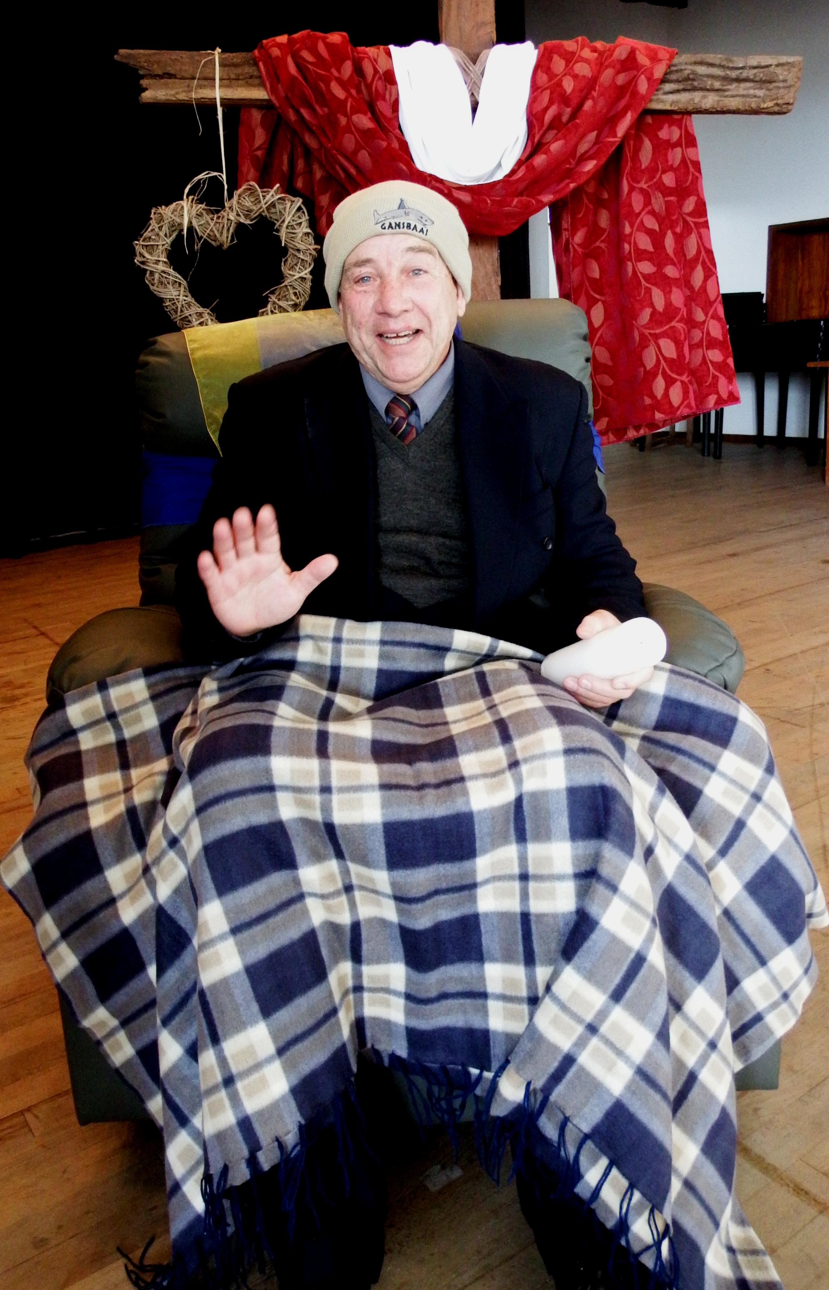 Fransil Kotze het namens die Vroue-diens, met ‘n by-drae deur Herberg-aan-See, ‘n groot en pragtige ge-makstoel as af-skeidsgeskenk aan dr Bobo oor-handig. Die dames het ‘n stappie verder gegaan en vir hom ‘n mussie en ‘n kniekombers as bykomende “toerusting” vir die stoel gegee. Dr Bobo is te Postmansburg in die Noord-Kaapland gebore en deurloop sy skoolloopbaan (sub A tot matriek - 1973) aan die Hoërskool Olifantshoek, waarna hy die kwalifikasies BA Hons: Filosofie en DTh verwerf. Hy is in 1981 gelegitimeer, met sy eerste gemeente te Lambertsbaai (1984-1993). 18 jaar gelede aanvaar hy ‘n beroep na Gansbaai, waar hy op 1 Julie 1997 in sy amp bevestig word. Dr Bobo en sy eggenote, Mickey het drie seuns, Jaco, Jasper en Willie, met al drie wat in Gansbaai grootgeword het. Dr Bobo sal deur gemeentelede, maar ook in die gemeenskap, onthou word as leraar, bedienaar van die Woord, mentor en vriend. Die egpaar beplan om na Lambertsbaai te verhuis, wat ook sy eerste gemeente was.