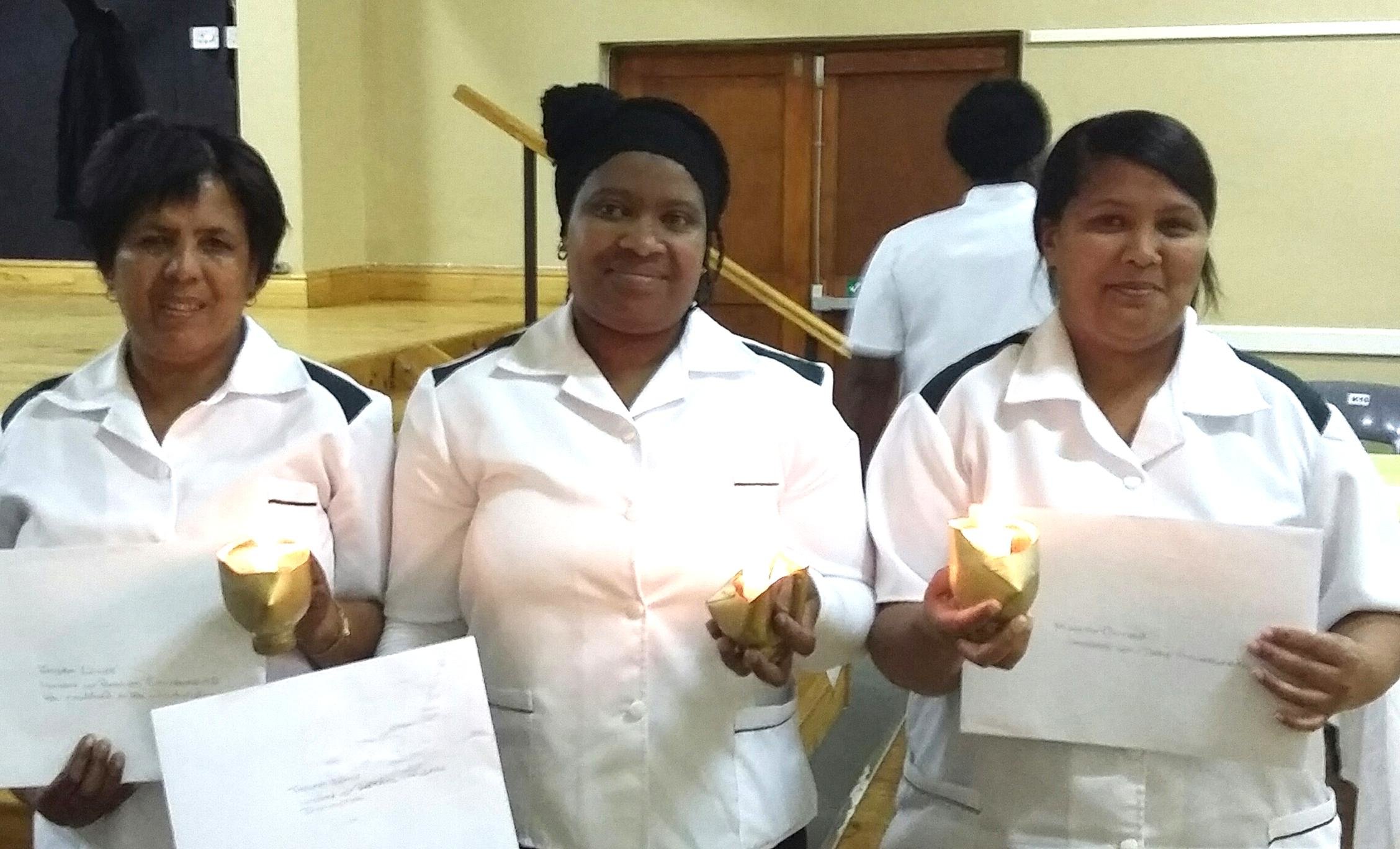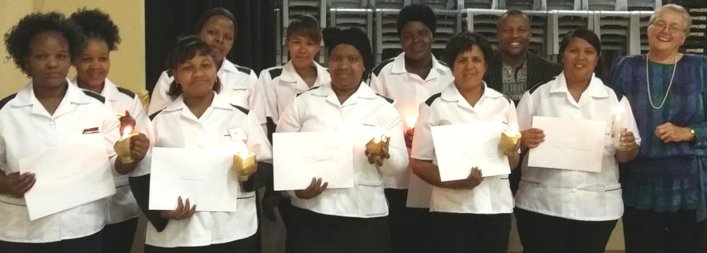 “Nege Tuisversorgers het onlangs hul kursus na 4 maande suksesvol voltooi,” sê Suster Iréne de Waal van Carpe Diem Opleidingsentrum in Caledon. Sy het die kursus in Huishouding en Tuisversorging op Saterdae in Onrusrivier aangebied. “Hierdie Tuisversorgers is nou gereed vir uitplasing en kan u tuis versorg en ook u huishouding hanteer,” sê Suster de Waal. Sy bedank graag vir Huis Lettie Theron, Onrus Manor, Silwerjare Dienssentrum, Huis Breda en Heidehof vir hul ondersteuning met die praktiese blootstelling van die kursusgangers. Suster De Waal is reeds 19+ jaar by opleiding en werkskepping in die Wes-Kaap betrokke en sy kan vir advies rakende pligte, besoldiging en werksure van Tuisversorgers, asook vir bogenoemde kursusse by 028-212-1138 of 071-125-4704 geskakel word, of stuur ‘n e-pos aan haar by carpe-diem@vodamail.co.za.