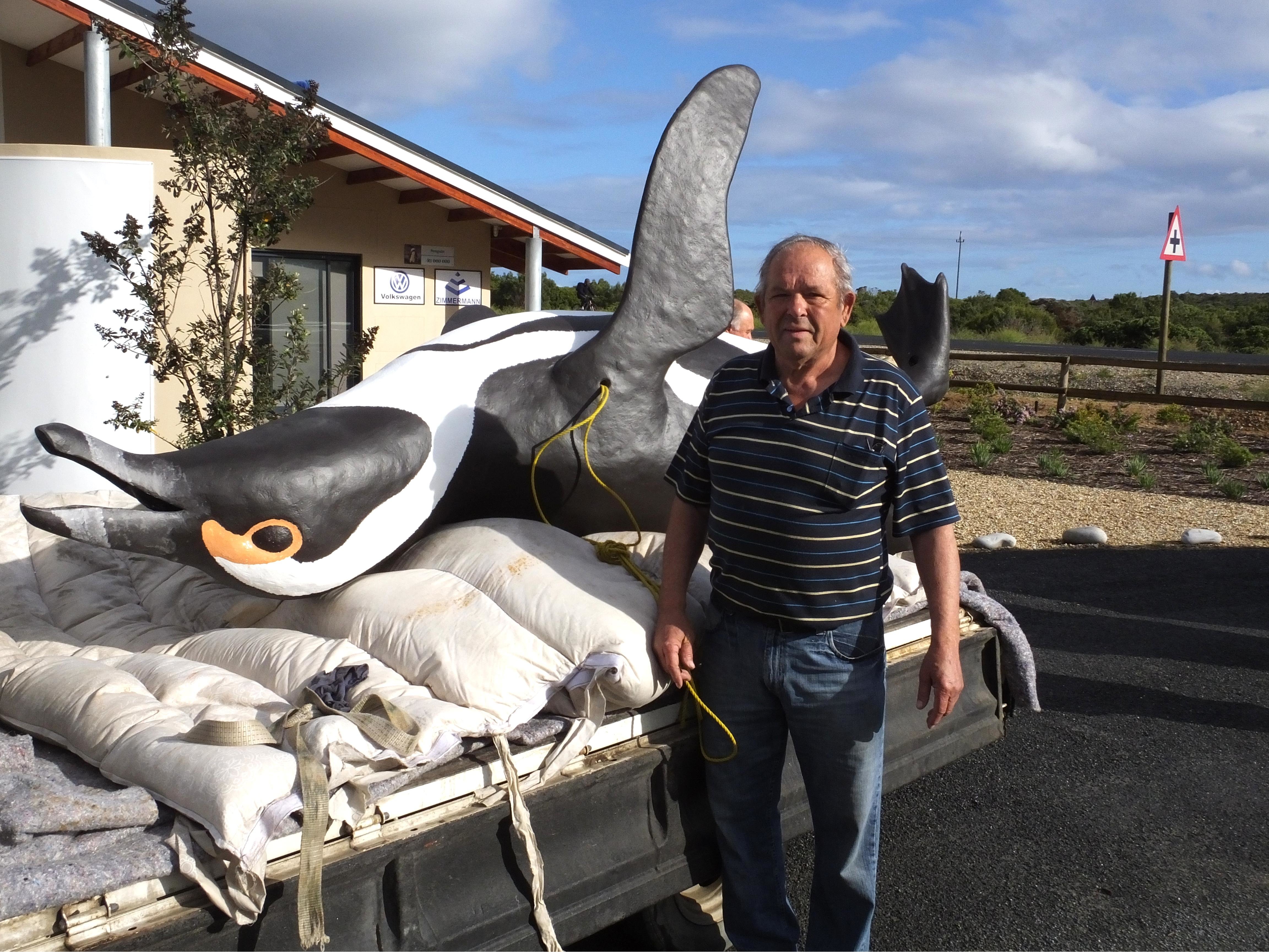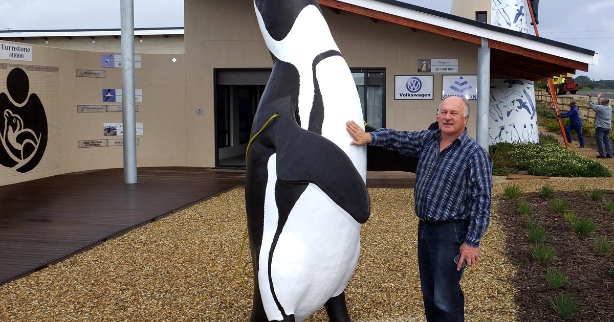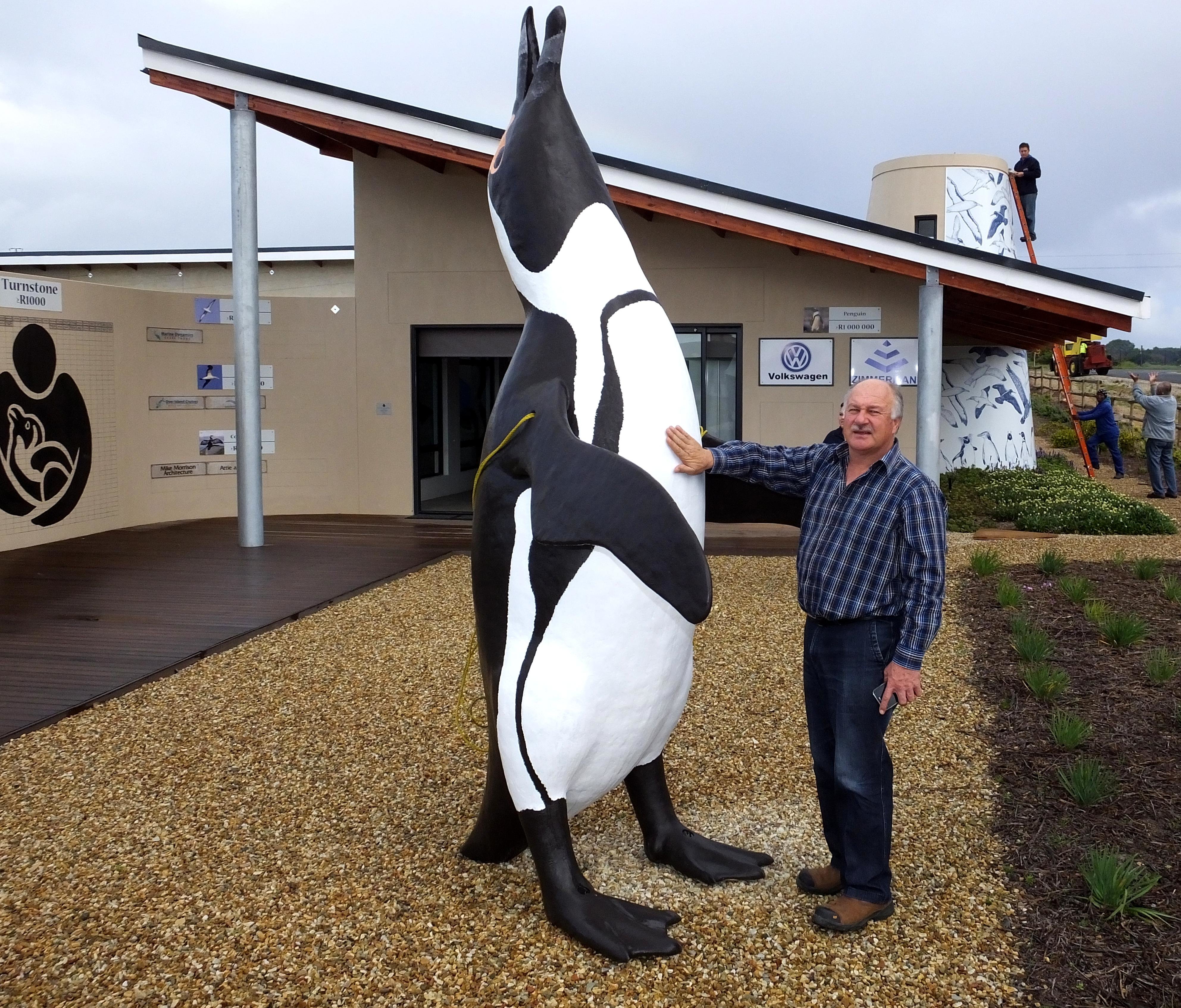 Die enorme Afrika Pikkewyn op die sentrum se dak is deur Piet Pretorius, 'n bekende afgetrede Taksidermis van die Suid-Afrikaanse Museum, gebou. Die pikkewyn staan 3m hoog en ‘n hyskraan moes gebruik word om dit op die sentrum se dak te plaas met dank teenoor Gareth Martinengo van Gamco. Piet het sowat 2 maande deeltyds daaraan gewerk. “Omdat glasvesel vir die finale afronding nie aan ander gebruikte materiaal heg nie, het ek ou Gansbaai Courant’e daarvoor gebruik,” vertel Piet. Hy was ook verantwoordelik vir die aanmekaar hegting van Suzie, die bekende walvisskelet wat aan die Great White House in Kleinbaai se plafon hang.