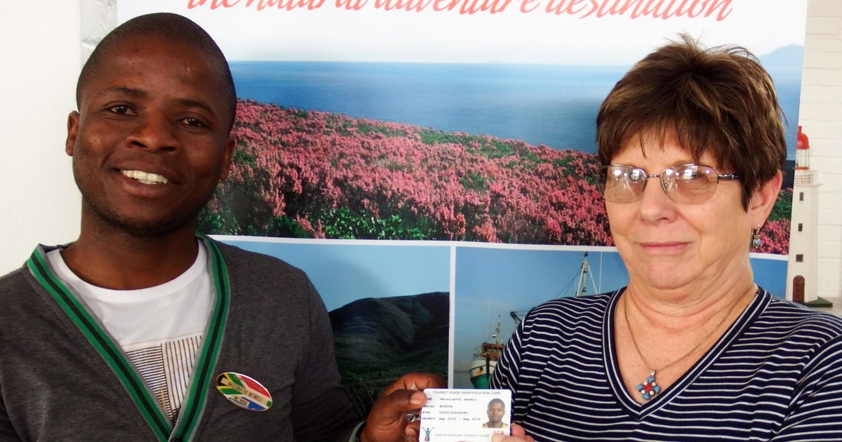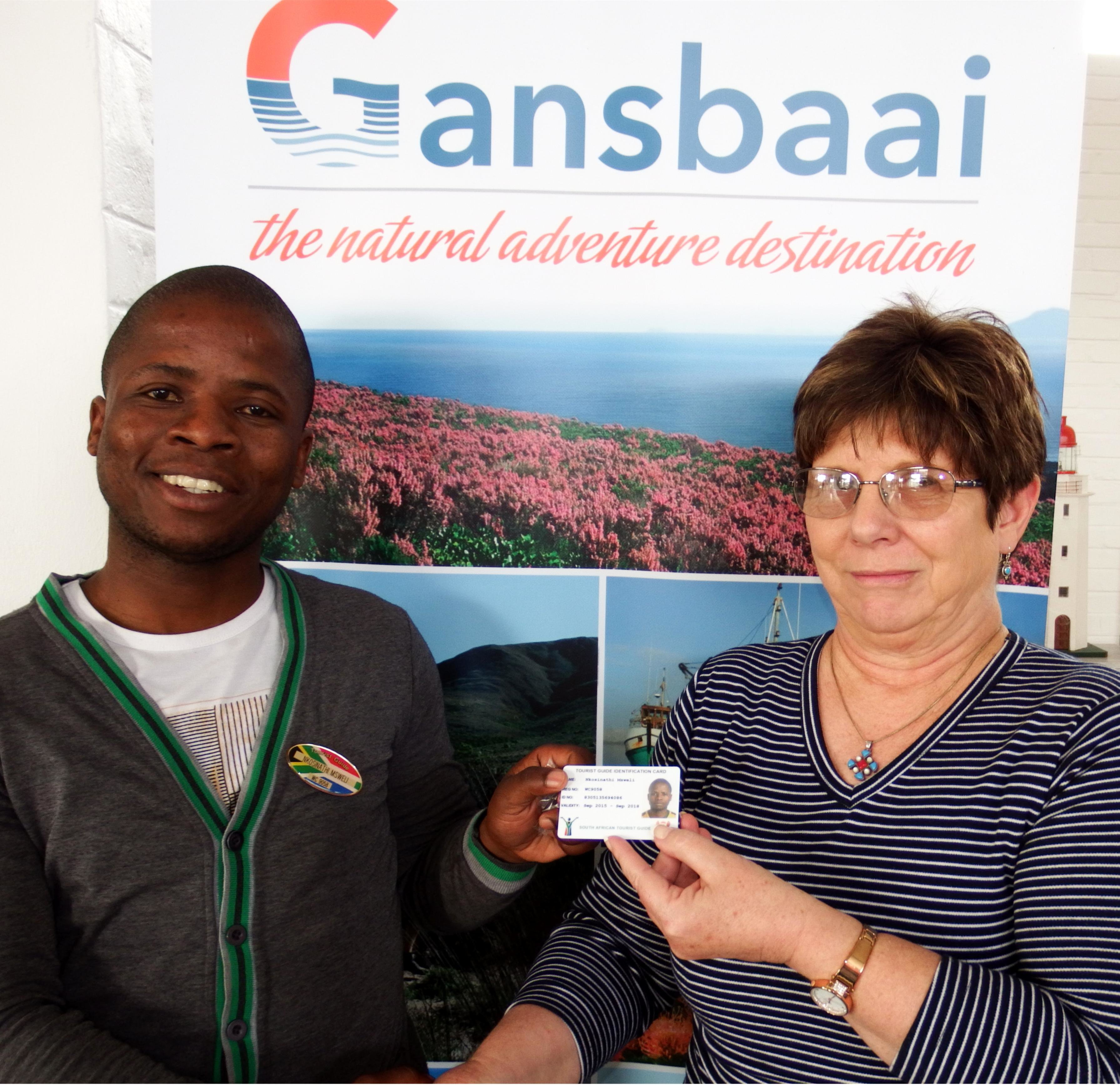 “The Department of Economic Development and Tourism is pleased to confirm your registration as a Tourist Guide. Your Tourist Guide Registration numbert is WC 9058,” lui die inleidende sin van die Departement Ekonomiese Ontwikkeling en Toerisme se brief wat aan Ally Msweli van Gansbaai Toerisme gerig is. Glenda Kitley, Bestuurder: Gansbaai Toerisme, het op Dinsdag, 13 Oktober 2015 Ally se amptelike aanstellingsbrief, lapelwapen en identifikasiekaart aan hom oorhandig. Hy was dit nie te wagte nie en was oorstelp van vreugde. Ally is maar so onlangs as Maart vanjaar as ‘n “intern” in die toerismekantoor aangestel, maar het reeds bewys dat die passie in sy lewe in toerisme en as toergids gesetel is. Reeds met sy aanstelling het Ally gesê deel van sy toekomsvisie is om homself as ‘n toergids te bekwaam - wat hy nou binne die bestek van sowat 7 maande reggekry het. Hy werk in die toerismekantoor, maar sy hoofverantwoordelikheid is om as toergids vir Masakhane-toere op te tree, wat onlangs ook na die Duiwelsgat Staproete uitgebrei het. “Ek sien Ally as ‘n ware ambassadeur vir Gansbaai en hy is altyd gretig om meer te leer en meer te doen,” het Glenda tydens ‘n vorige onderhoud gesê.