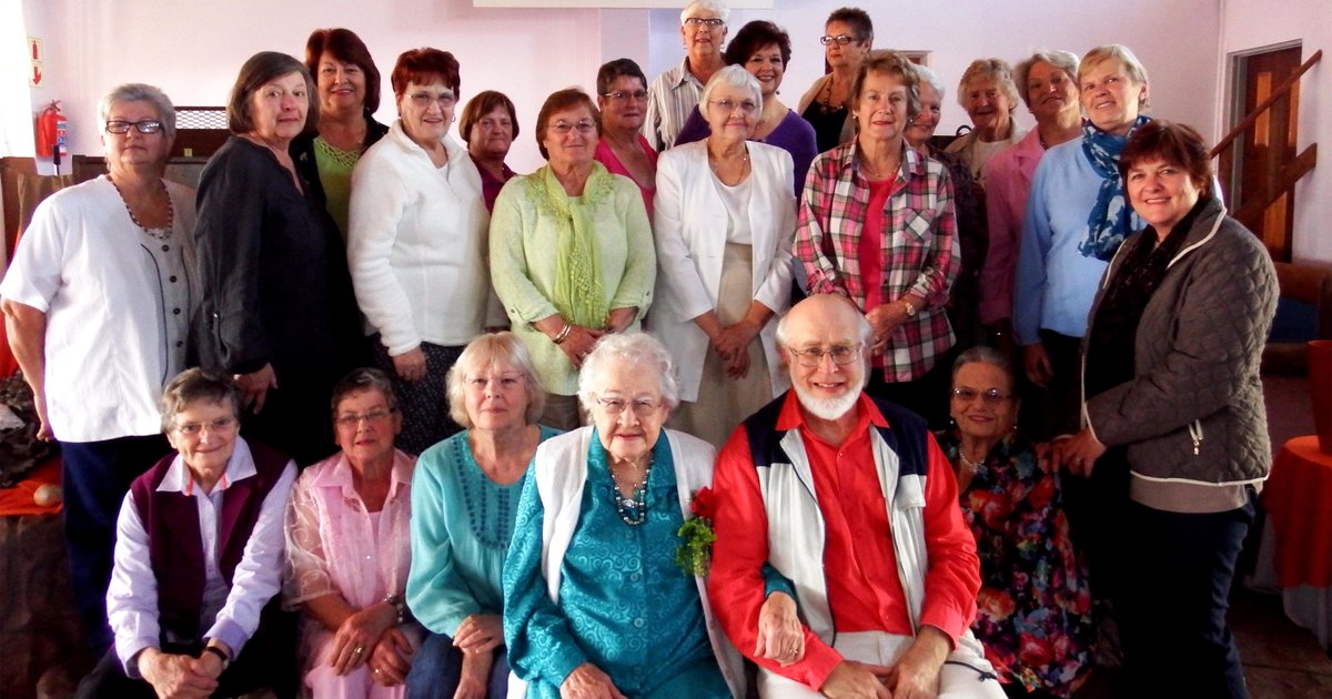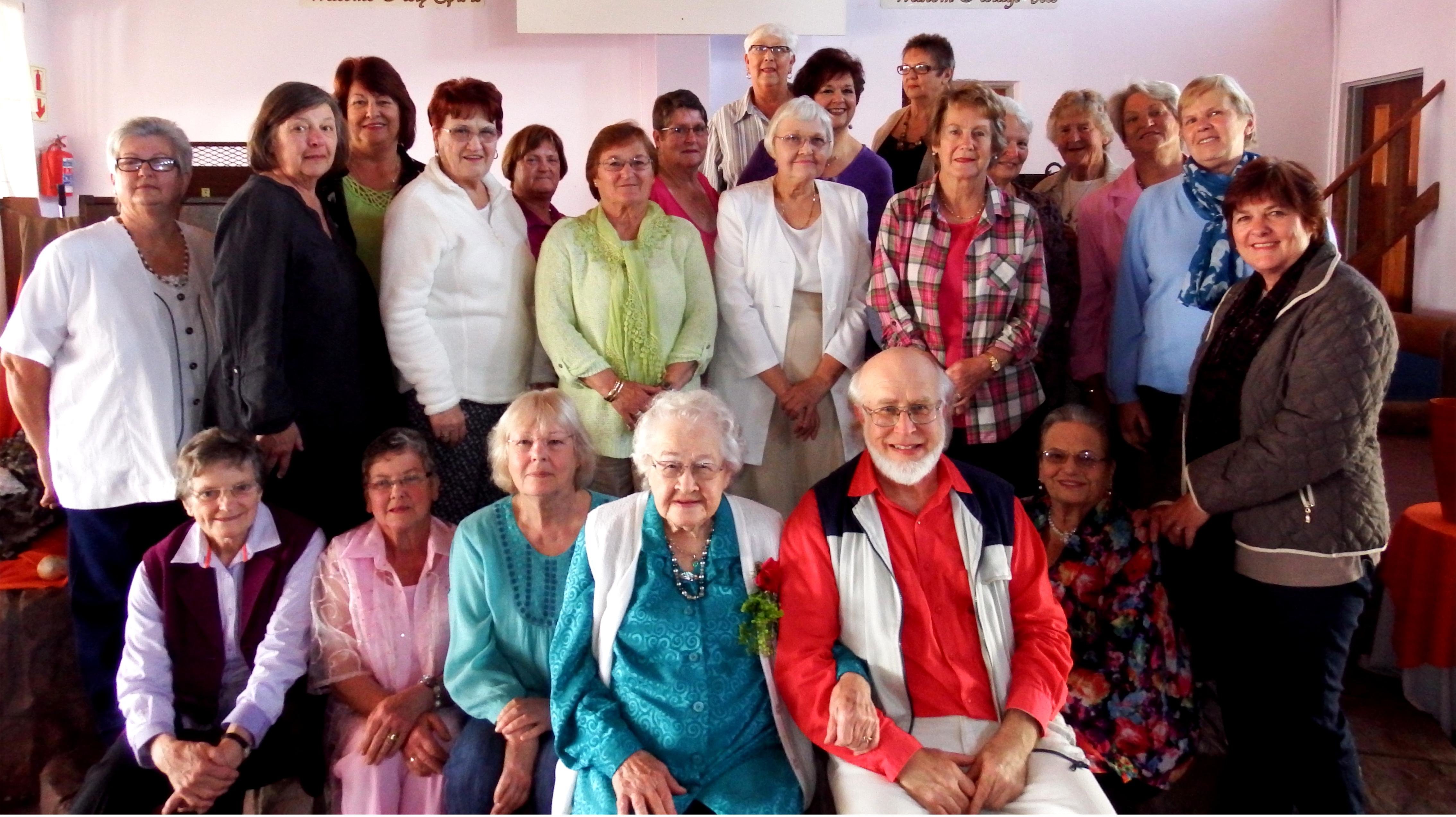Die lede van die Laslappiesklub het vir ‘n behoorlike partytjie in Lede in Christus se saal gesorg, waar bykans 25 vriendinne teenwoordig was. Tannie Winnie sit 4de van links, langs haar seun, Dr AW Steenkamp, op die groepfoto.