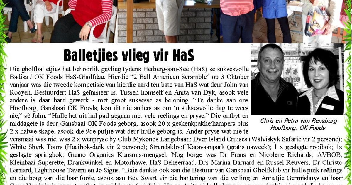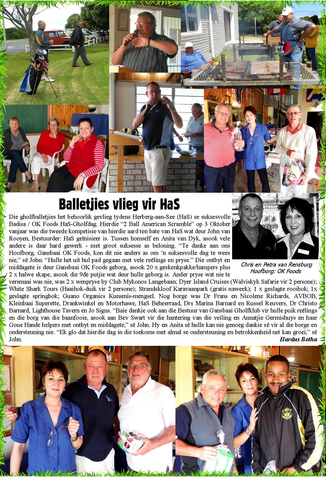 Die gholfballetjies het behoorlik gevlieg tydens Herberg-aan-See (HaS) se suksesvolle Badisa / OK Foods HaS-Gholfdag. Hierdie “2 Ball American Scramble” op 3 Oktober vanjaar was die tweede kompetisie van hierdie aard ten bate van HaS wat deur John van Rooyen, Bestuurder: HaS geïnisieer is. Tussen homself en Anita van Dyk, asook vele andere is daar hard gewerk - met groot suksesse as beloning.