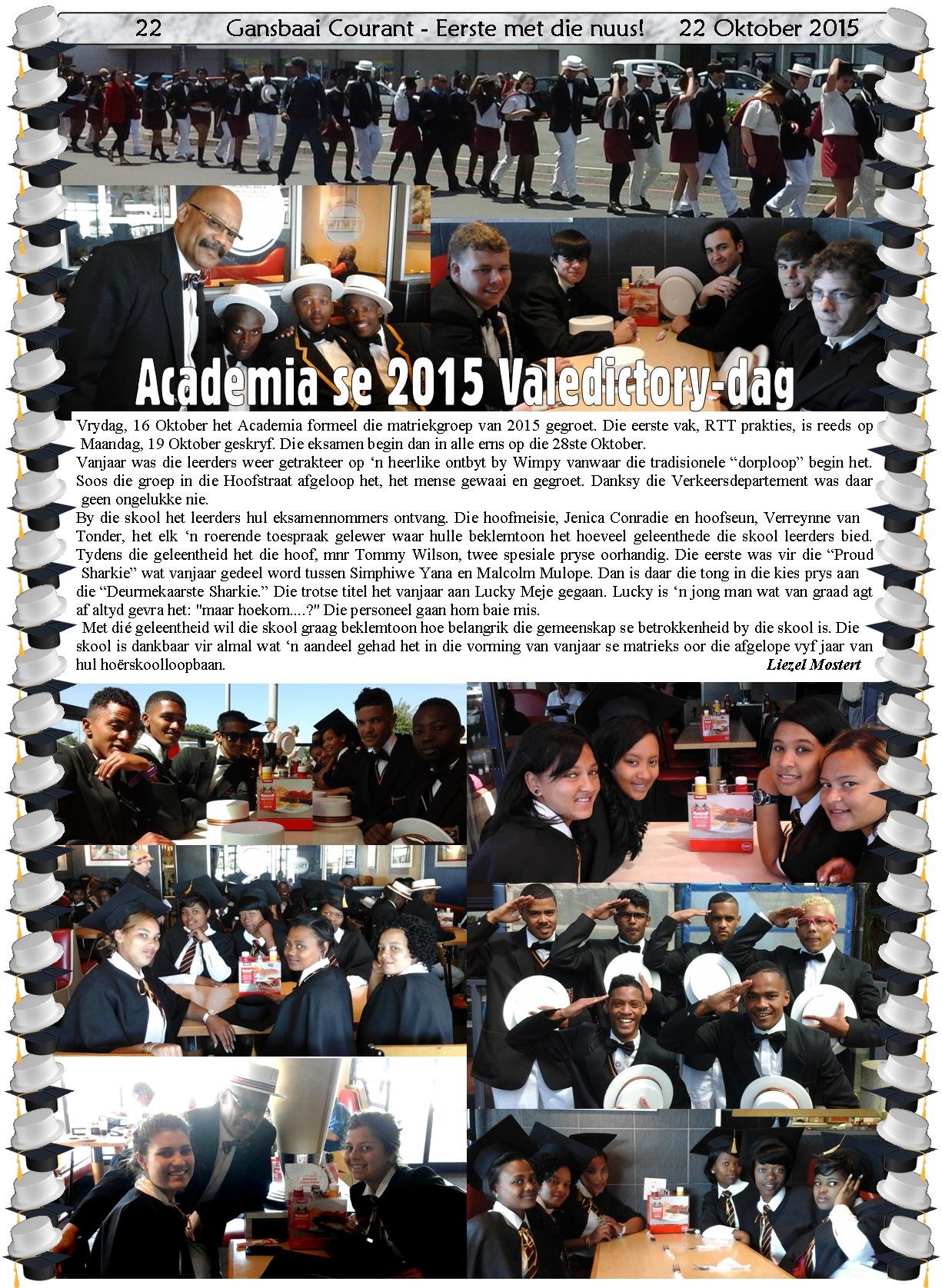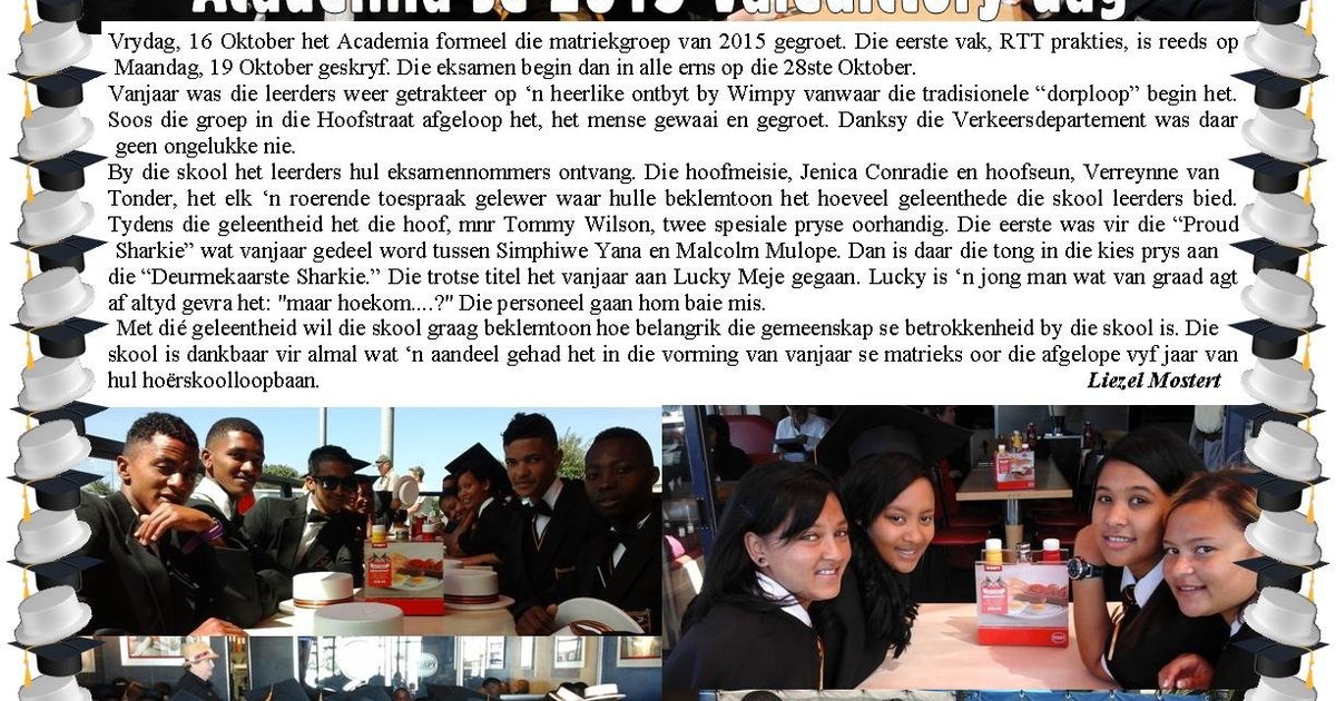 Vrydag, 16 Oktober het Academia formeel die matriekgroep van 2015 gegroet. Die eerste vak, RTT prakties, is reeds op Maandag, 19 Oktober geskryf. Die eksamen begin dan in alle erns op die 28ste Oktober.