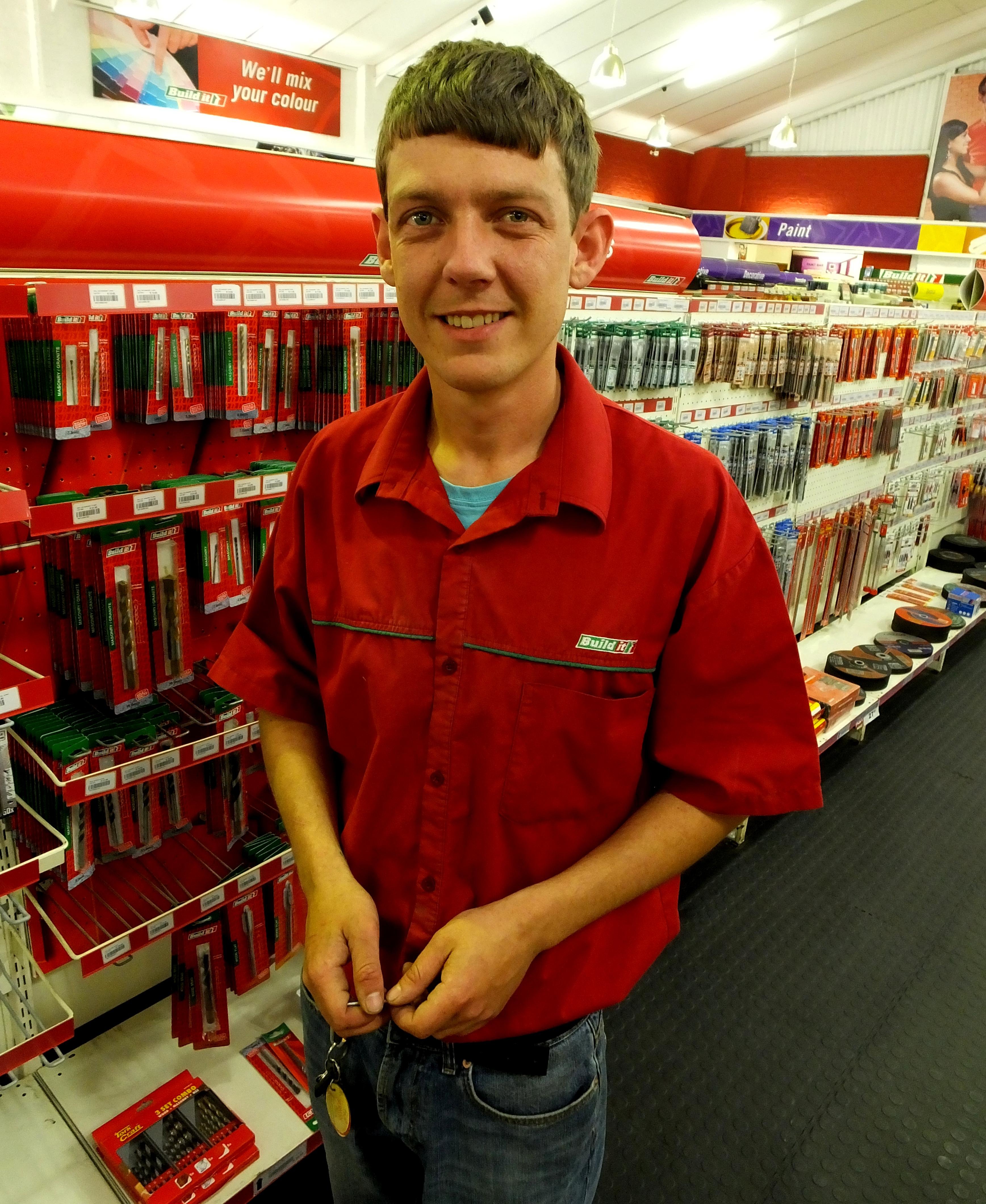 'n Winkeldief het sy rieme verlede Woensdag by Built It styfgeloop toe 'n winkelassistent, André Blomerus, hom herken het nadat die bestuur hulle vroeër teen die dief gewaarsku het. "Ek het die man die winkel sien verlaat en hom genader. Hy het egter weggehardloop en ek het hom agternagesit. Hy is 'n baie lang man en terwyl ek hom gejaag het, het 'n skraal polisieman skielik by my verby gehardloop. Die dief is gevang en teen 'n polisiemotor vasgedruk en gearresteer.