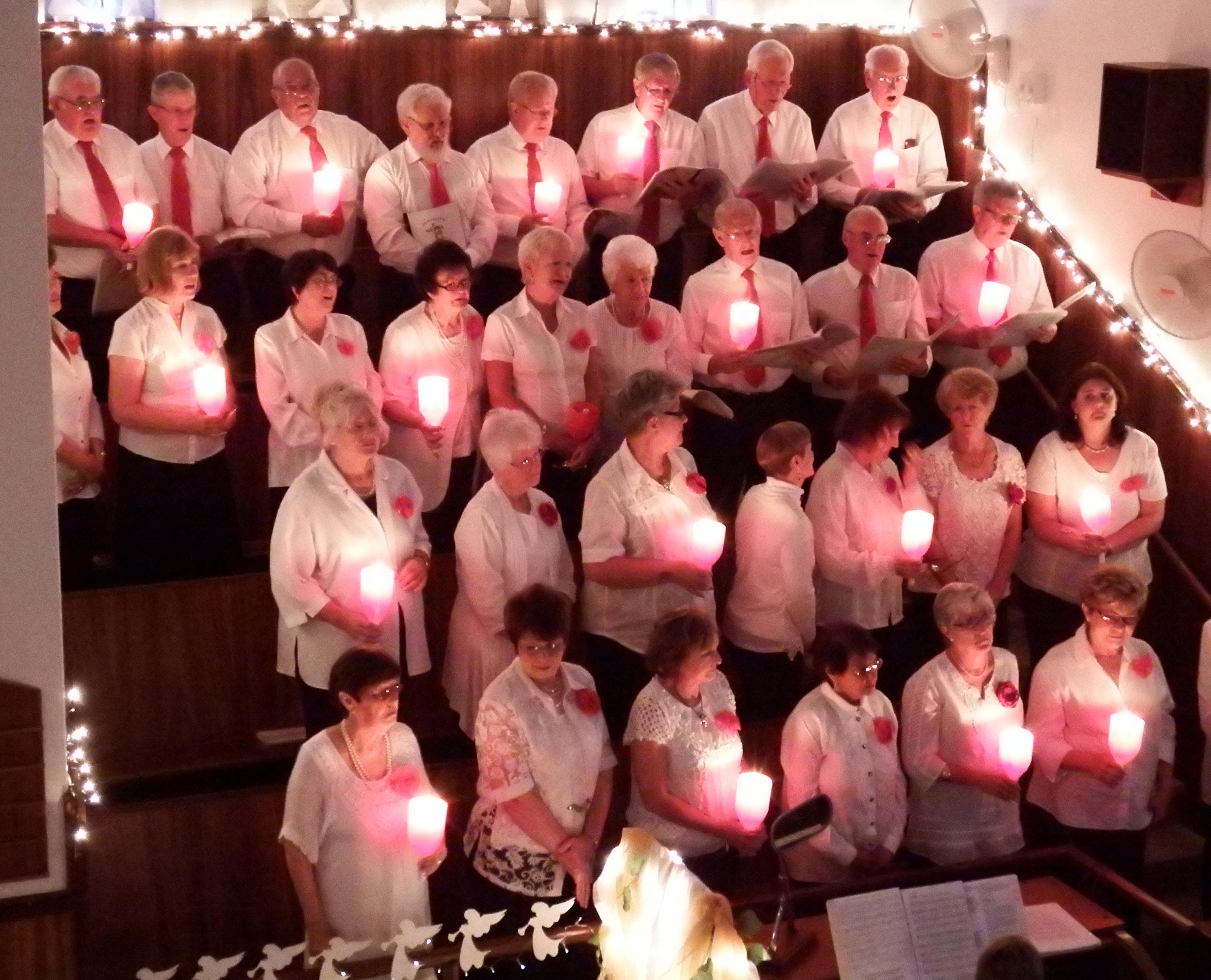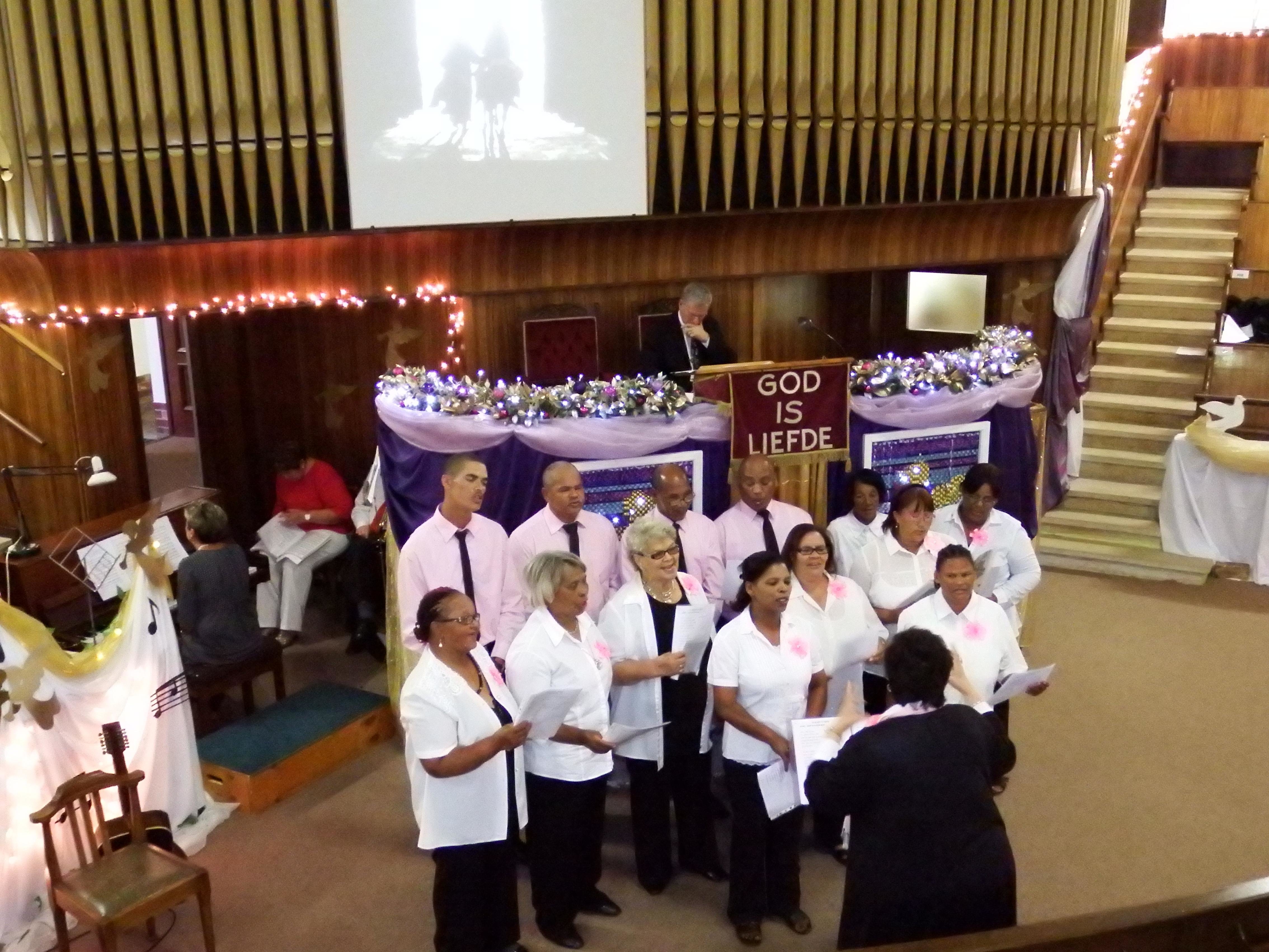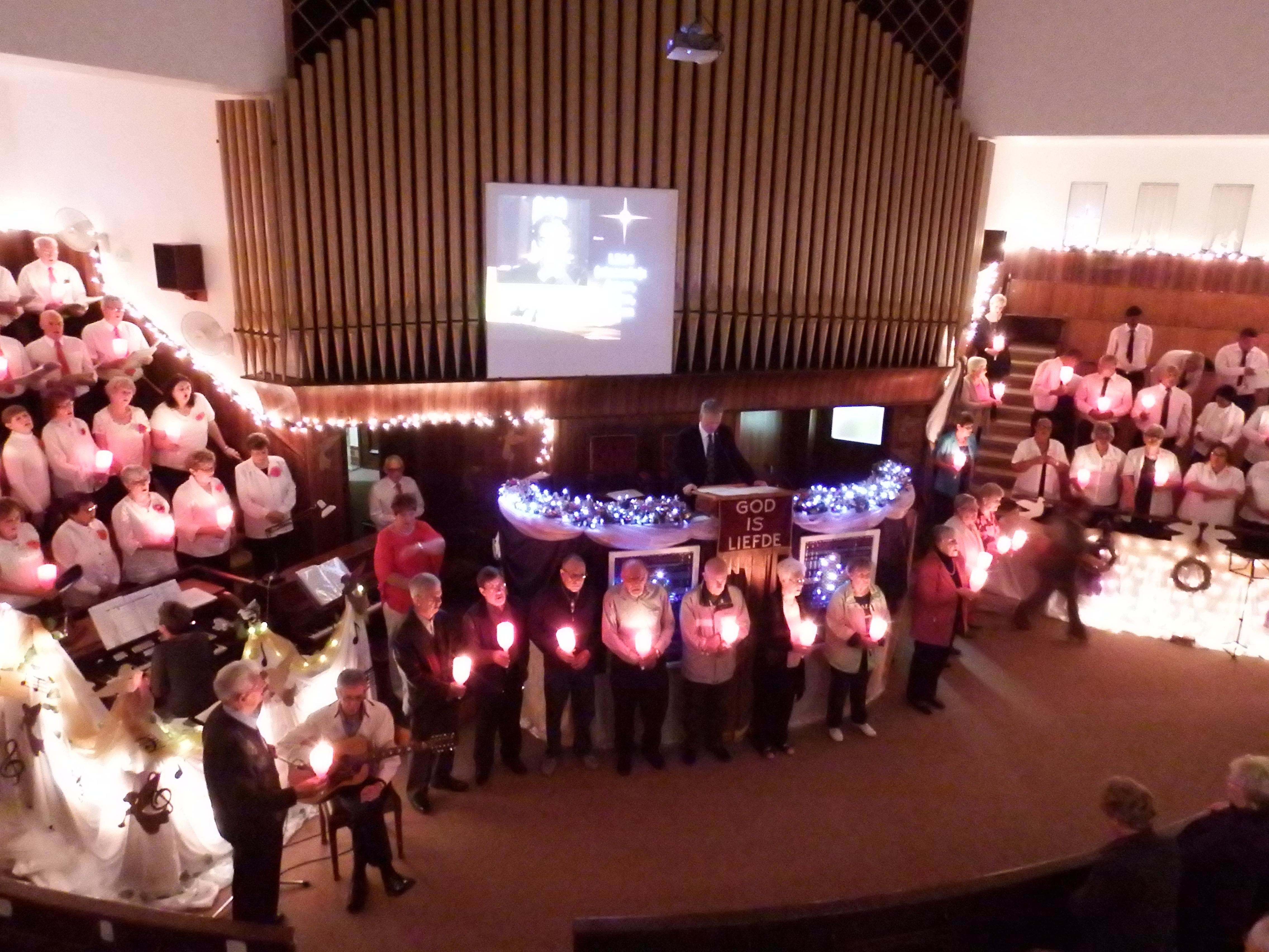 Die VGK Koor, asook die Blompark Mannekoor onder leiding van hul afrigter, Annelie Botha, het eweneens uitstekend met hul pragtige sang sonder enige begeleiding bygedra tot ‘n geestelike atmosfeer. Ds Willie Kotze het die voorlesings, hoofsaaklik op die Lukas Evangelie gebaseer, afwisselend saam met verruklike koor- en gemeentesang hanteer. Tydens die sing van “Met Middernag” en “Stille Nag” het etlike lidmate met brandende kerse in rooi houers na vore gestap, met altwee die kore se lede wat soortgelyke kerse opgesteek het. Met die ligte wat afgeskakel is, is opgemerk hoe vele trane stilweg afgevee word. Ook hier is die aand gesellig in ‘n volgepakte Pretoriussaal met verversings afgesluit.
