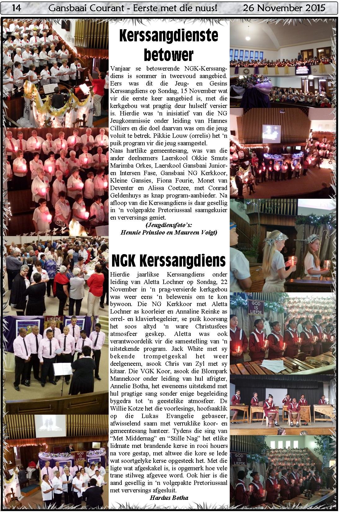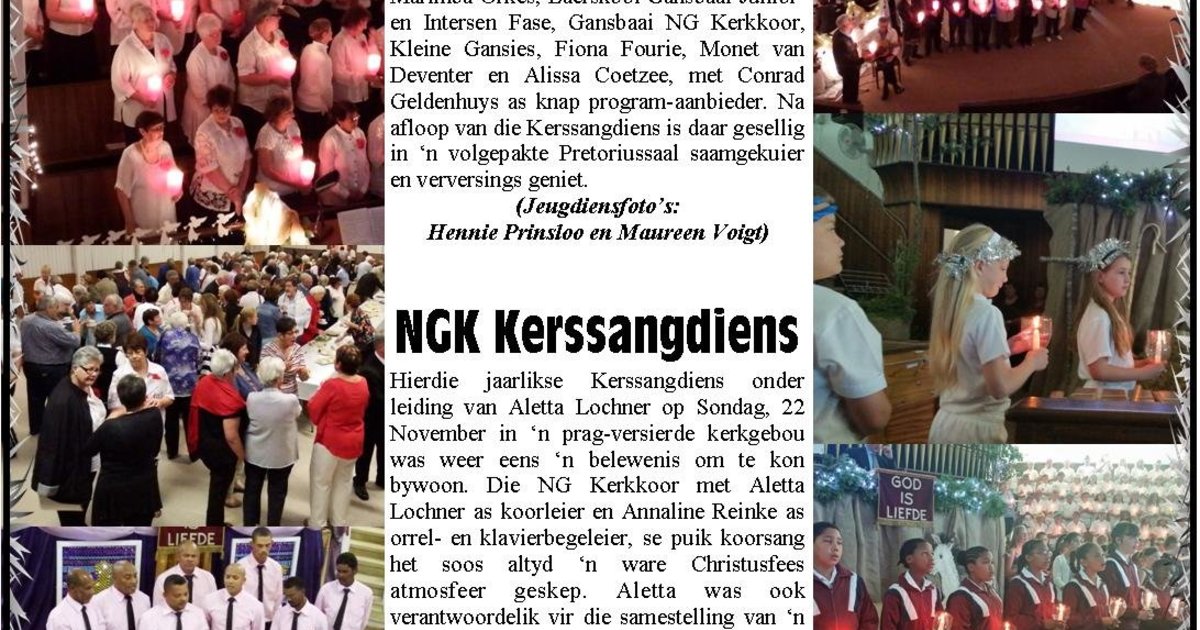 Vanjaar se betowerende NGK-Kerssang-diens is sommer in tweevoud aangebied. Eers was dit die Jeug- en Gesins Kerssangdiens op Sondag, 15 November wat vir die eerste keer aangebied is, met die kerkgebou wat pragtig deur hulself versier is. Hierdie was ‘n inisiatief van die NG Jeugkommissie onder leiding van Hannes Cilliers en die doel daarvan was om die jeug voluit te betrek. Pikkie Louw (orrelis) het ‘n puik program vir die jeug saamgestel.