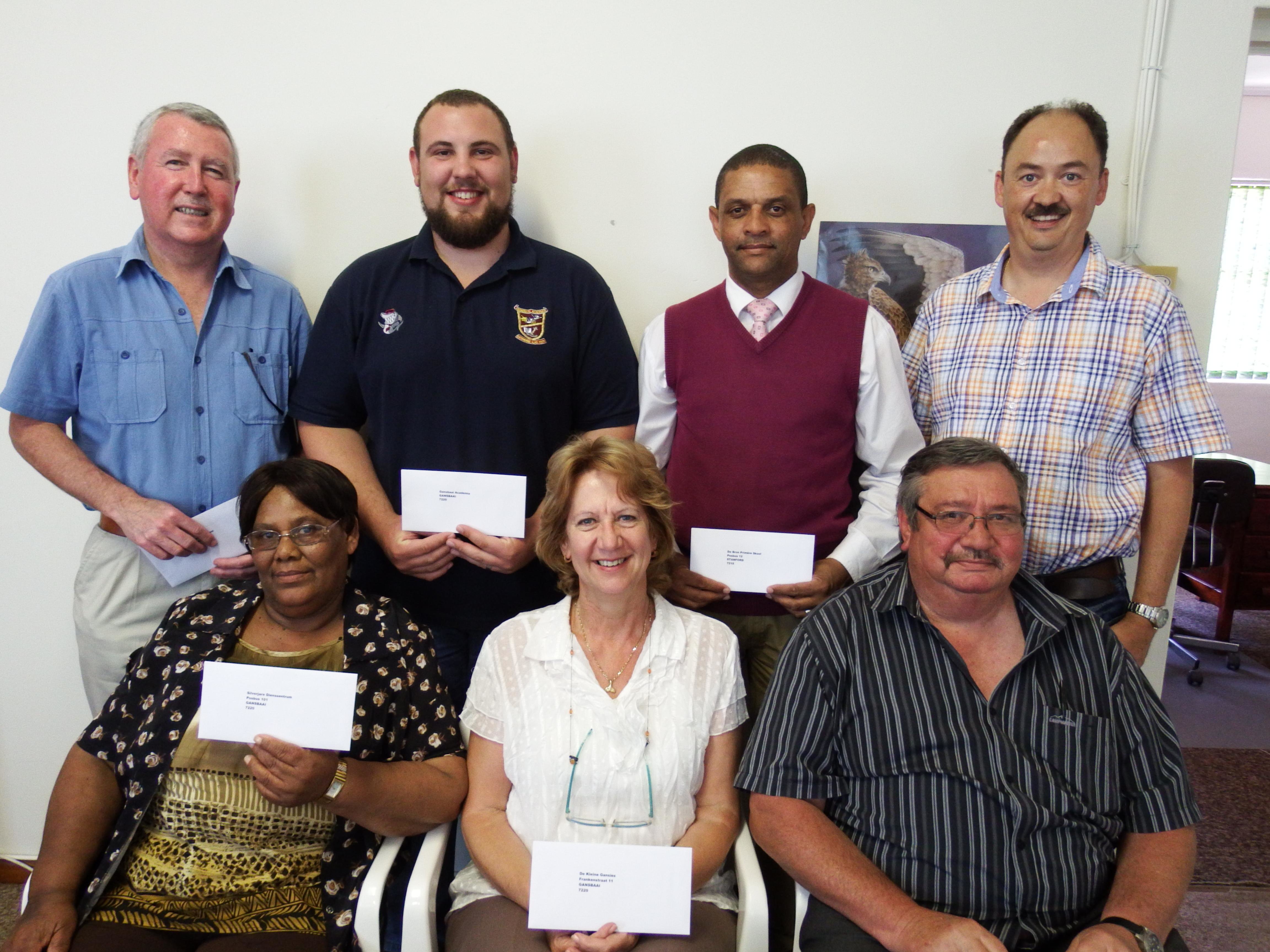 Vanjaar is R142,000 aan die volgende 8 instansies (verteenwoordigers in hakkies), oorhandig (alfabeties): De Kleine Gansies Kleuterskool (Lanita Marais); Gansbaai Academia (Gericke van Eck); Gansbaai Primêr (Tommy Volkwyn); Herberg-aan-See Tehuis vir Bejaardes (John van Rooyen); Laerskool Die Bron (Lionel Pedro); Laerskool Gansbaai (Eben van der Merwe); Masakhane Primary School (Mdini Maxwell); Silwerjare Dienssentrum (Magrieta Adams). John van Rooyen, Bestuurder: Herberg-aan-See, het “as die skool met die oudste leerders”, almal se opregte waardering aan Gansbaai Marine oorgedra.