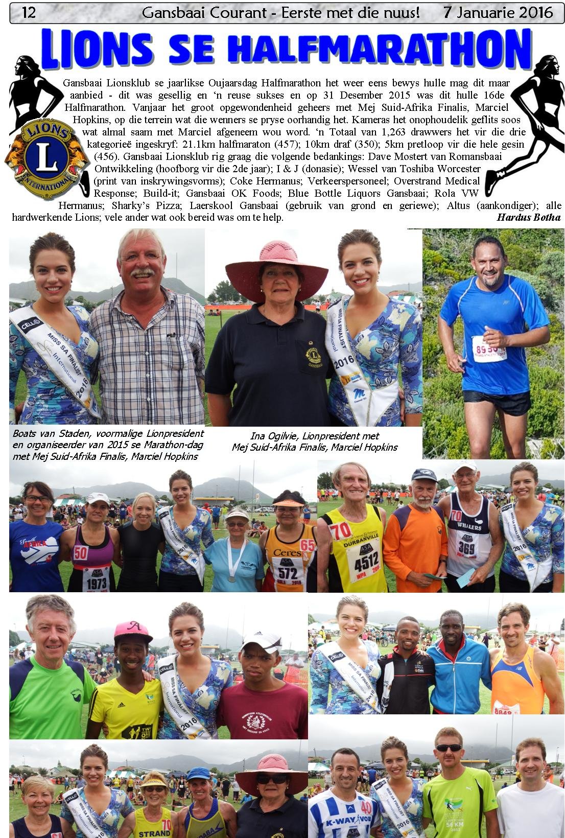 Gansbaai Lionsklub se jaarlikse Oujaarsdag Halfmarathon het weer eens bewys hulle mag dit maar aanbied - dit was gesellig en ‘n reuse sukses en op 31 Desember 2015 was dit hulle 16de Halfmarathon.