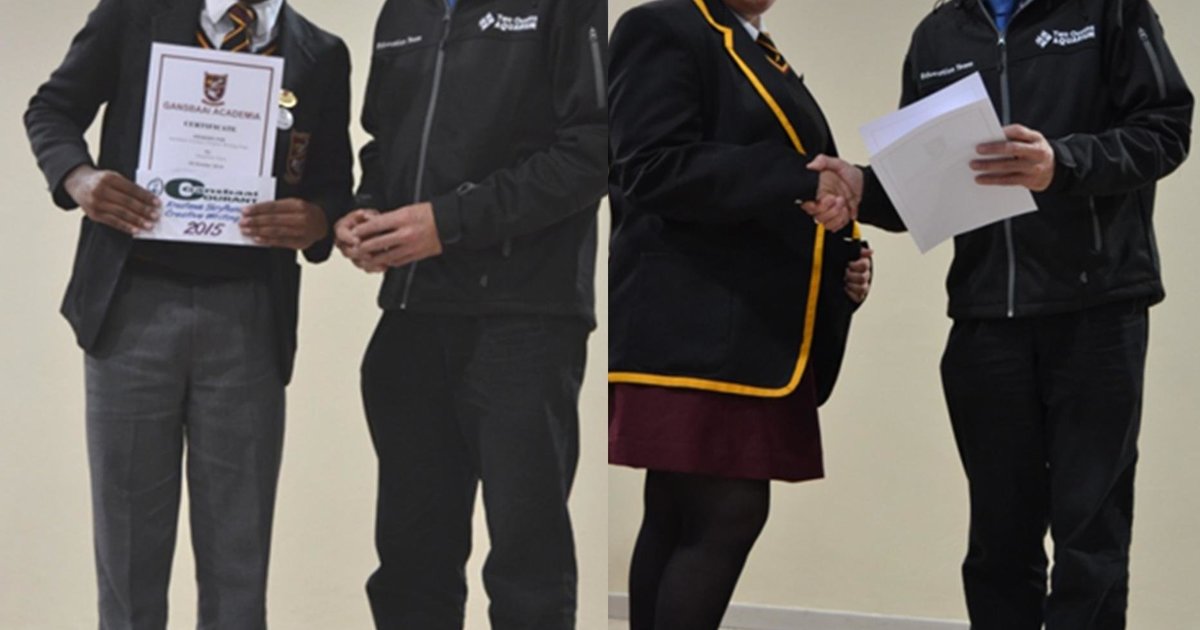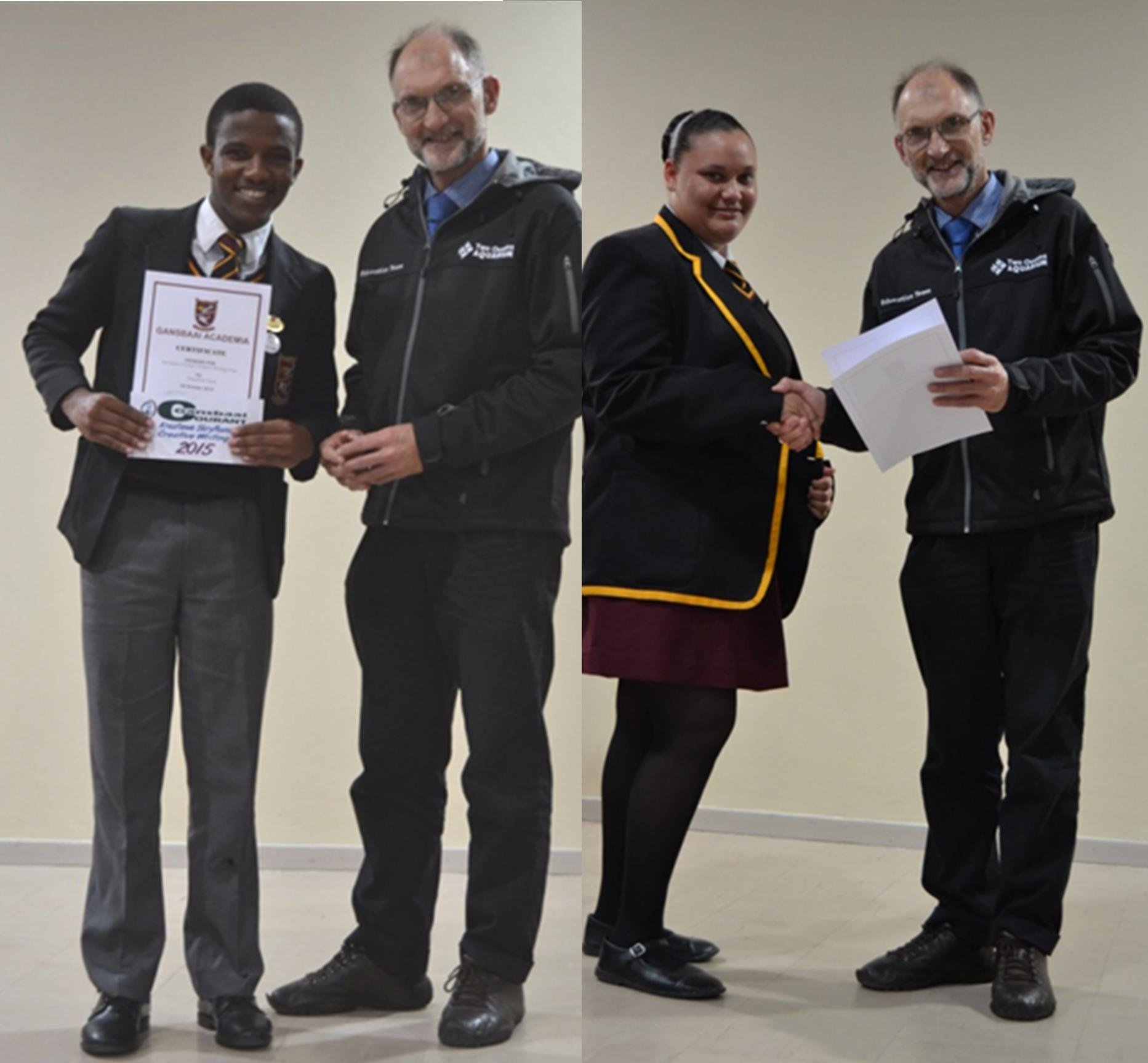 Simphiwe gaan regte studeer. Die jong man het in 2015 die trofee vir die topkandidaat in graad 12 gewen en het ook onder andere in sy vele pryse die Gansbaai Courant Kreatiewe Skryfwerk prys gewen. Simphiwe was die hele jaar onder die top 10 gewees. Hy was ook lid van die VRL. Caren het in 2014, in graad 11, by die skool aangesluit. Sy was van die staanspoor af onder die top 10 kandidate en was algeheel met die eindeksamen derde. Sy is baie opgewonde oor haar toekoms en sy gaan onderwys studeer. Simphiwe en Caren het die Prinsipaal Trofee gedeel in 2015. Mnr Wilson (prinsipaal) het die trofee aan hulle oorhandig omdat albei uitgeblink het in akademie, leierskap, sport en kultuur. Hy het genoem dat hulle die voorbeeld is van trotse Sharkies en die “Sharkie Brand” vergestald.
