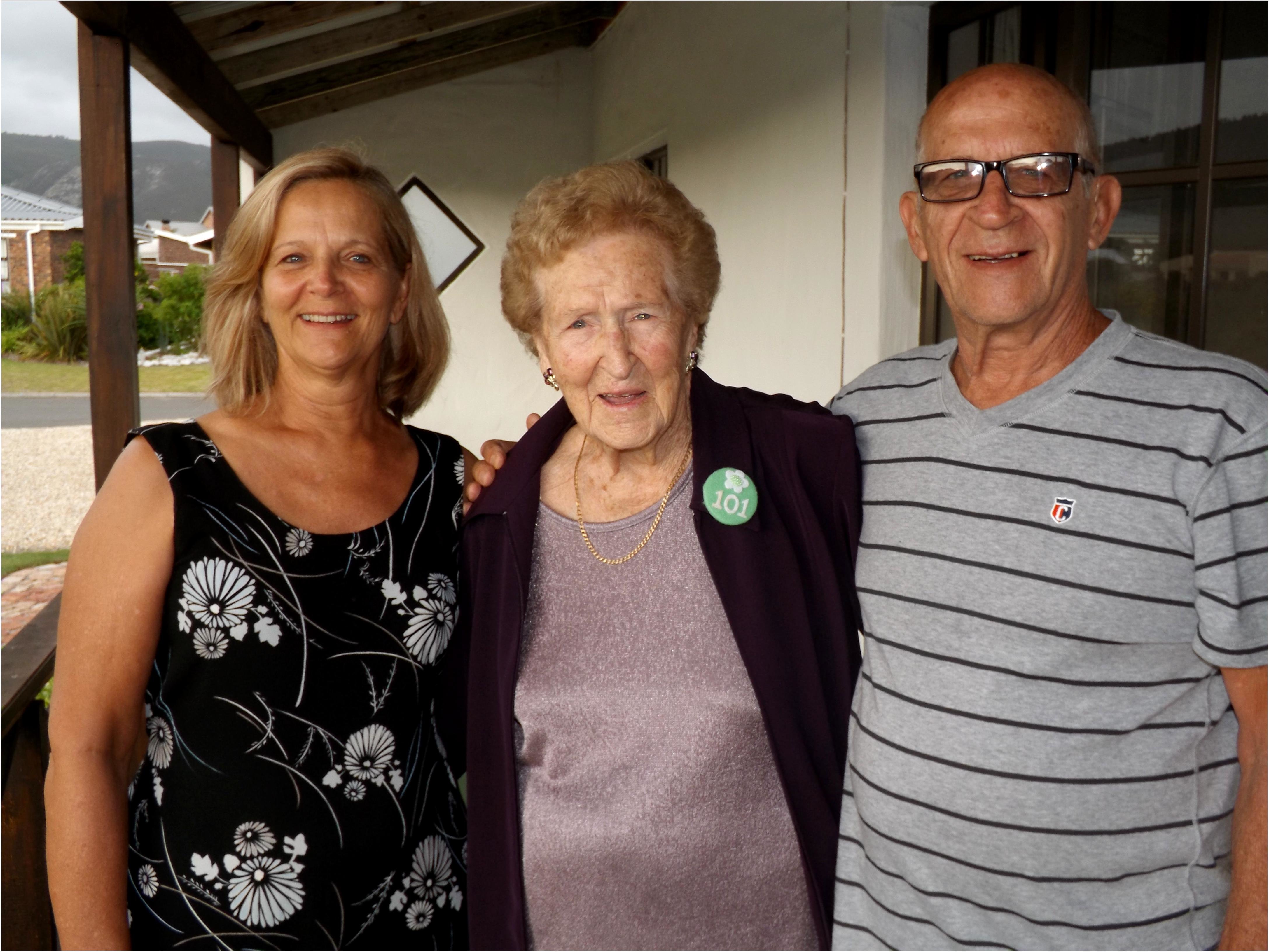 Ná 101 lewensmylpale voer Tannie Mick (Anna) Viviers van Franskraal steeds ‘n normale lewe asof sy 80 jaar jonk is - terwyl sy selfs soos ‘n 80-jarige lyk. “Sy besoek Gansbaai Superspar steeds op ‘n weeklikse basis saam met my vir inkopies, die hare word nog gedoen en gekleur, asook naelversorging,” vertel haar skoondogter, Lulu Viviers. Tannie Mick se verjaardag is verlede naweek in Franskraal gevier, met familielede en vriende van heinde en verre. “Sy het meer as 30 telefoonoproepe ontvang van gelukwense,” sê Lulu.