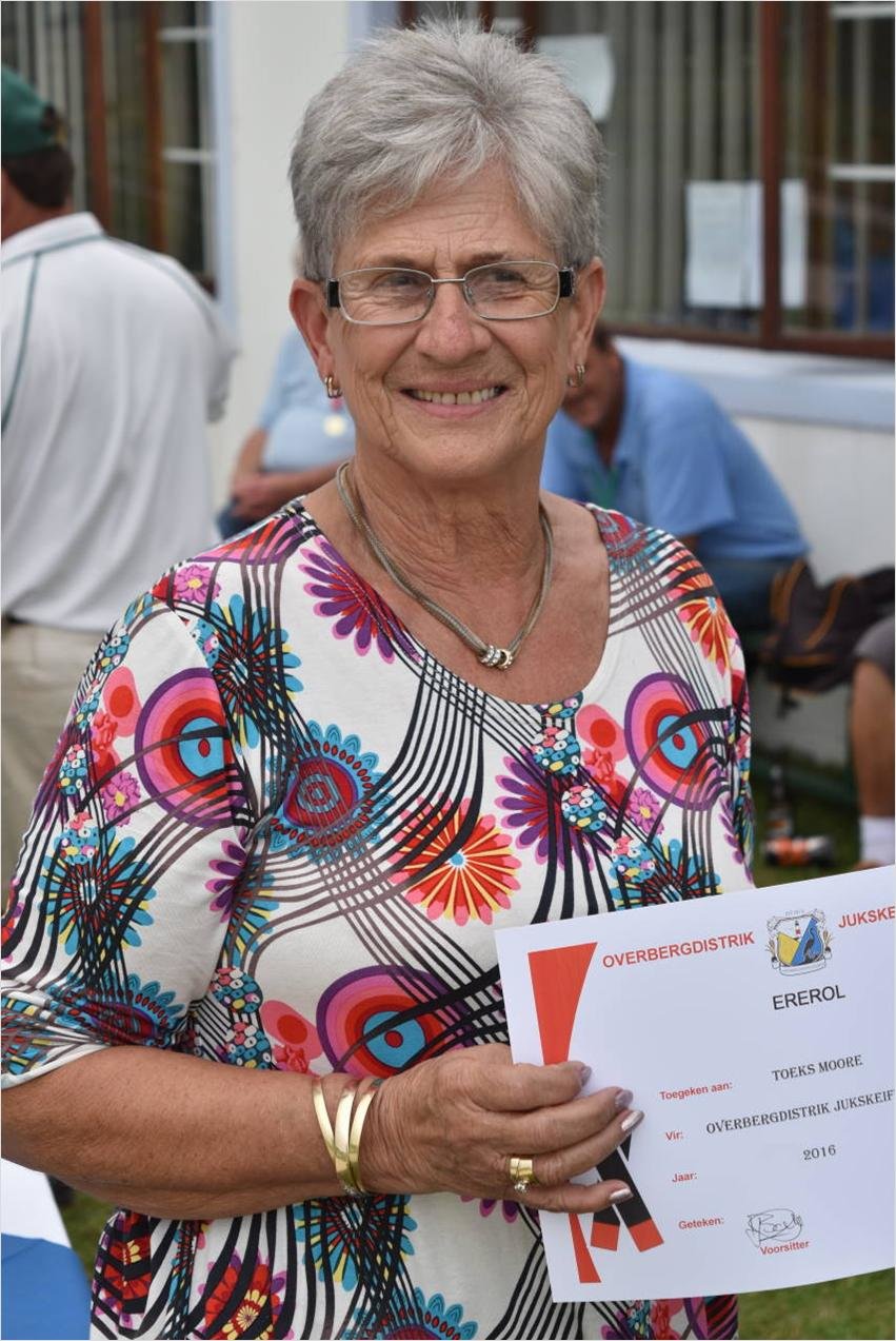 By die prysuitdeling verlede Saterdag is Toeks Moore van Gansbaai vereer vir haar uitmuntende spel & besondere toewyding en diens aan die sport – haar naam sal voortaan pryk op die ererol van die Overbergdistrik Jukskei Federasie. Gansbaai is ook die wenners van die A Afdeling Liga.