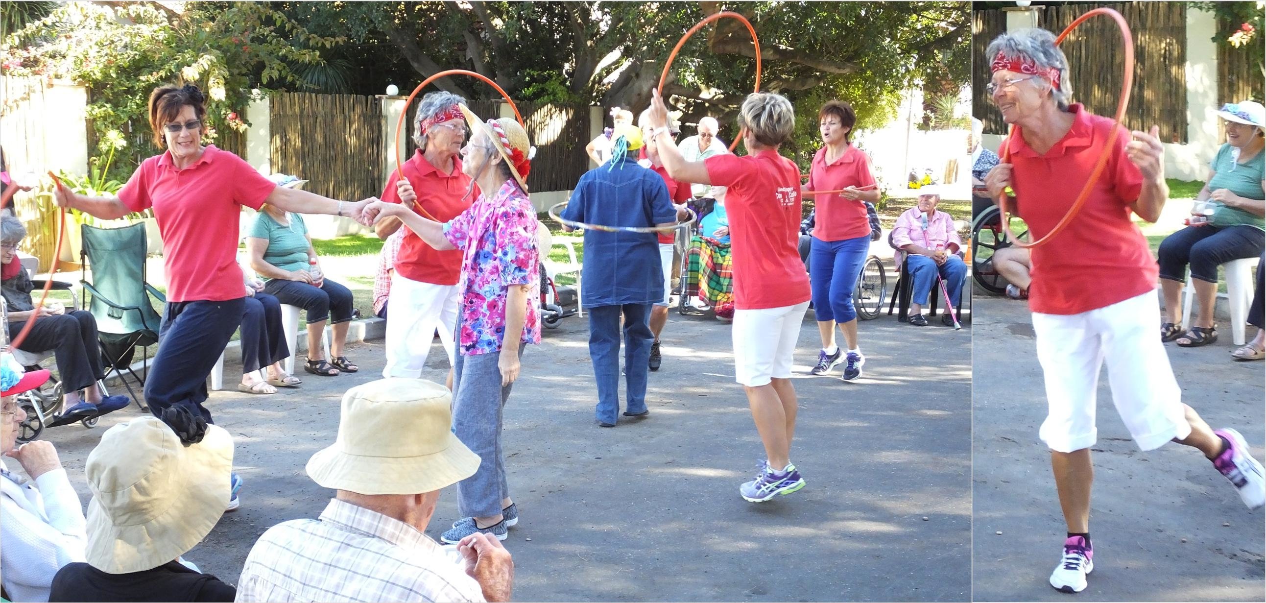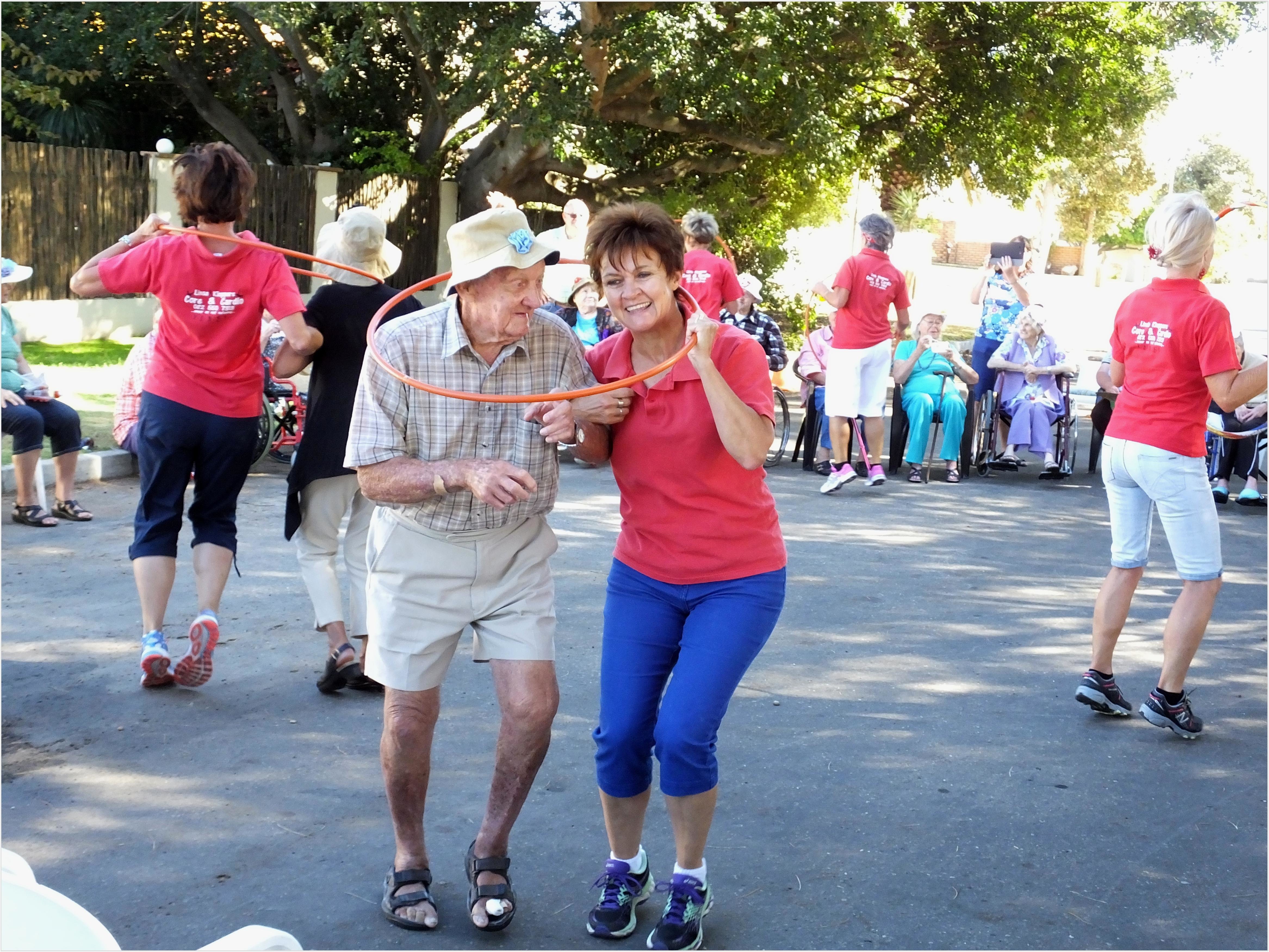 “Hierdie pret het reeds ‘n tyd vooraf plaasgevind toe hulle vir 2 Woensdae na mekaar hul naaldwerkvaardighede afgestof het,” vertel Ute de Milander. “Onder leiding van die stimmulasiegroep van Gansbaai Goue Hande het hulle blomme van materiaal gemaak met die oog op hul jaarlikse rolstoelstap op 9 Maart. Diegene wat nie kon stap nie, is deur gewillige helpers in rolstoele gestoot. Die verkeerspolisie het strate gesluit en almal het gestap tot bokant die hawe. Daar aangekom, kon die uitsig bewonder word, terwyl ‘n welkome koeldrank geniet is. Ná die ruskansie is die opdraende pad terug na HaS aangedurf. Daar het Linda Kloppers en haar span gesorg vir ‘n Gym-vertoning aan die inwoners.