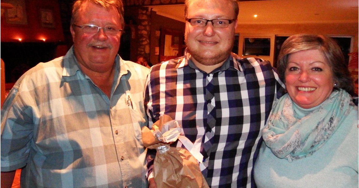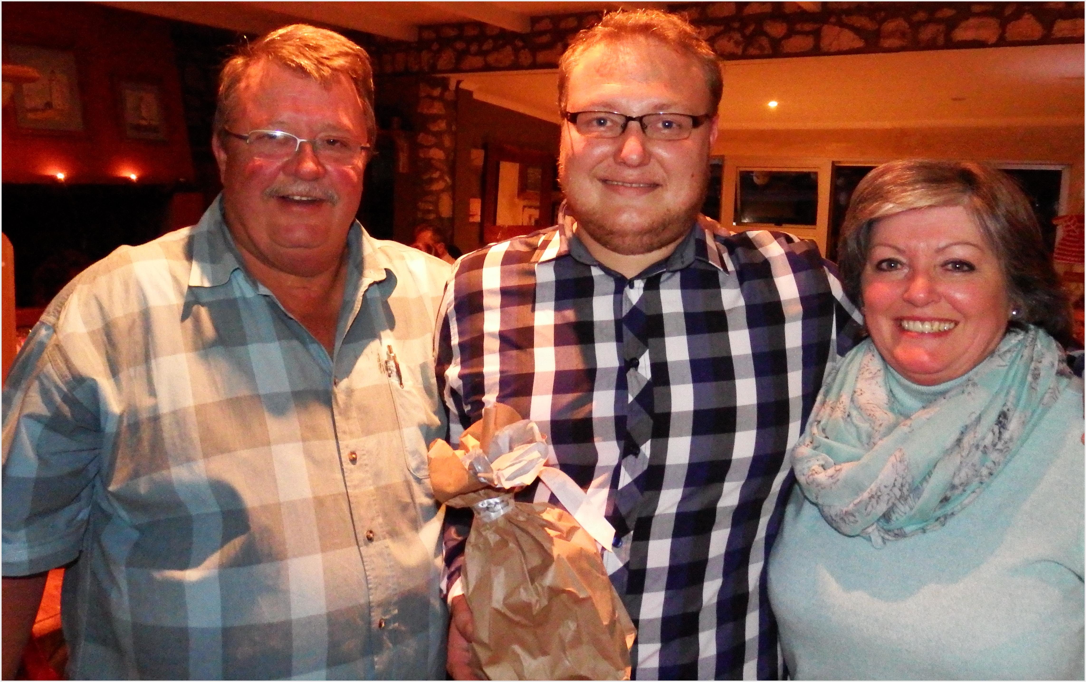 Suna Swart het ‘n blyk van waardering aan Werner oorhandig. Hy was baie beïndruk toe hy die pakkie oopmaak en sien dit is een van Gansbaai Wynproegilde se pragtige voorskote met die gilde se embleem daarop. “Baie dankie en dit gaan my handig te pas kom,” het Werner gesê.