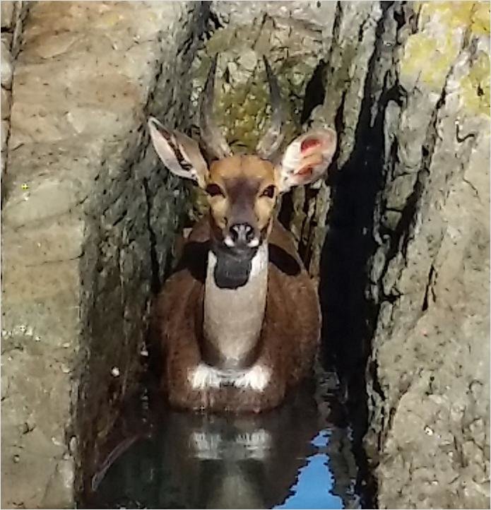 Daarna is Vonnie agter die bokkie aan om hom te probeer uitbring. “Die bokkie was reeds swak en ek kon hom maklik hanteer, behalwe vir ‘n paar keer se val dat my velle waai,” vertel Vonnie. Hy het die bokkie na sy vriend, Norman Kemm in Franskraal gebring, waar hulle eers die bokkie, wat hulle aanvanklik as ‘n duikertjie geïdentifiseer het, in Norman se toegeboude agterplaas vrygelaat het om van die skok te herstel. “Ons het besluit om die bokkie later die aand in die donker vry te laat, aangesien ons naby ‘n bebosde gebied woon,” het Norman gesê. Lees hieronder dat Hennie Otto, asook Sean Privett, die bokkie as ‘n grysbokkie geïdentifiseer het. Die tweede bokkie-verhaal gaan oor ‘n bokkie wat duidelik van seewater hou. Danie en Minette Maree van De Kelders het onlangs so ±10:15 saam met familie seelangs gestap en tussen Skulpies- en Stanfordsbaai gewaar hulle toe ‘n bokkie tussen die rotse in die seewater. Bok-se-kind was egter nie in die moeilikheid nie. “Die bokkie, wat ek as ‘n bosbokrammetjie geïdentifiseer het, het in ‘n skeur by die rotse inbeweeg,” vertel Danie. “Dit het nogal gelyk asof hy die seewater geniet het en hy was beslis nie in gevaar nie.” Daar kon rustig ‘n paar foto’s van die bosbokkie tussen die rotse geneem word, voordat hy weer na groener weivelde koers gekry het.