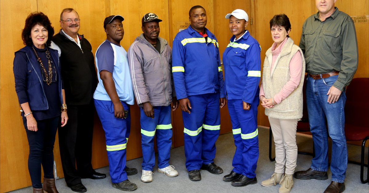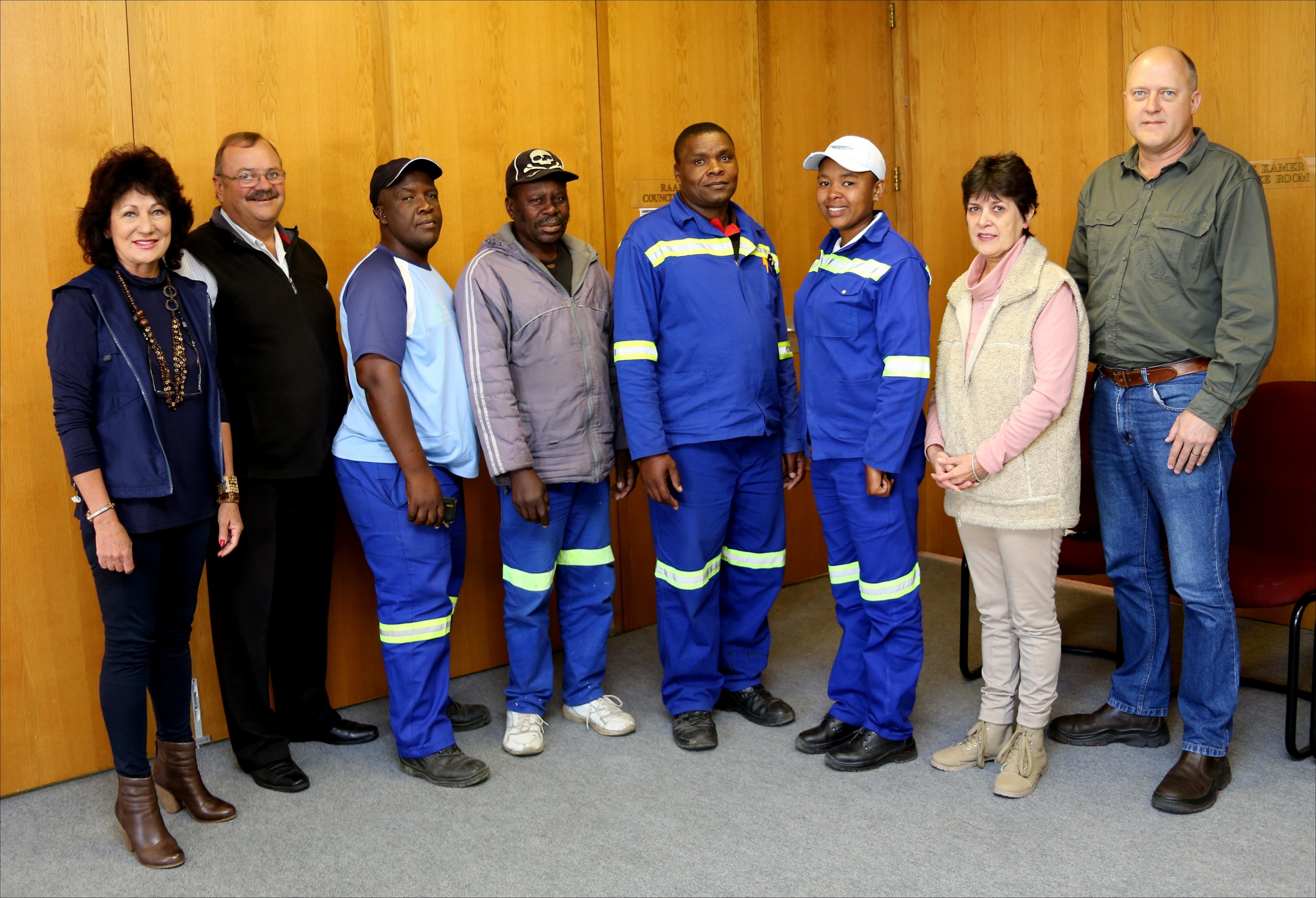 Op die foto is die personeellede wat Langdienssertifikate tydens die onlangse Wykskomitee-vergaderings ontvang het, asook ‘n nuwe aanstelling, met vlnr rdl Riana de Coning, mnr Kat Myburgh (Areabestuurder), PS Hatili (Parke - 15jr), MW Makumsha (Parke - 15jr), M Dunjwa (Strate - 15jr), L Tutu (Nuwe aanstelling - Algemene Assistant: Vaste Afval), DS Goosen (Kliëntediens - 20jr) en mnr Jean de Villiers. JTH Kleynhans (Elektries - 10jr) was afwesig tydens die fotosessie.