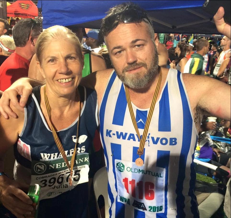 Julia sê sy het haarself bederf met haar vyfstigste verjaardag met ‘n vakansie in Italië en het besluit om vir haar sestigste verjaardag op 1 Junie die Comrades aan te pak. Haar kwalifiserende tyd was elf ure, een-en-vyftig minute en sy is sommer baie trots op haar medalje. “Hierdie was my tweede Comrades, met die eerste een in 2007 wat ek in ‘n baie beter tyd voltooi het,” sê Julia. “Tans voel ek baie goed, behalwe vir seer en stywe spiere.” Julia het reeds gedurende September 2015 vir die 89 kilometer Comrades begin oefen en in Februarie vanjaar het sy vir deelname gekwalifiseer. Ondanks die sowat 22 000 deelnemers, praat Julia met groot lof van die organiseerders se puik reëlings wat deurgaans vlot verloop het.