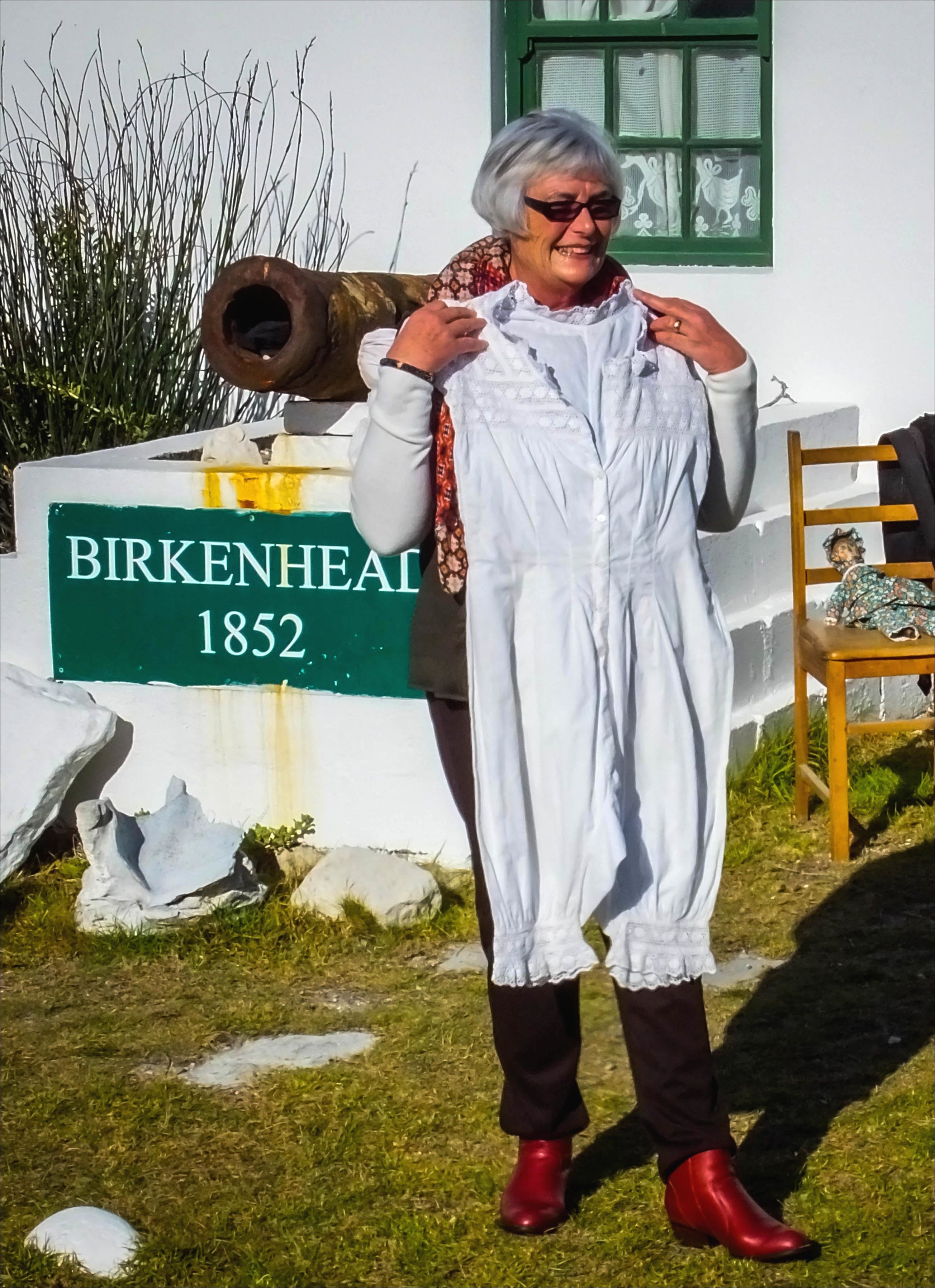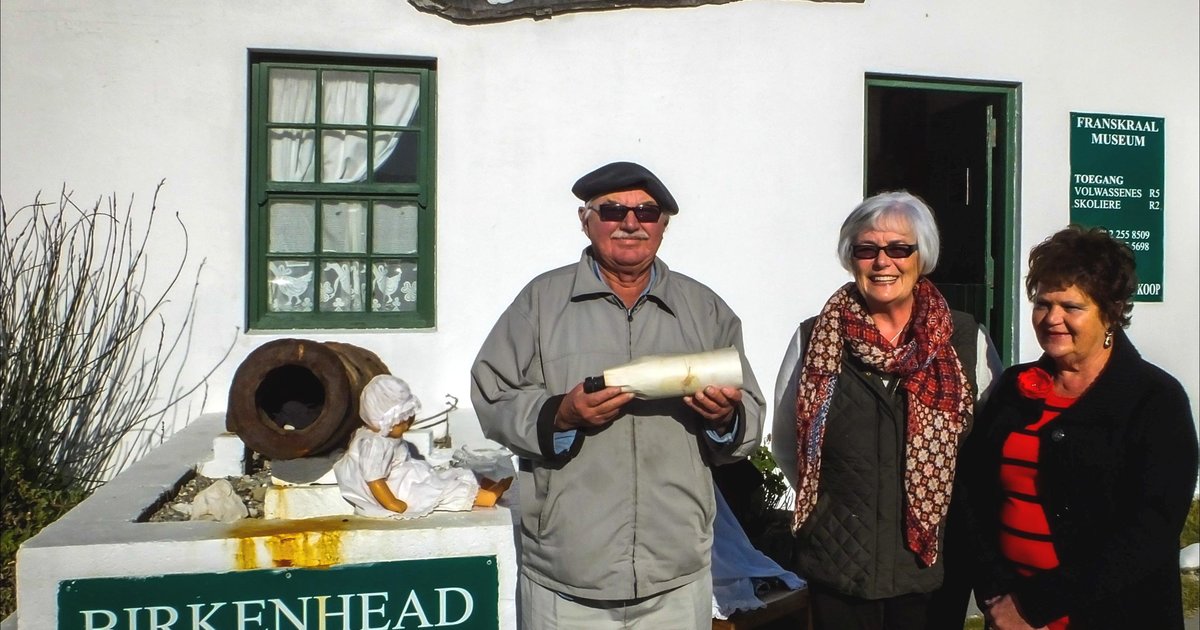 Sy oorhandig toe plegtig ‘n wynbottel, afkomstig van die Birkenhead wrak, aan Jan Fourie, kurator van die plaaslike museum.