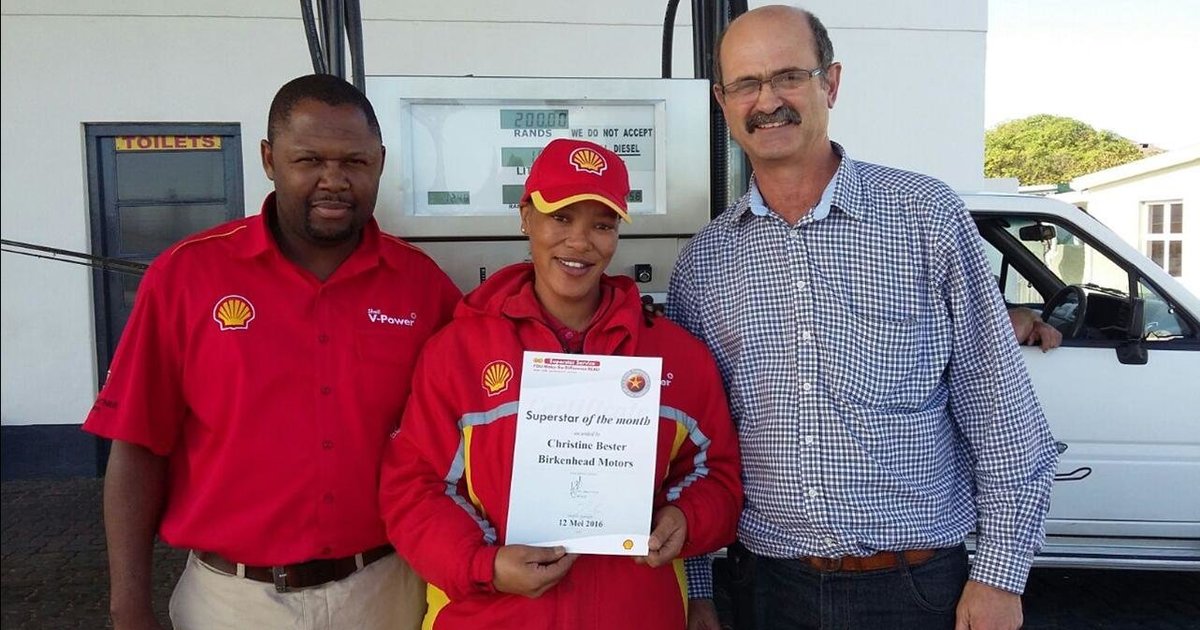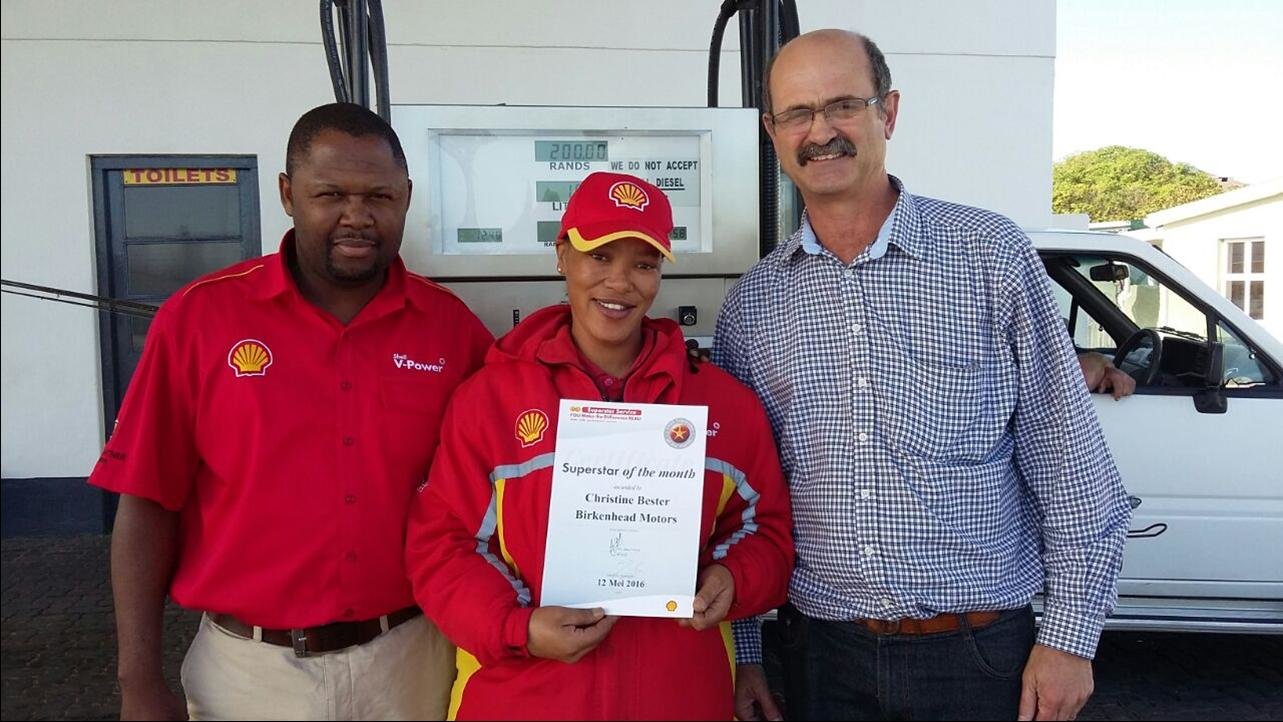 Christine Bester is onlangs aangewys as Birkenhead Motors (Shell) se “Star of the Month”. Sy het die titel verdien nadat die vulstasie ‘n honderd persent uitslag gekry het tydens ‘n bestekopname deur Shell Suid-Afrika. ‘n Onbekende koper besoek die vulstasie vier keer per jaar.