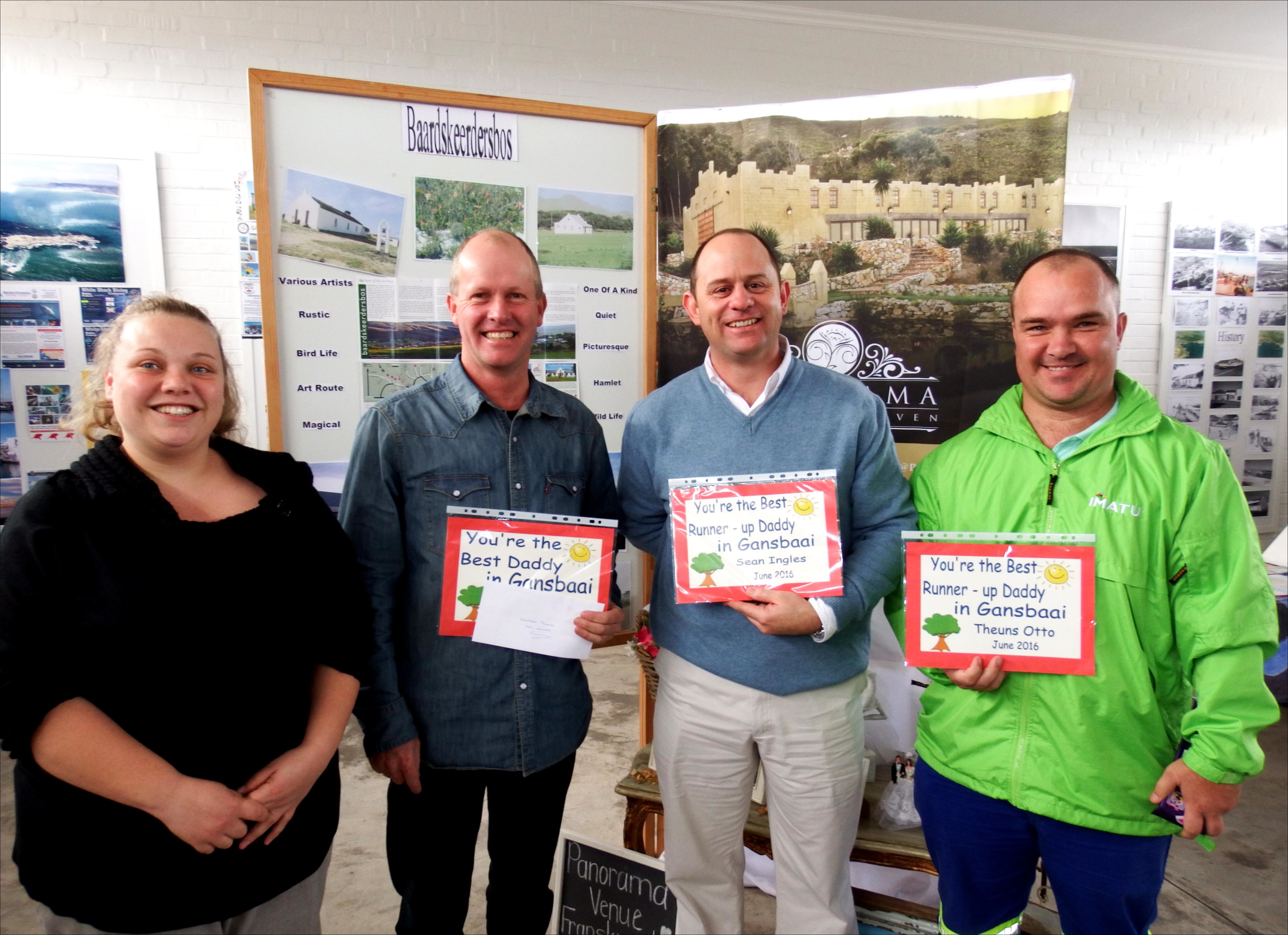 Vlnr is Doulene Els (Gansbaai Toerisme) en Hein van Wyk (wenner) saam met die twee “runner-ups”, Sean Ingles en Theuns Otto.