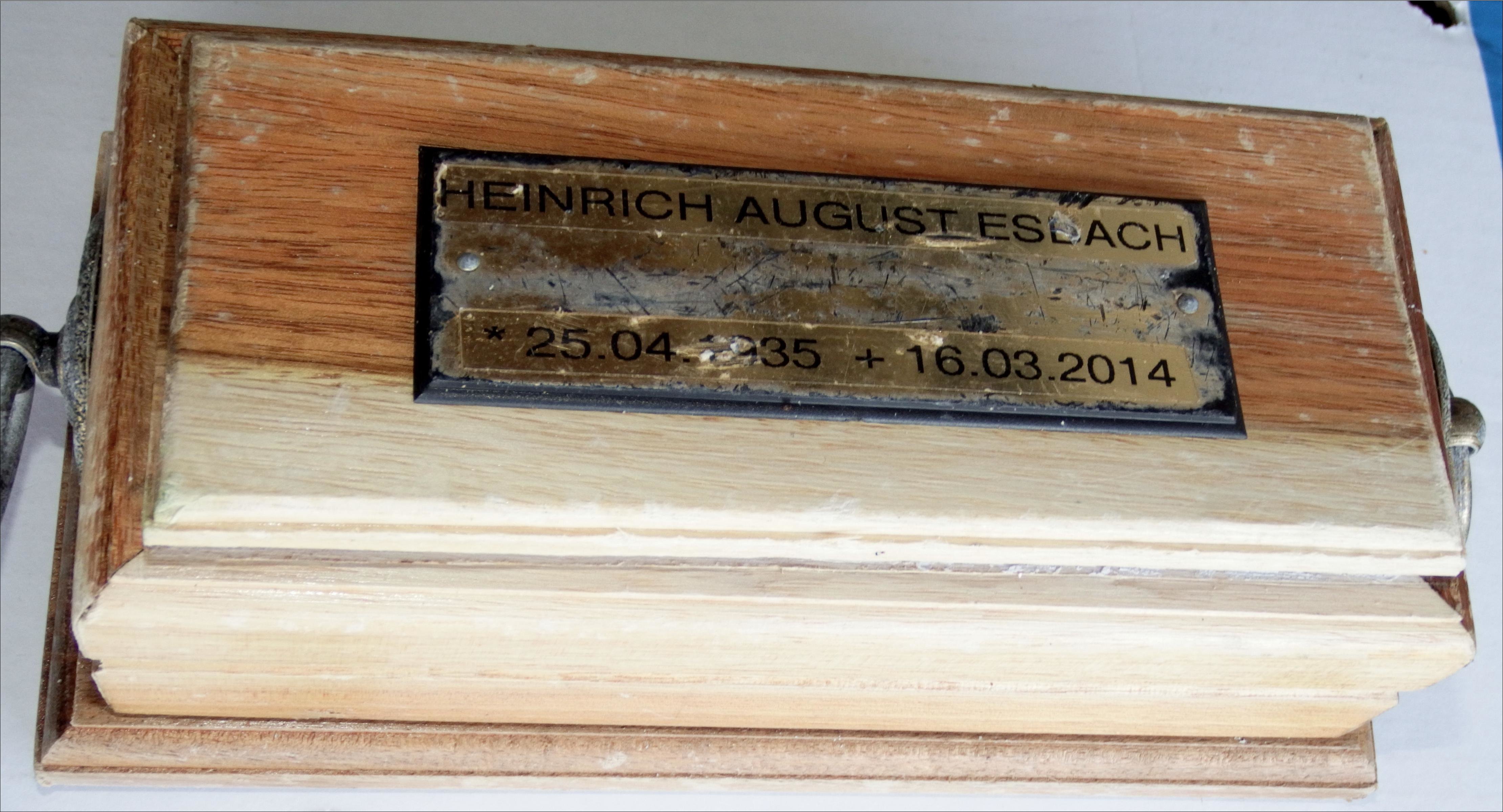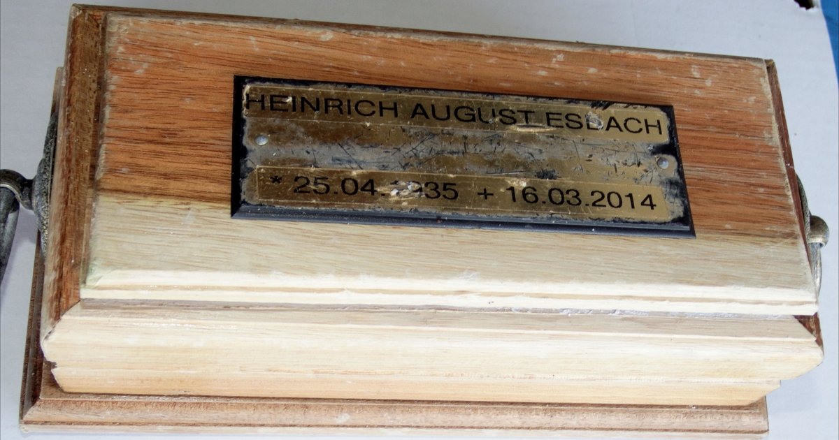 André Franken van Maraisstraat 81, Franskraal het hierdie “Askissie”, waarin ‘n oorledene se as bewaar word, by Blousloep opgetel waar dit uit die see gespoel het. Die oorledene se besonderhede op die kissie is: Heinrich August Esbach, gebore 25 April 1935 en oorlede 16 Maart 2014. Indien familielede sentimentele waarde daaraan heg, kan André by 082-378-6294 geskakel word.
