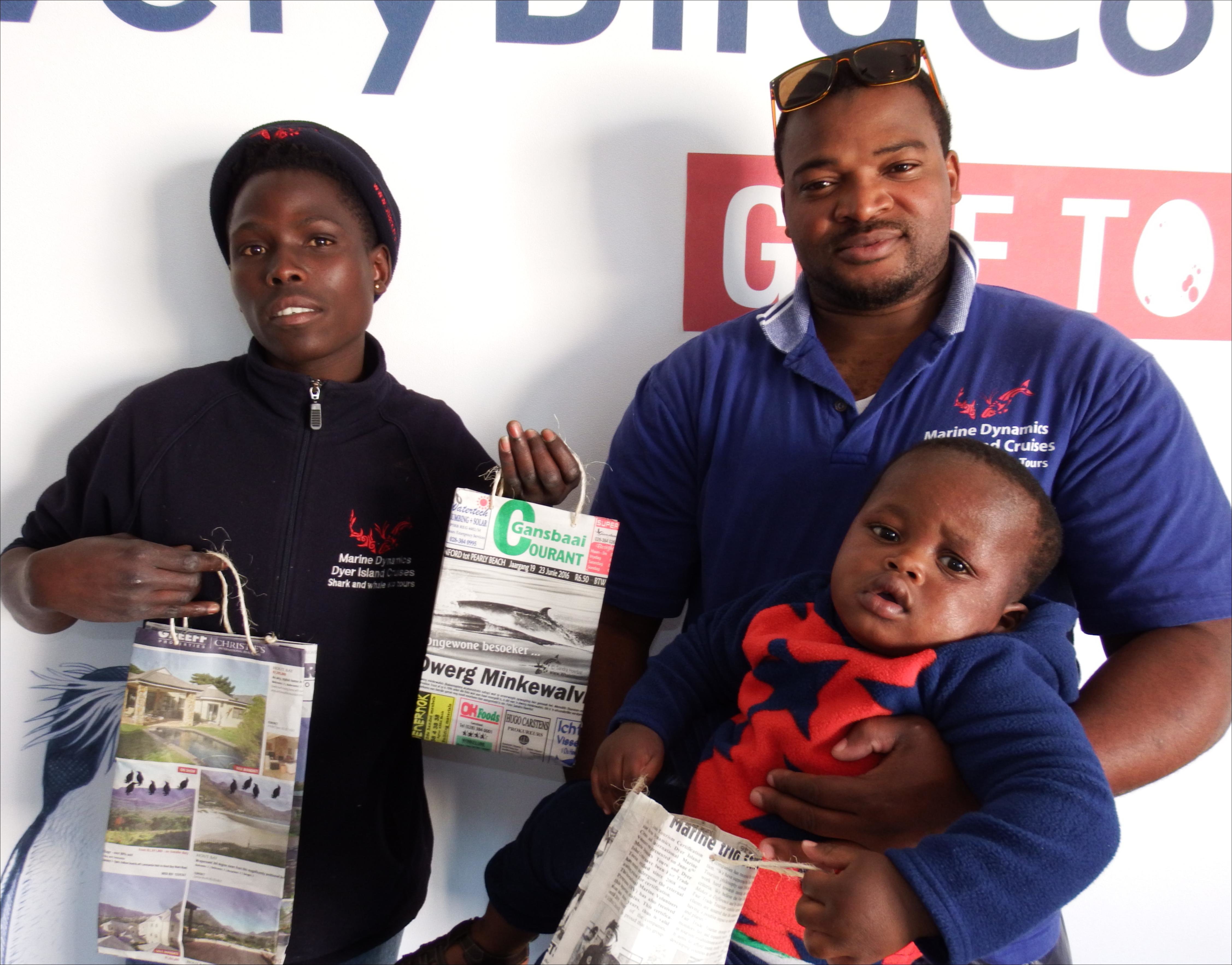 Hy het een van sy werknemers van die African Penguin & Seabird Sanctuary (APSS), Njongo Mlimisi aangesê om met die maak van papierinkopiesakkies te begin. Nie net word Gansbaai Courant se ou koerante vir die doel ingespan nie, maar enige rondlê of weggooikoerant word gevou en geplak vir ‘n tweede doel op ons kosbare aarde – die van ‘n eko-vriendelike inkopiesakkie.